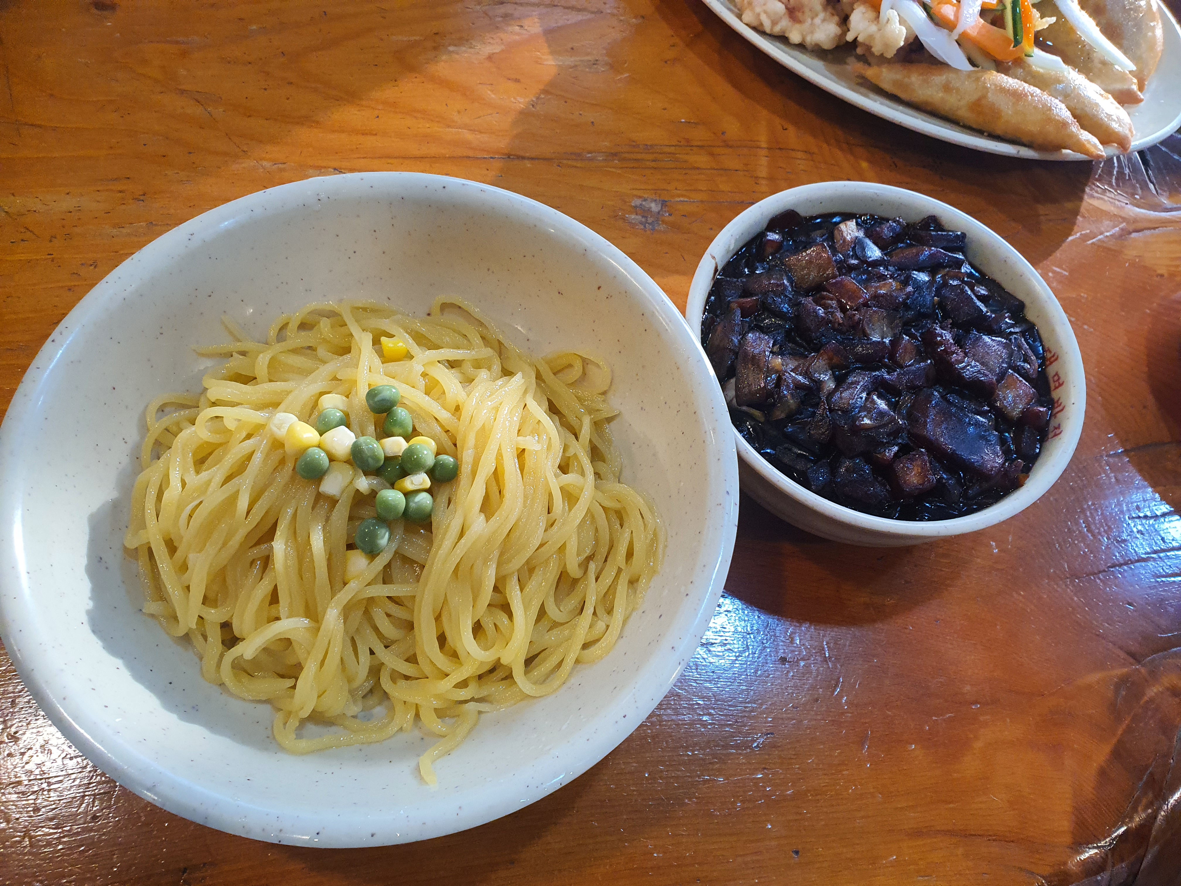 면위에 완두콩과 옥수수 알갱이가 들어 있어 옛날에 어렸을때 먹었던 짜장면의 비주얼입니다. ㅎㅎ
