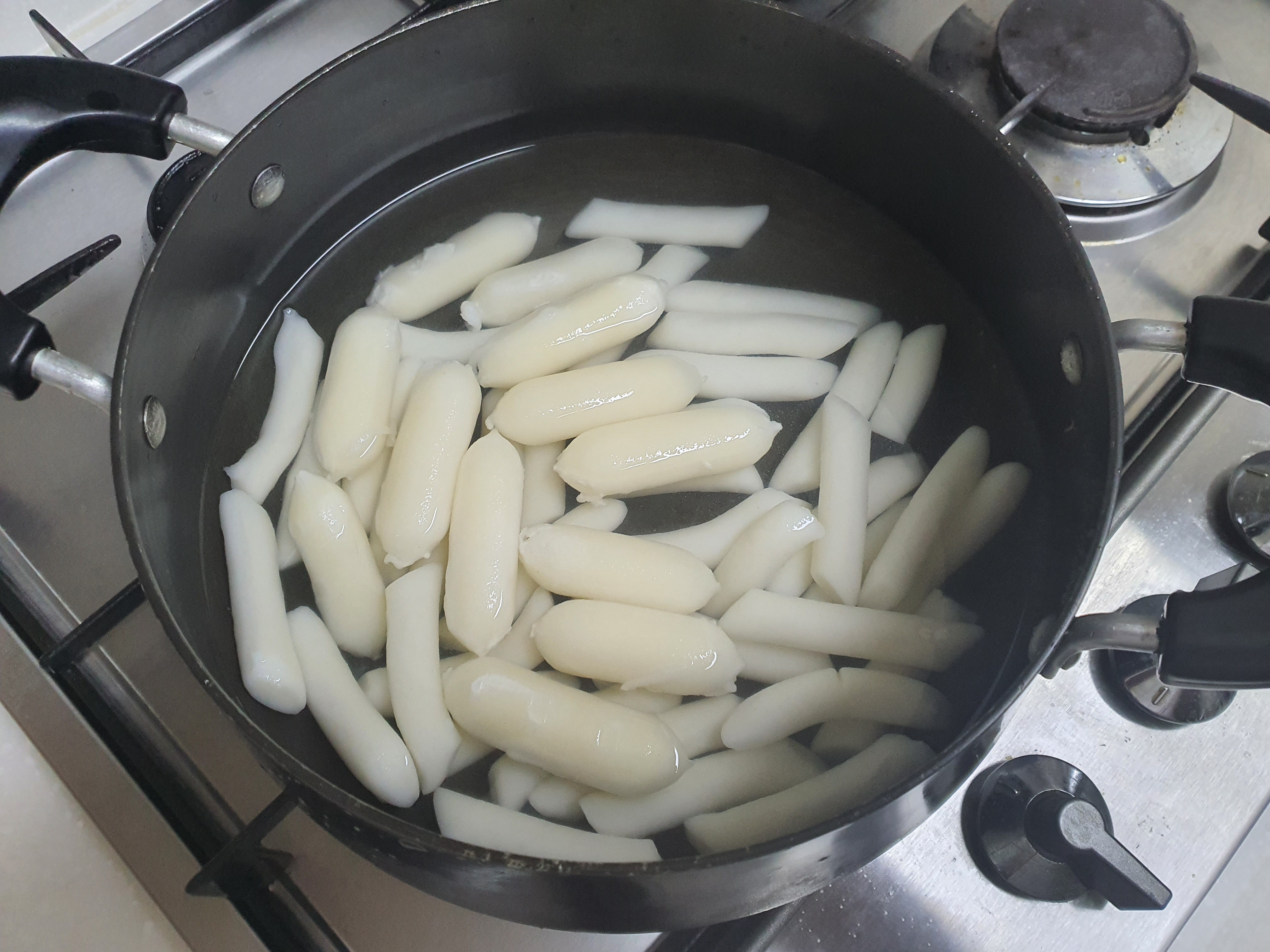 1. 우선 떡을 흐르는 물에 한번 씻겨 줍니다. 그리고 떡이 잠길정도로 물을 담아 놓습니다. 15분정도 담근 담에 해야 떡이 부드럽고 식감이 딱 좋습니다.