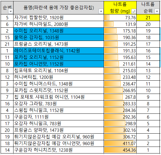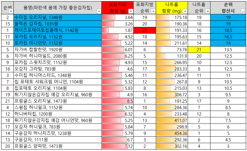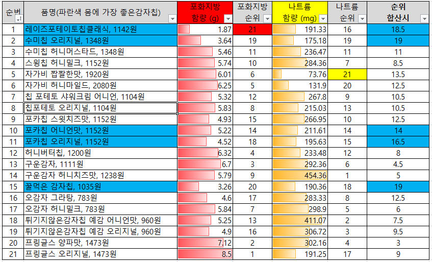 건강한 감자칩의 순위를 매길려고, 감자칩의 포화지방 함량과 나트륨함량을 섞어서 어떤게