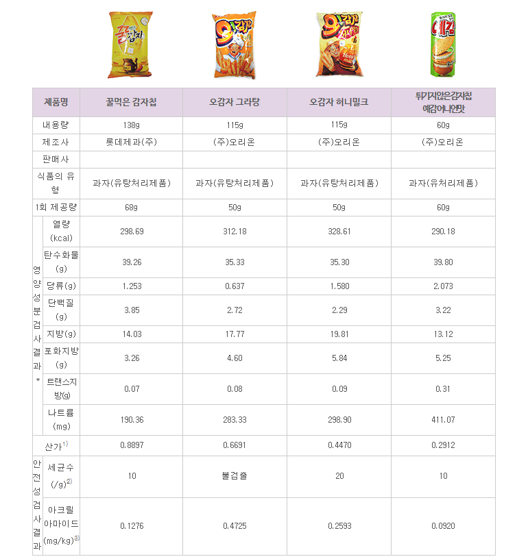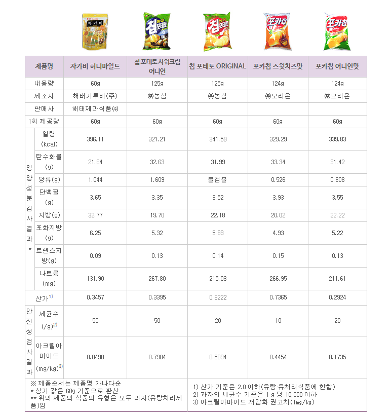 3. 감자칩 제품별 특징 (아래값은 60그램 기준으로 환산값)