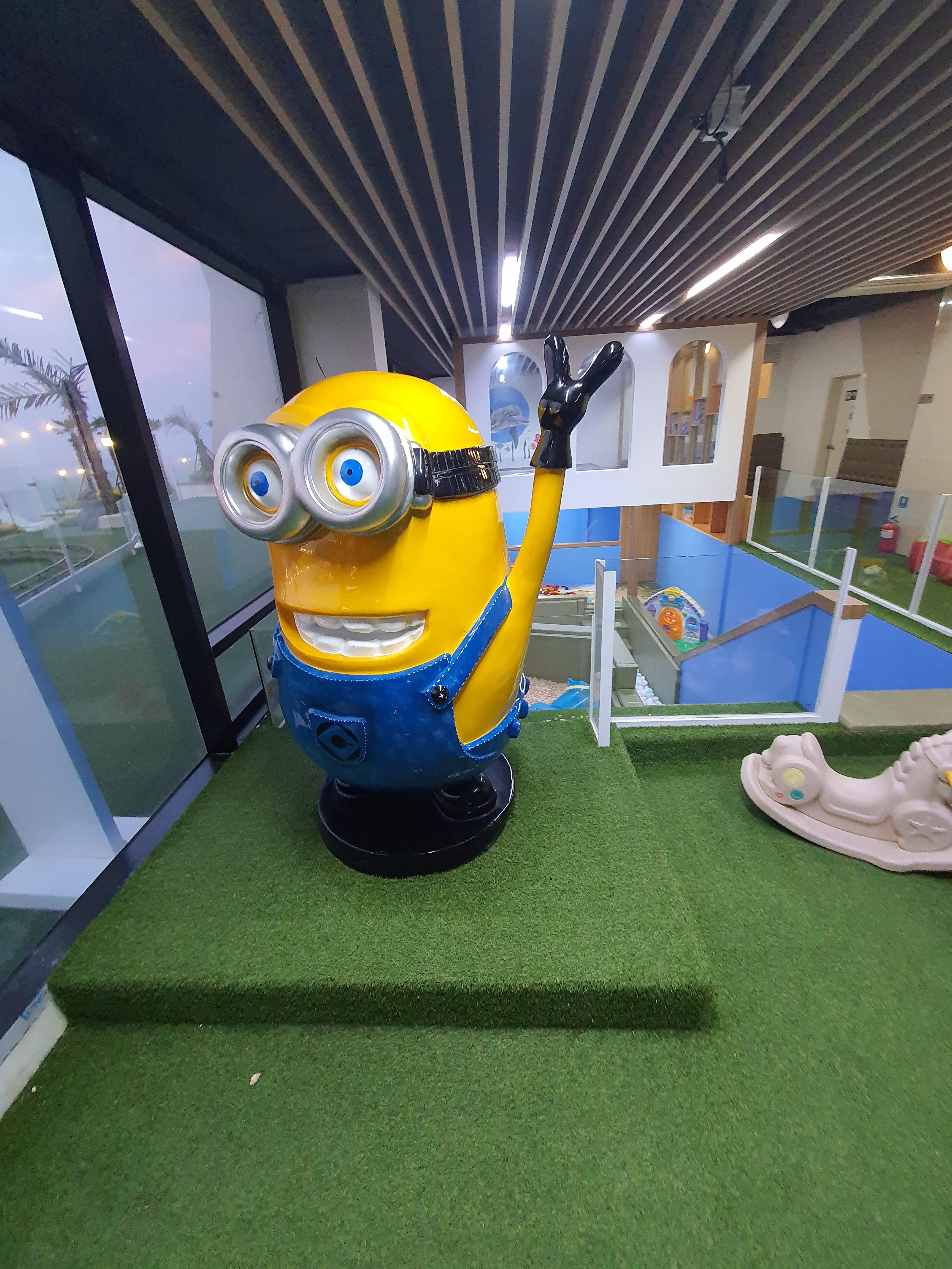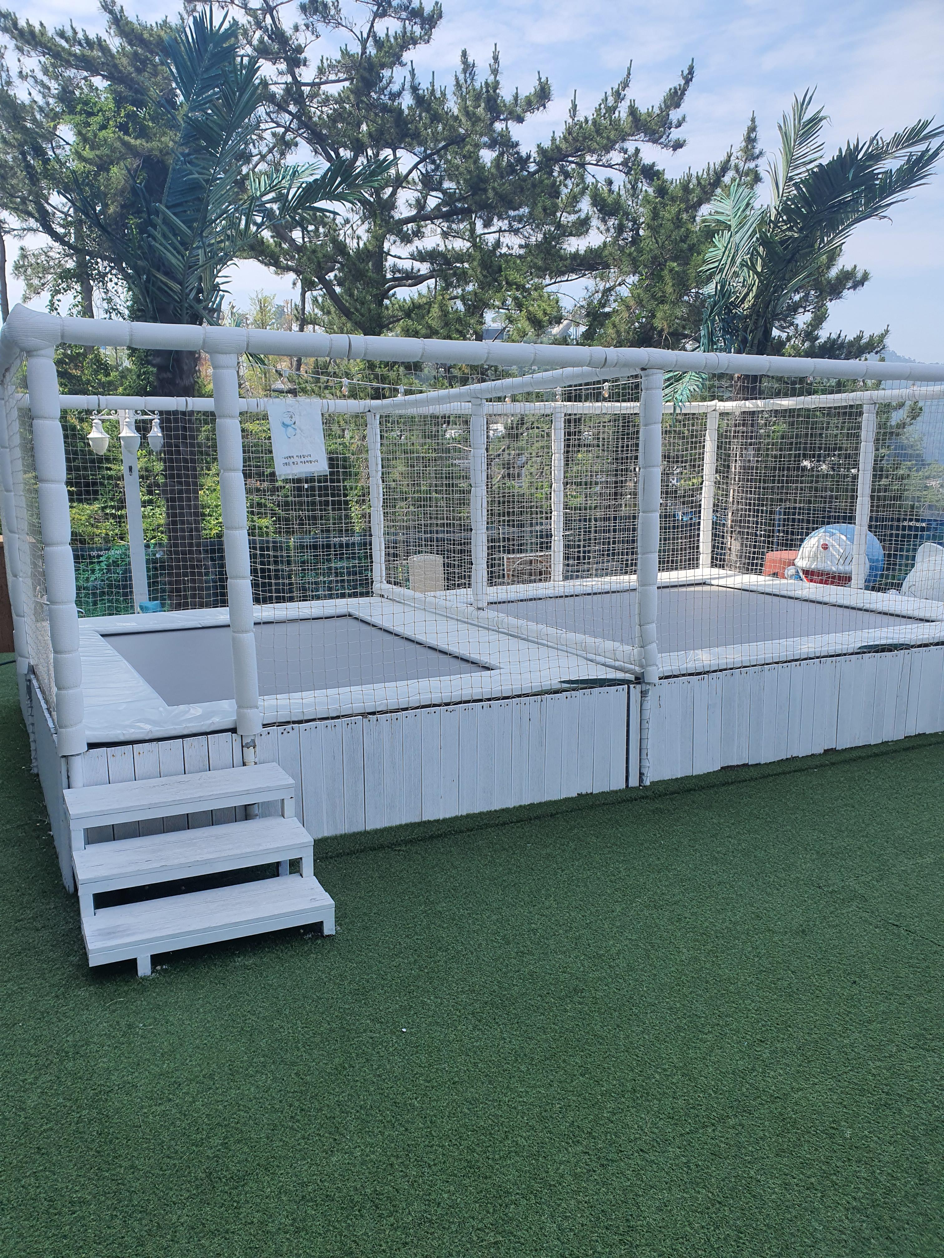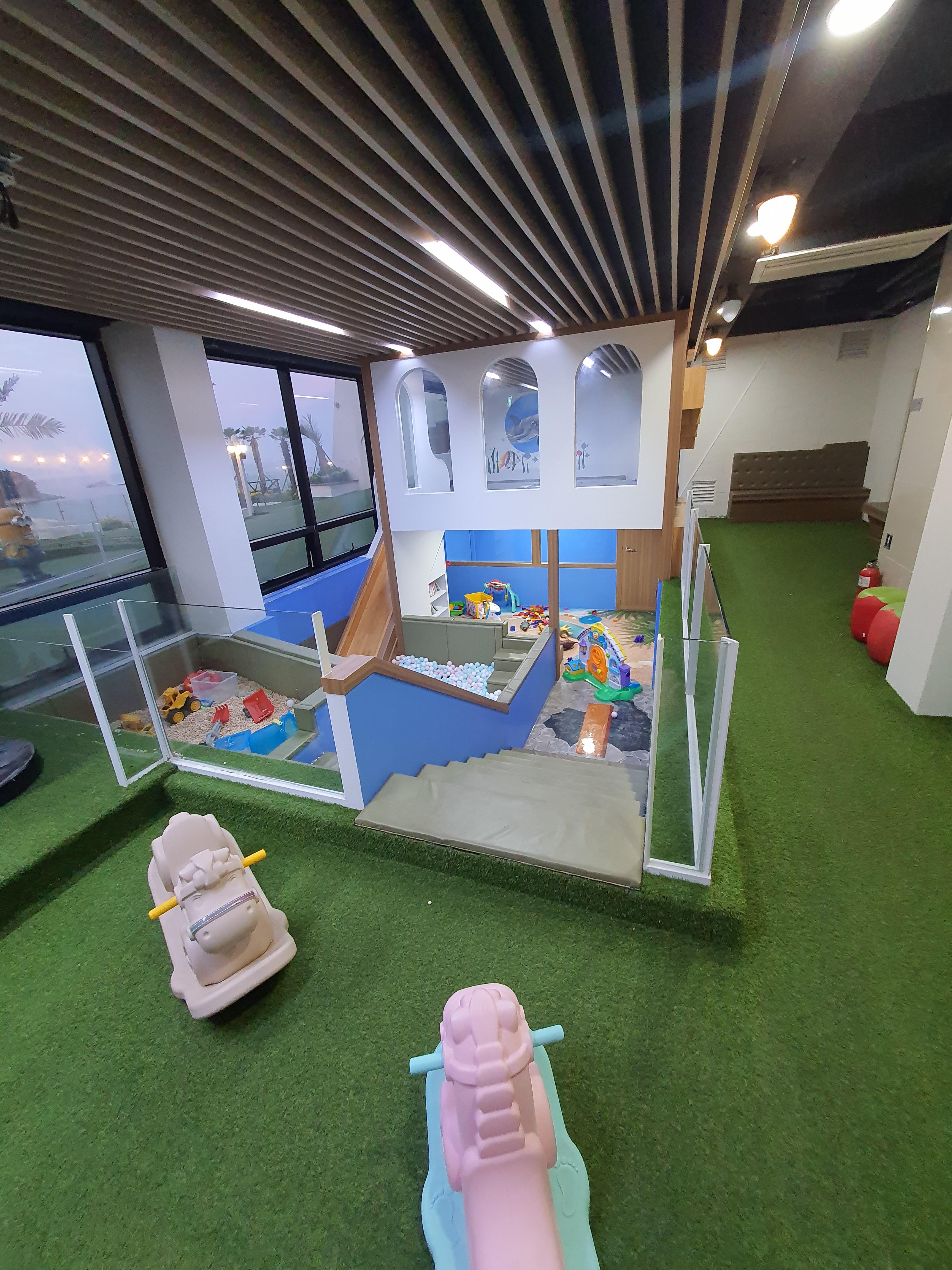 여수하이클래스 153 풀빌라 같은 경우는 아이들이 놀 수 있는 공간들을 많이 배려 하면서 만들어 놨어요 키즈카페도 있고요 그 옆에 방방 뛸 수 있는 트램펄린 시설도 있고요 그 앞에 탈 수는 없는 기차가 하나 있습니다.