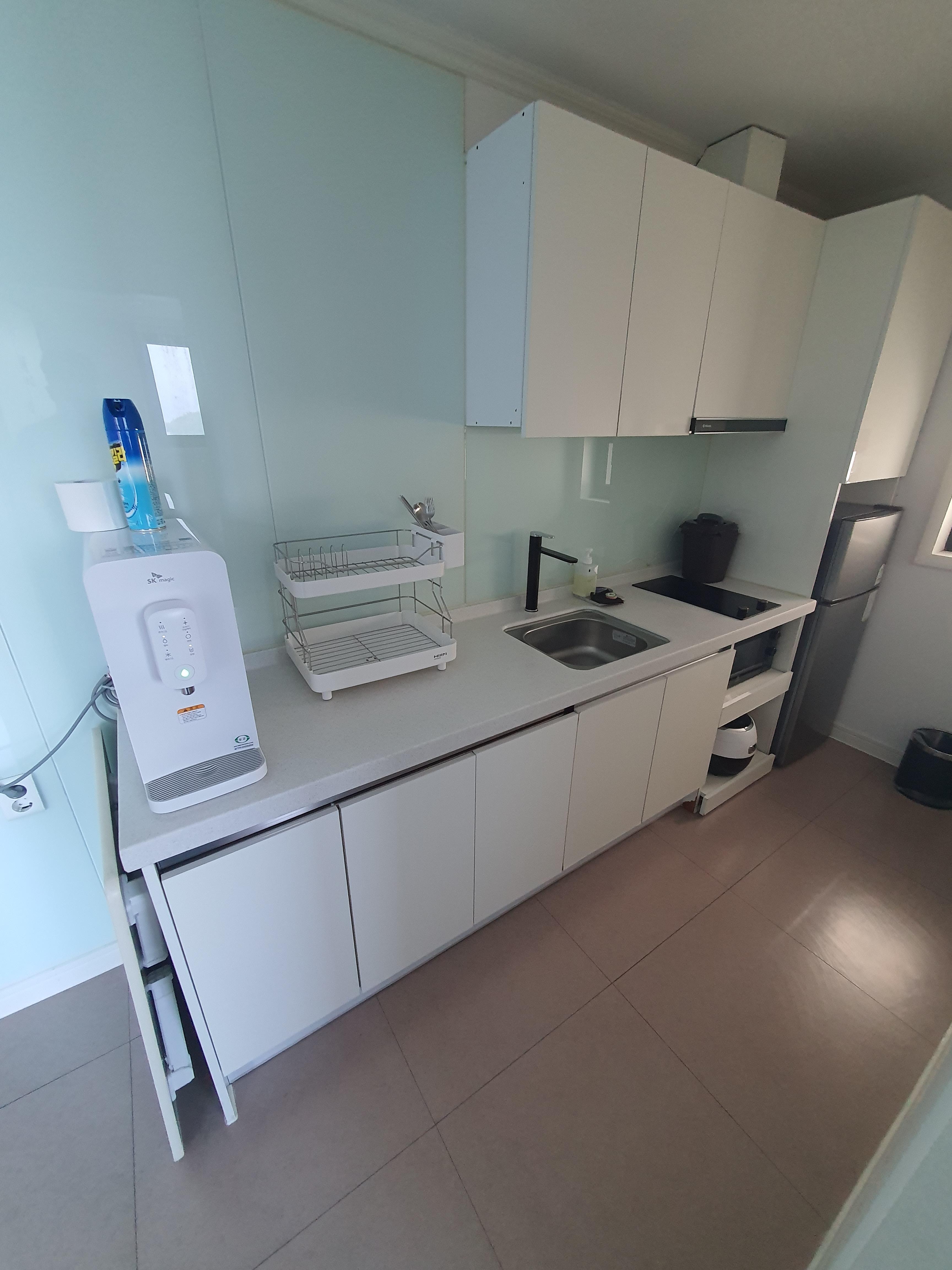 주방엔 정수기랑 냉장고 밥솥 잘 구비되어 있습니다.