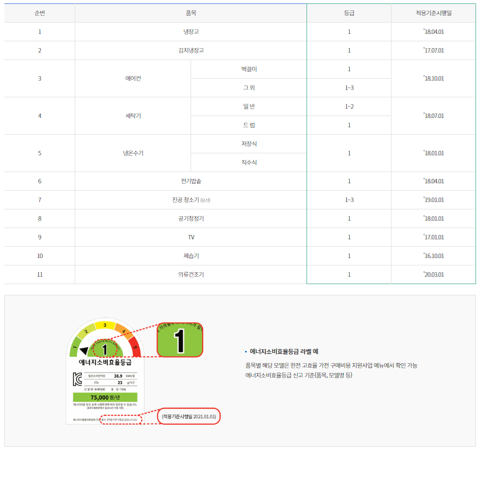 에너지소비효율등급 라벨 예 품목별 해당 모델은 한전 고효율 가전 구매비용 지원사업 메뉴에서 확인 가능 에너지소비효율등급 신고 기준(품목, 모델명 등)