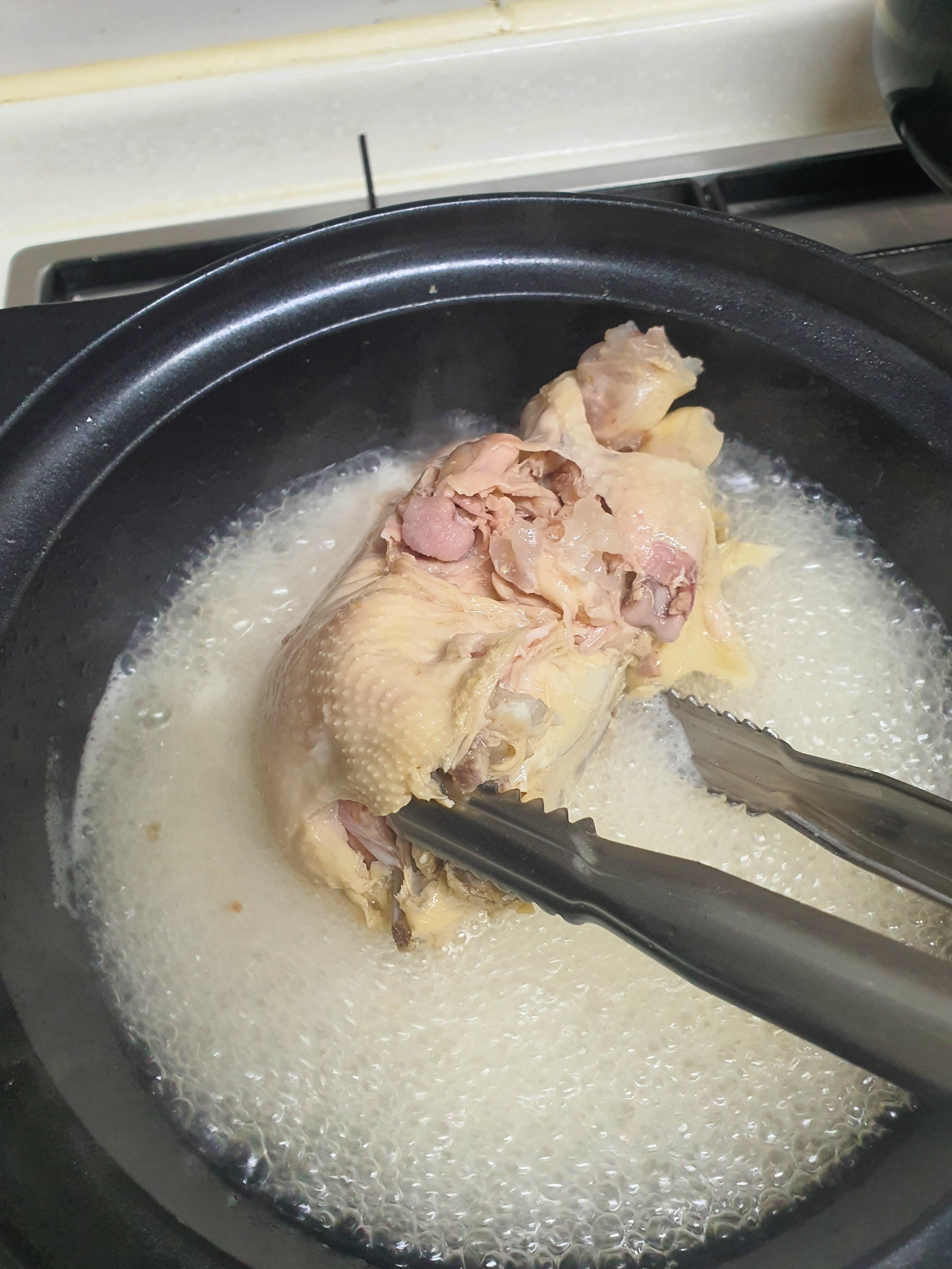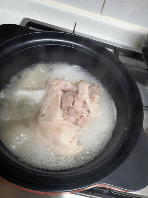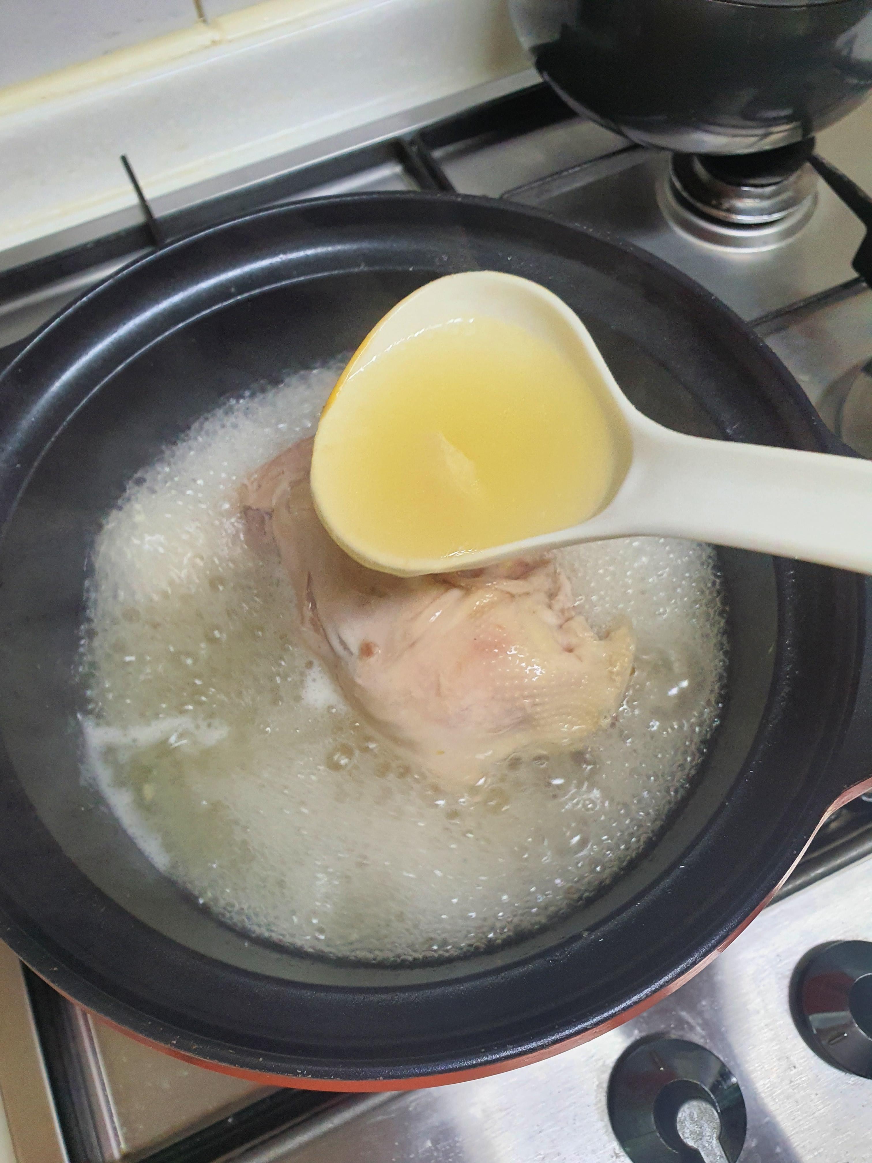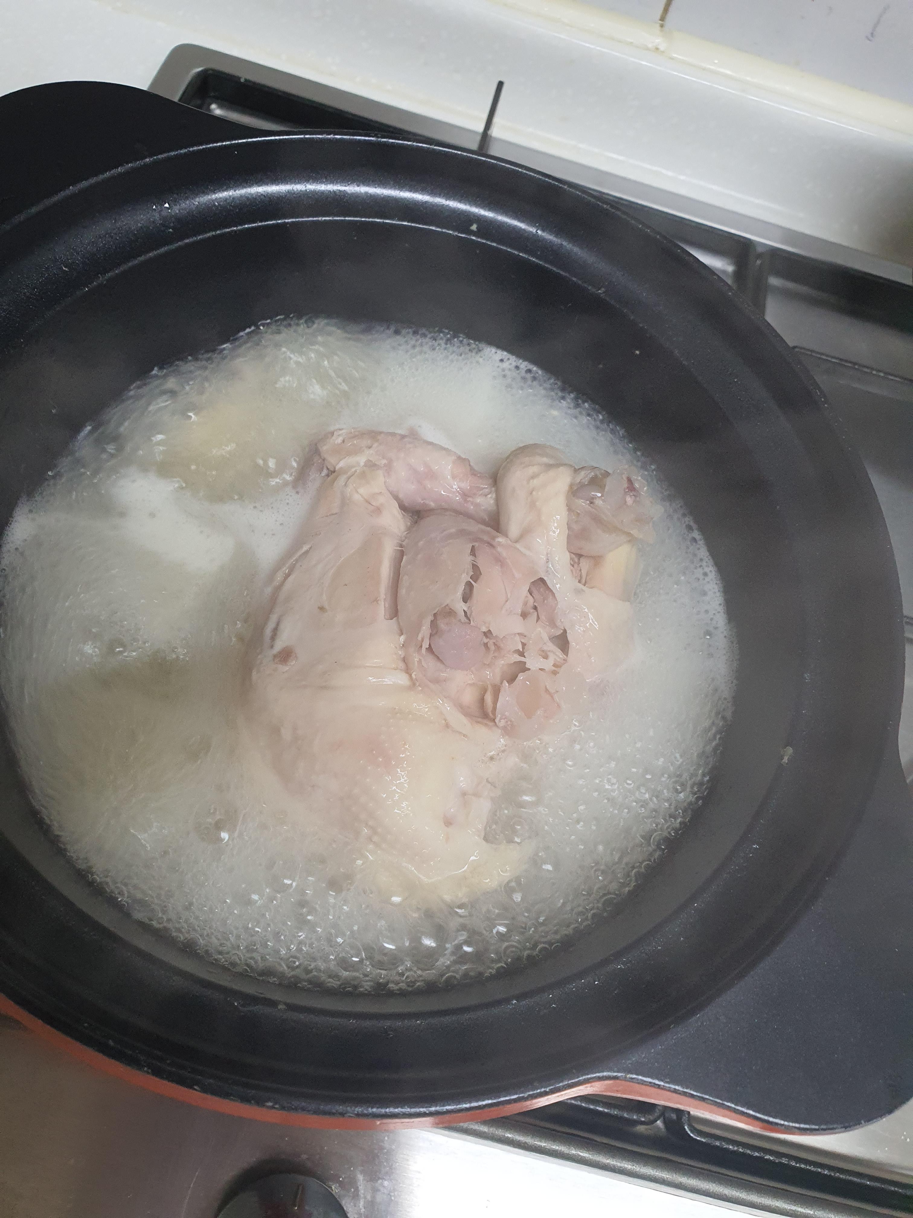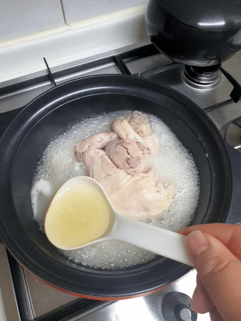 끓이면서 국자로 10번정도 닭고기 위에 육수를 올려 줬다.