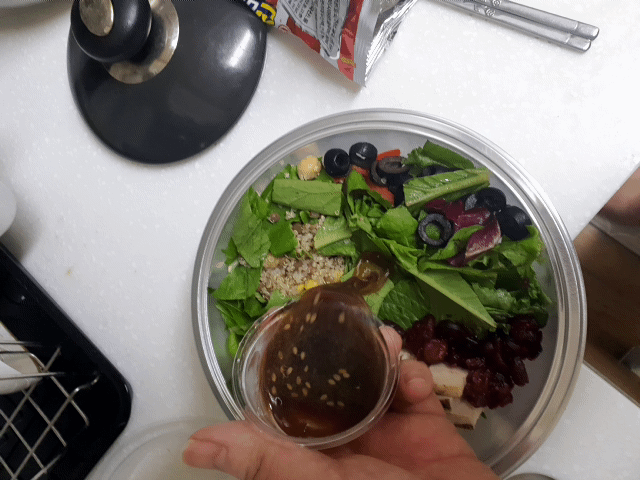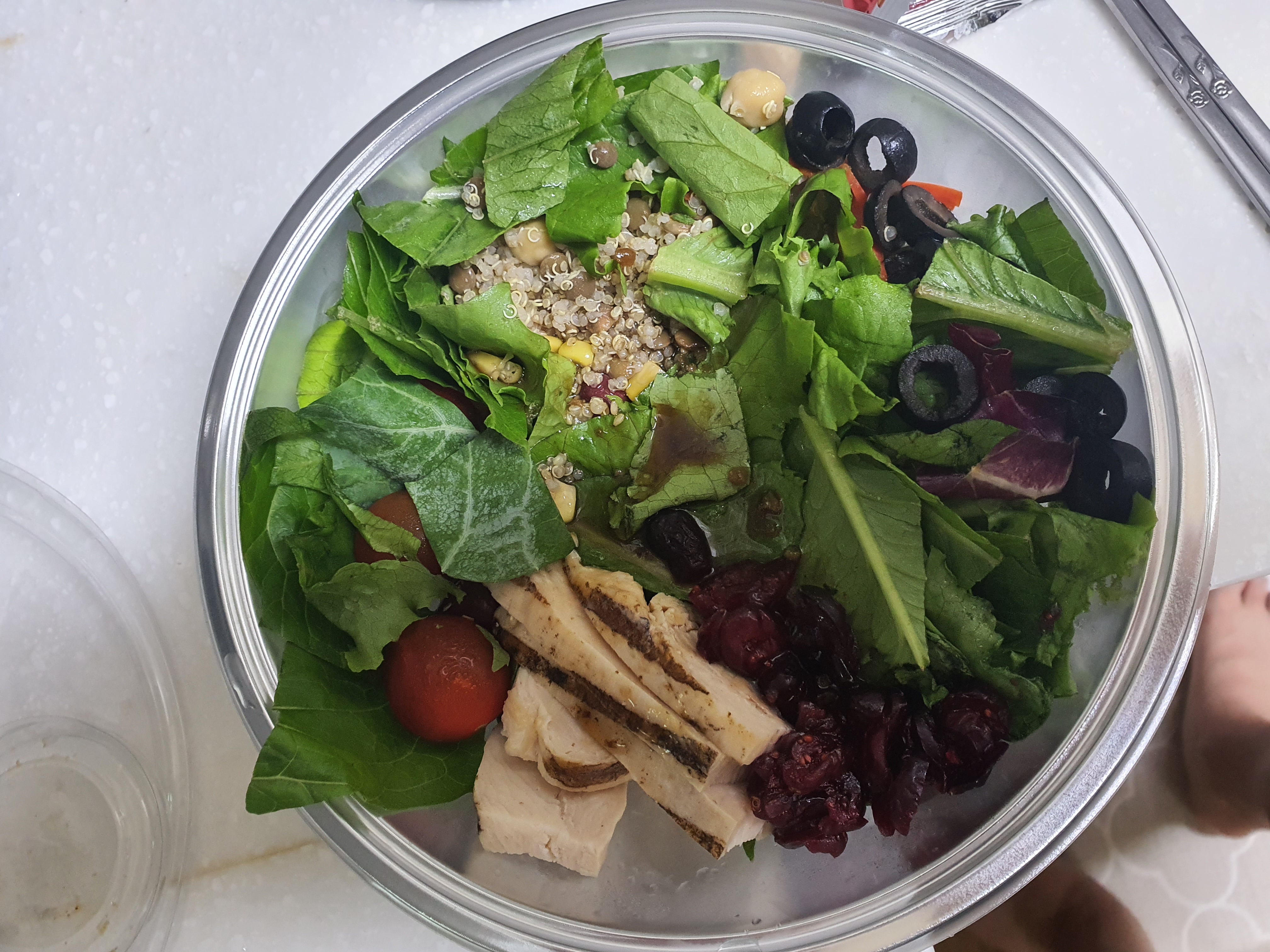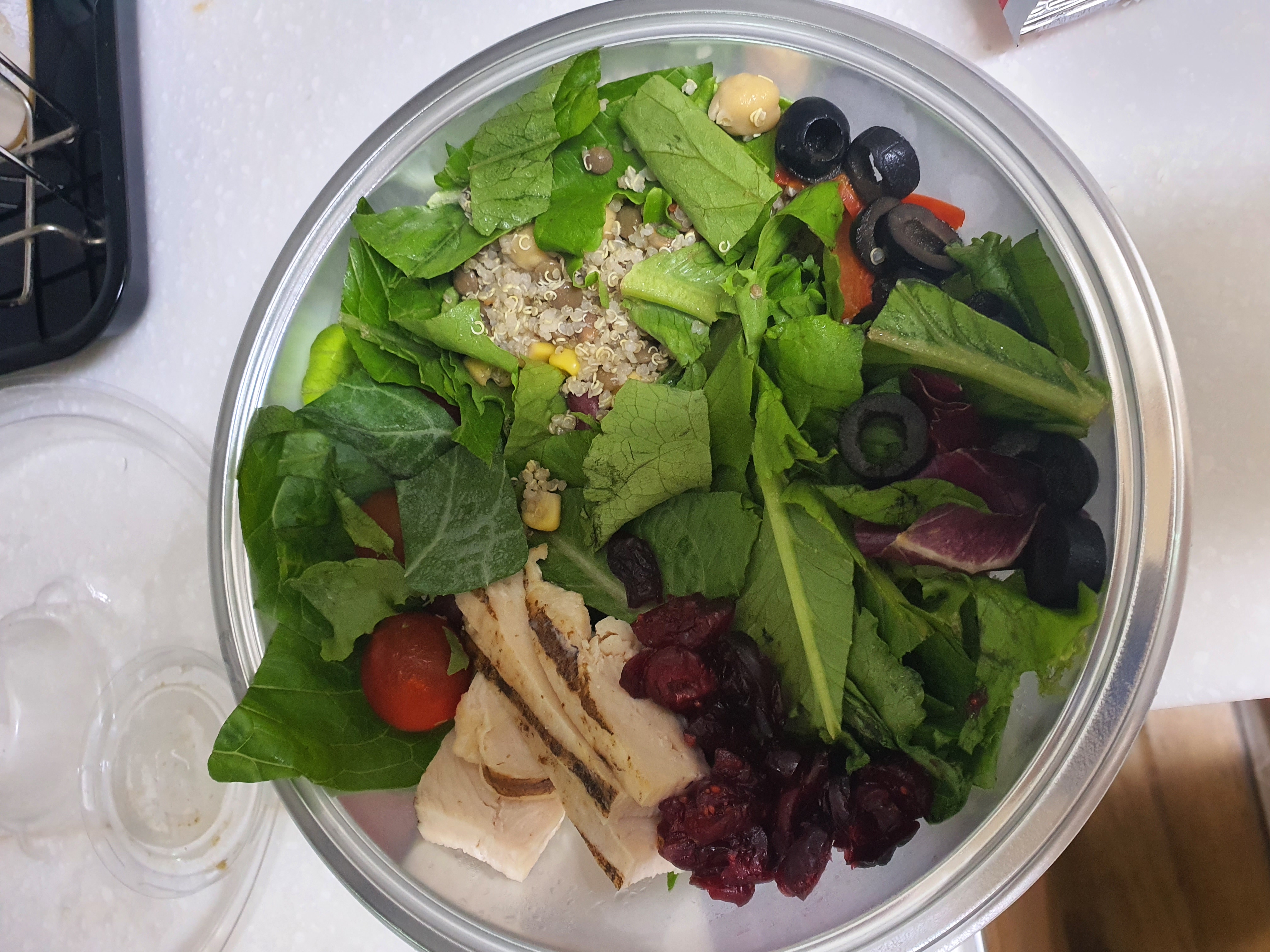 각종야채와 퀴노아, 닭가슴살구이, 크랜베리, 블랙올리브, 파프리카 이렇게 들어가 있는데..