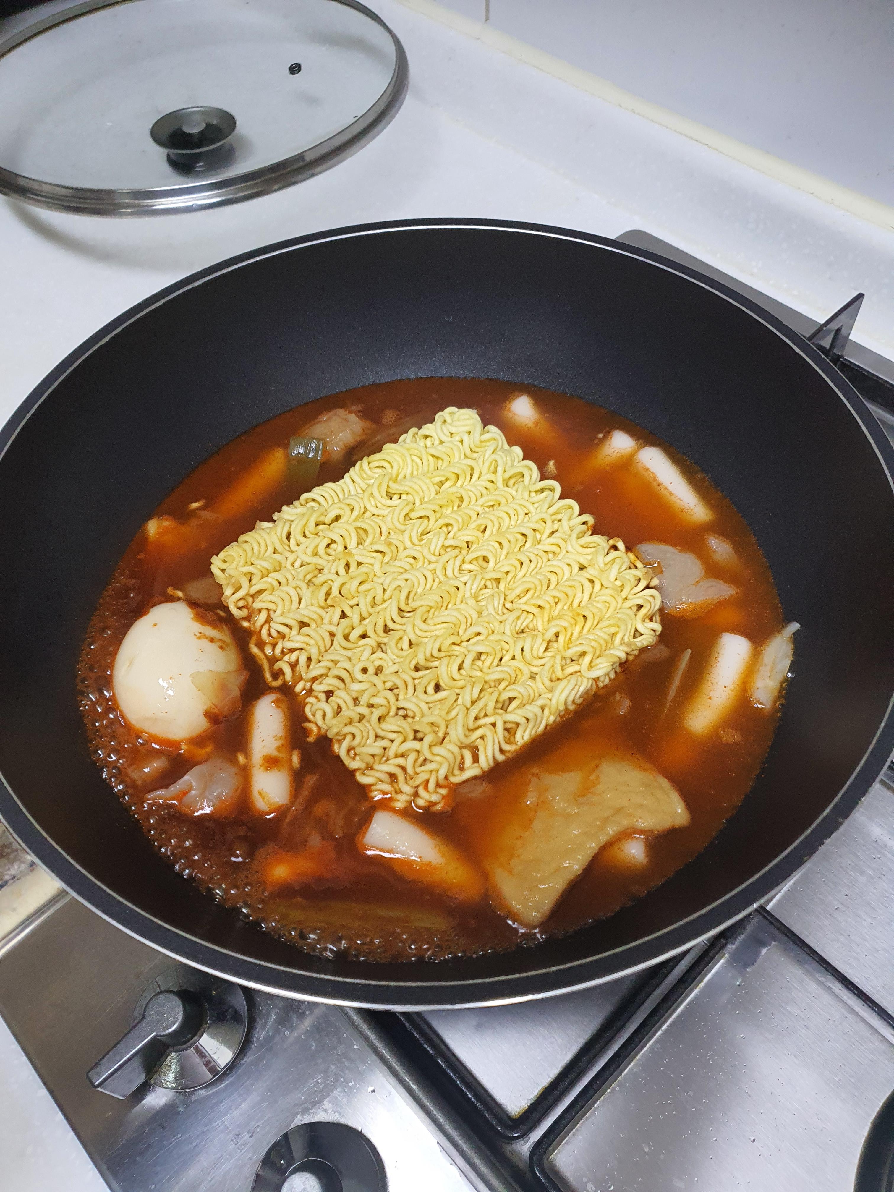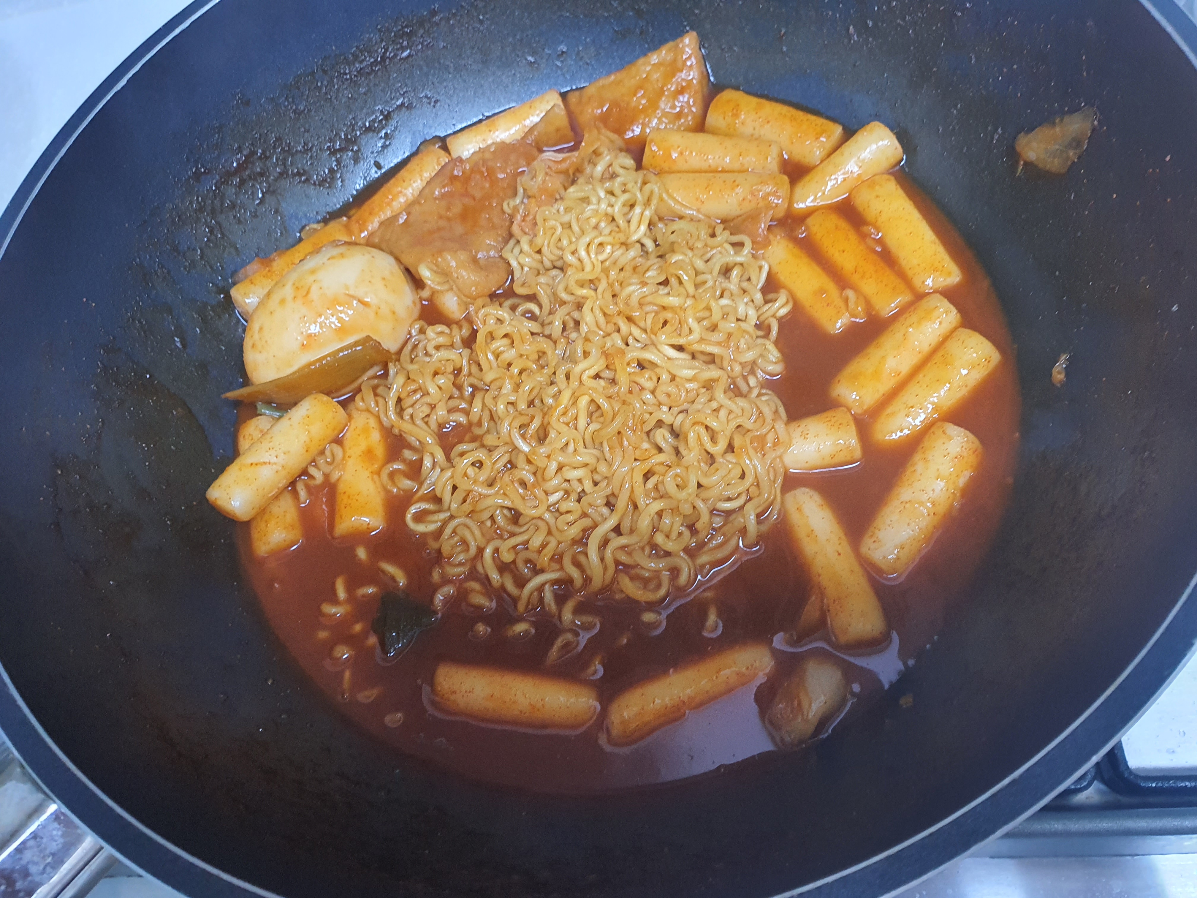 떡볶이가 그러면 육수를 국자를 이용해서면 위에다가 조금 조금씩 부어 주세요 그러면 면이 부르지도 않고 빨리 익어서 떡볶이를 더 빨리 맛있게 먹을 수 있습니다.
