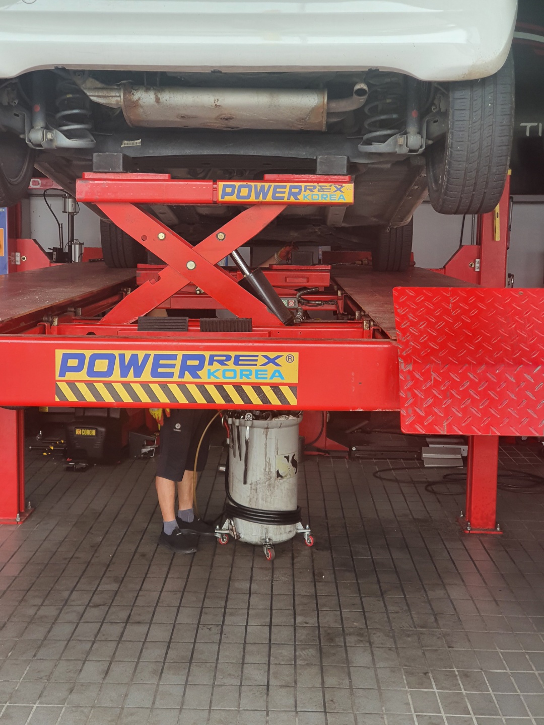 기존 엔진오일을 드레인 방식으로 빼내는데.. 드레인을 할때도, 차량을 최대한 기울여서 드레인을 합니다.
