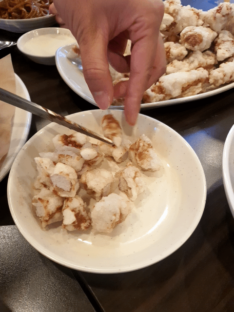 동글동글 한데 엄지 손가락 두께정도 이며, 쫄깃 바삭한 스타일입니다. 튀김색이 하얀 색이면 딱 느껴지죠?!