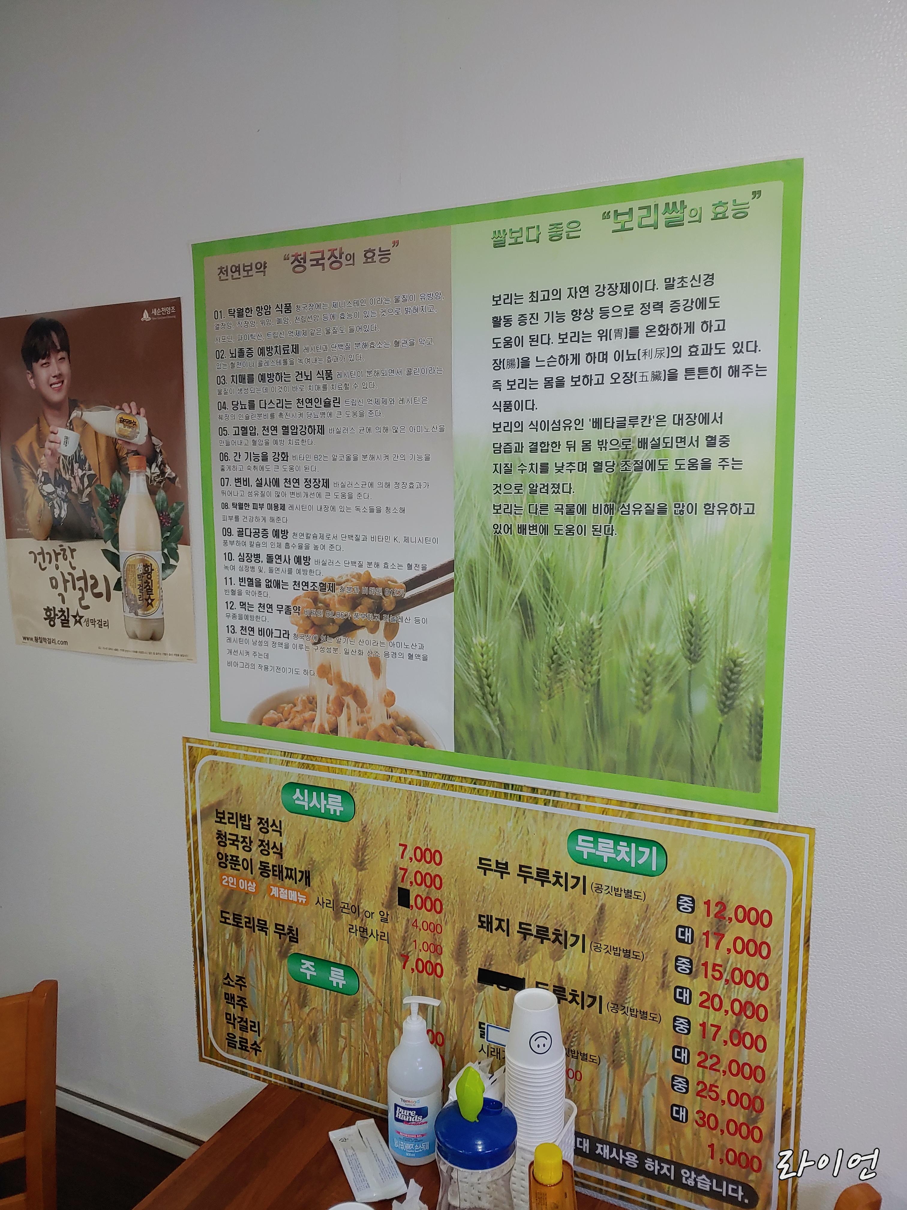 가격을 보면 보리밥 정식 7,000원 청국장 정식 7,000원 그리고 동태 찌개 정식 7,000원인 거 같은데 동태찌개는 계절 메뉴라서 현재 알고 있지 않습니다 지금은 여름입니다 8월