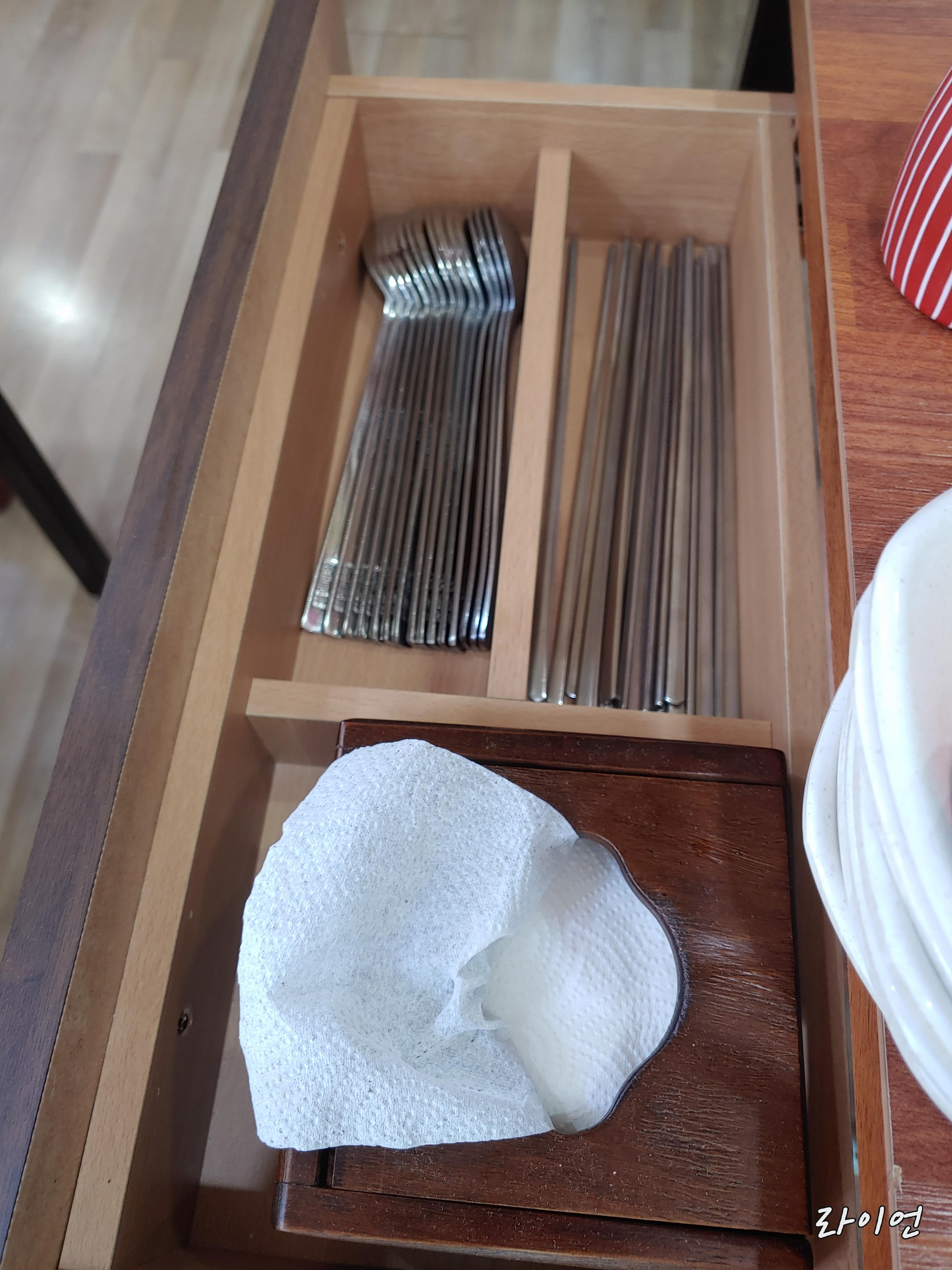 수저와 젓가락은 테이블 왼쪽에 서랍식으로 놓여져 있습니다.