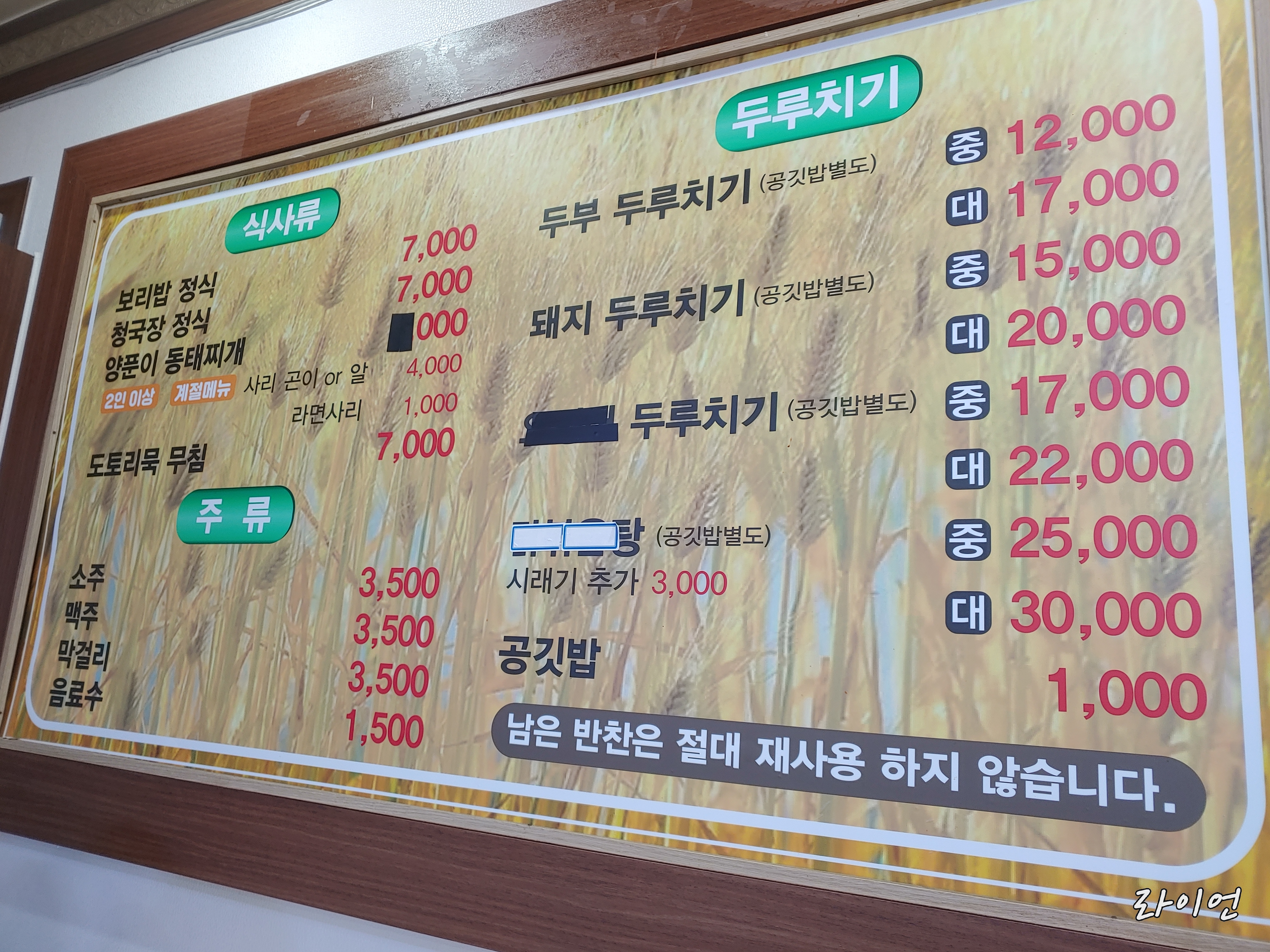 가격은 보리밥정식 또 7,000원 청국장정식 또 7,000원 양푼이 동태찌개도 7,000원인 거 같은데..