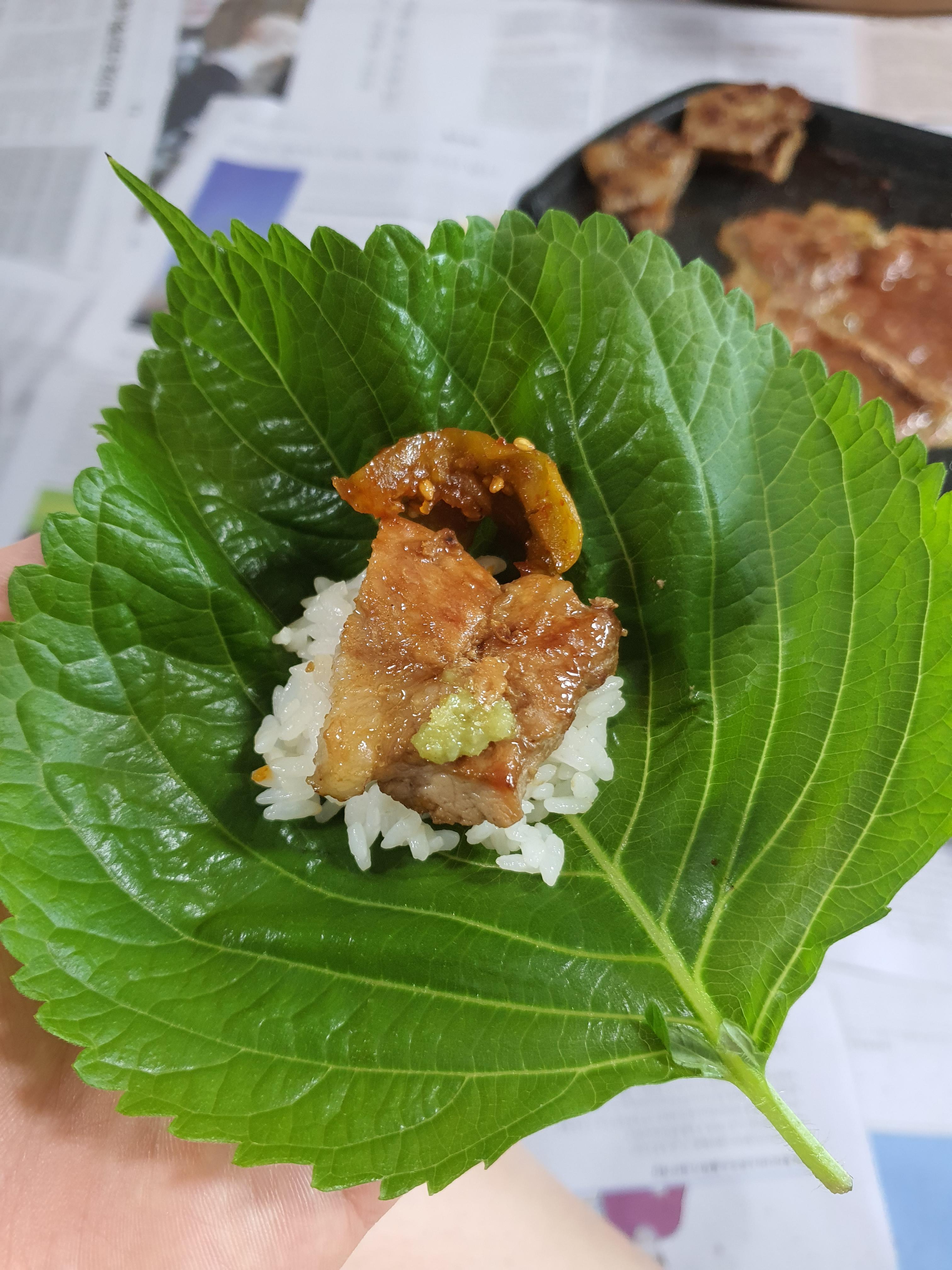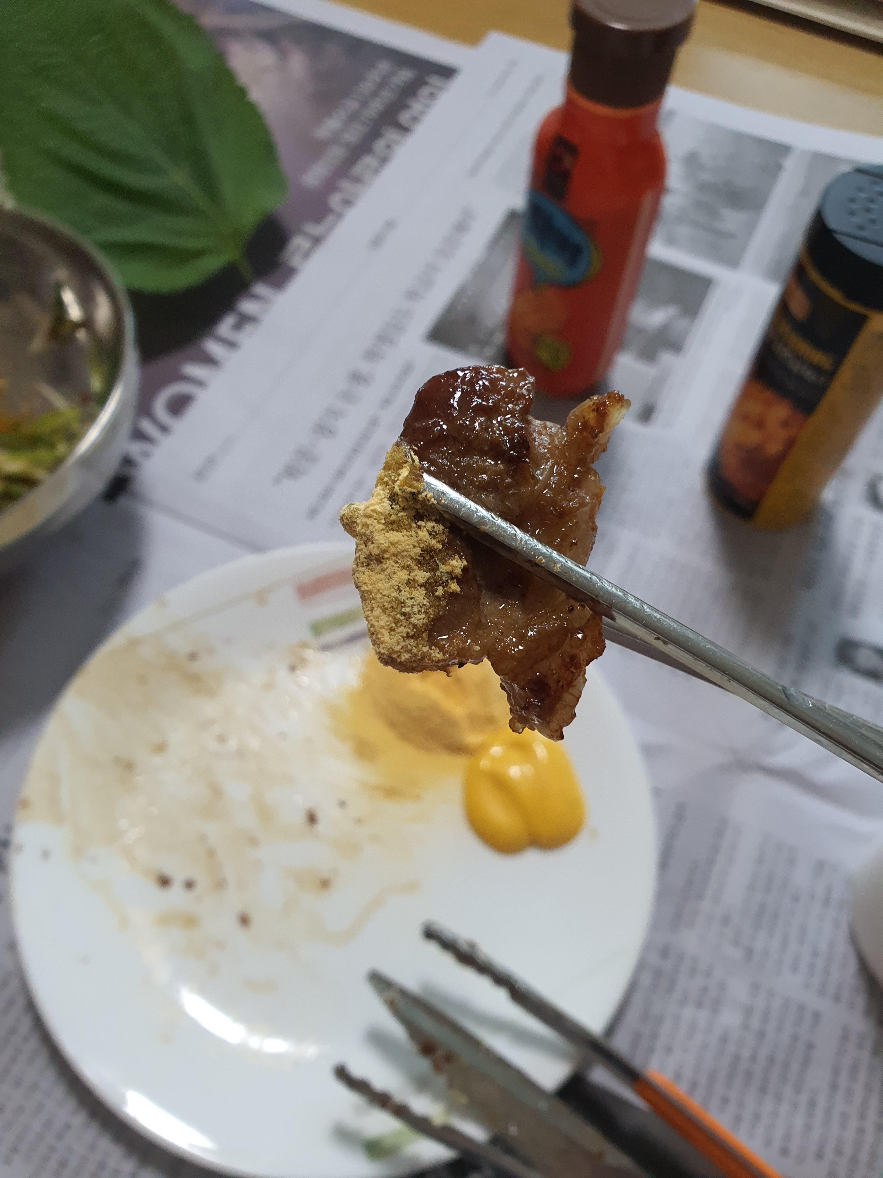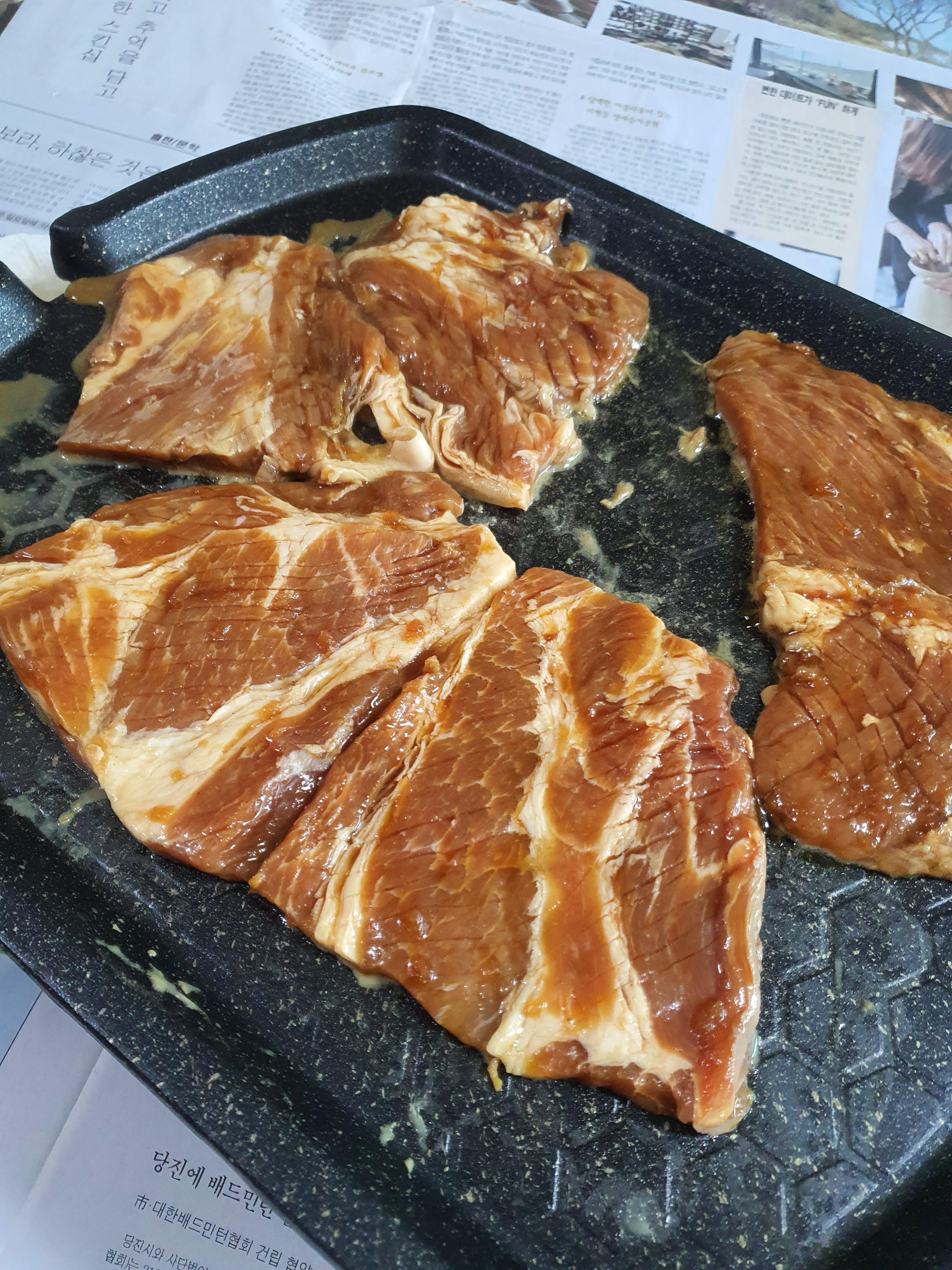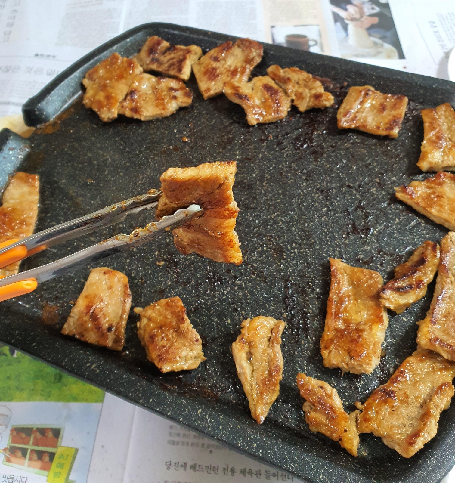 보튬 정육점에서 구매한 돼지갈비가 거의 다 익었습니다 아이들이 고기 달라고 재촉합니다 냄새가 끝내주네요 아랫집 윗집한테 조금 미안 합니다.