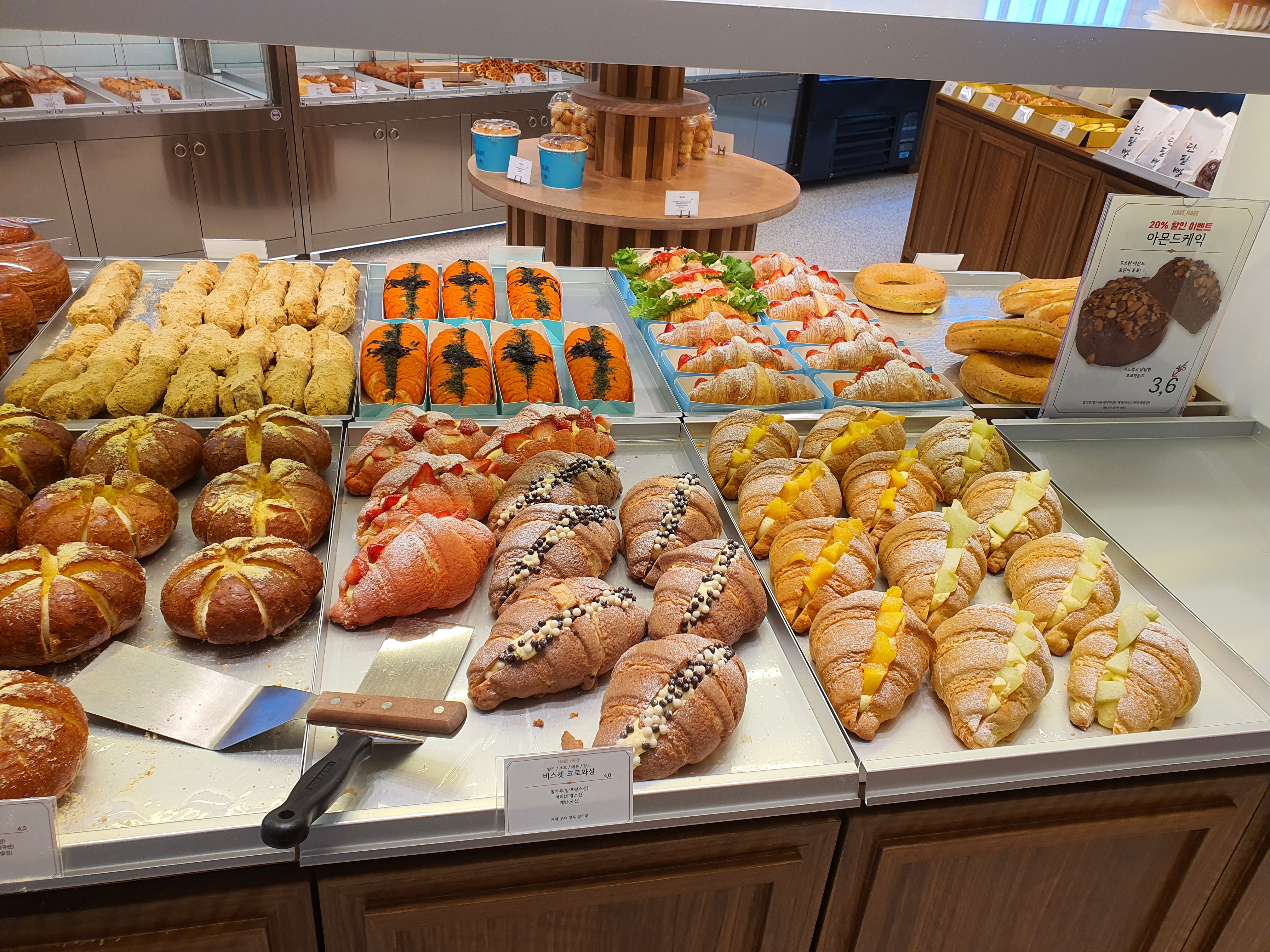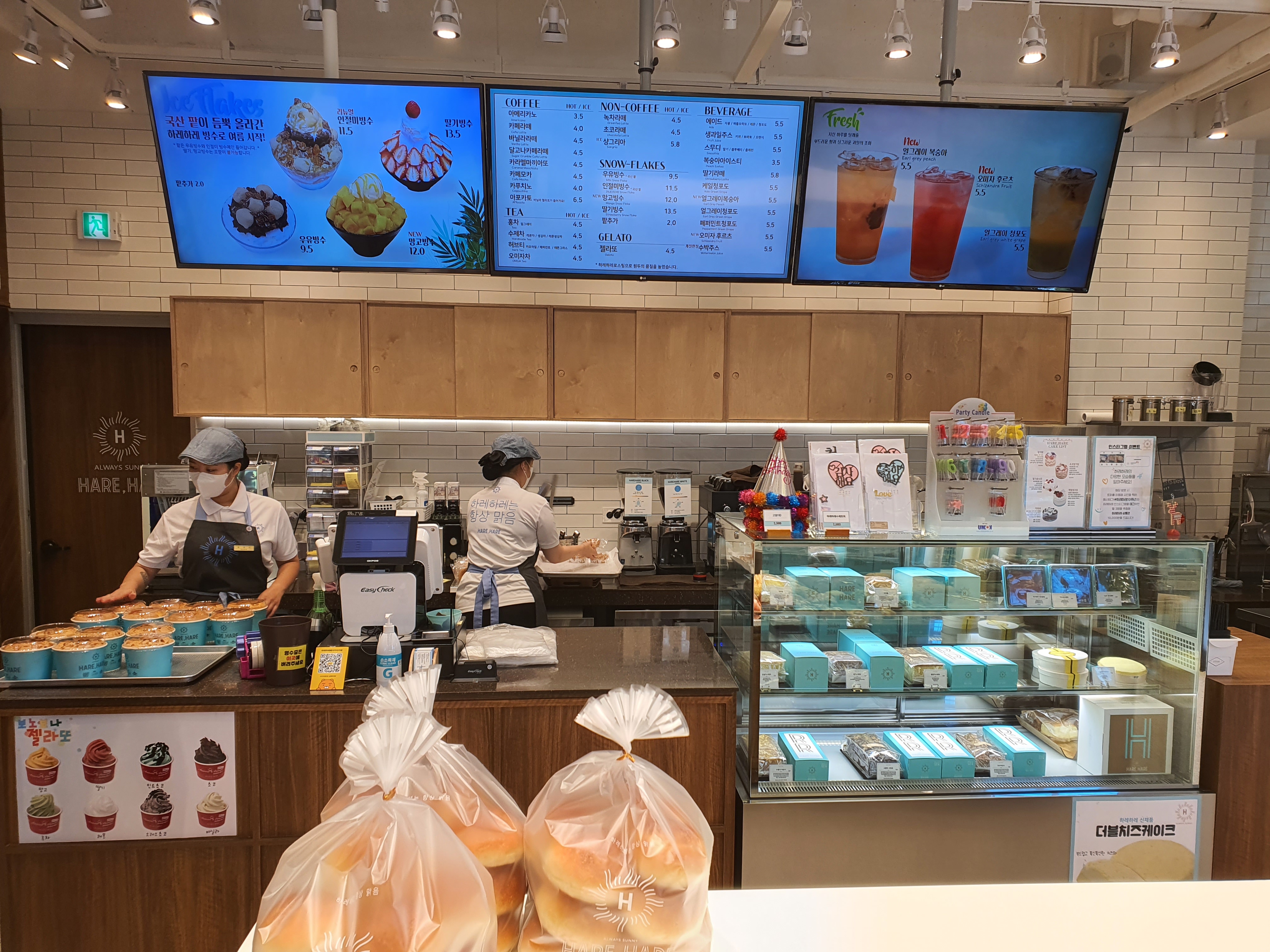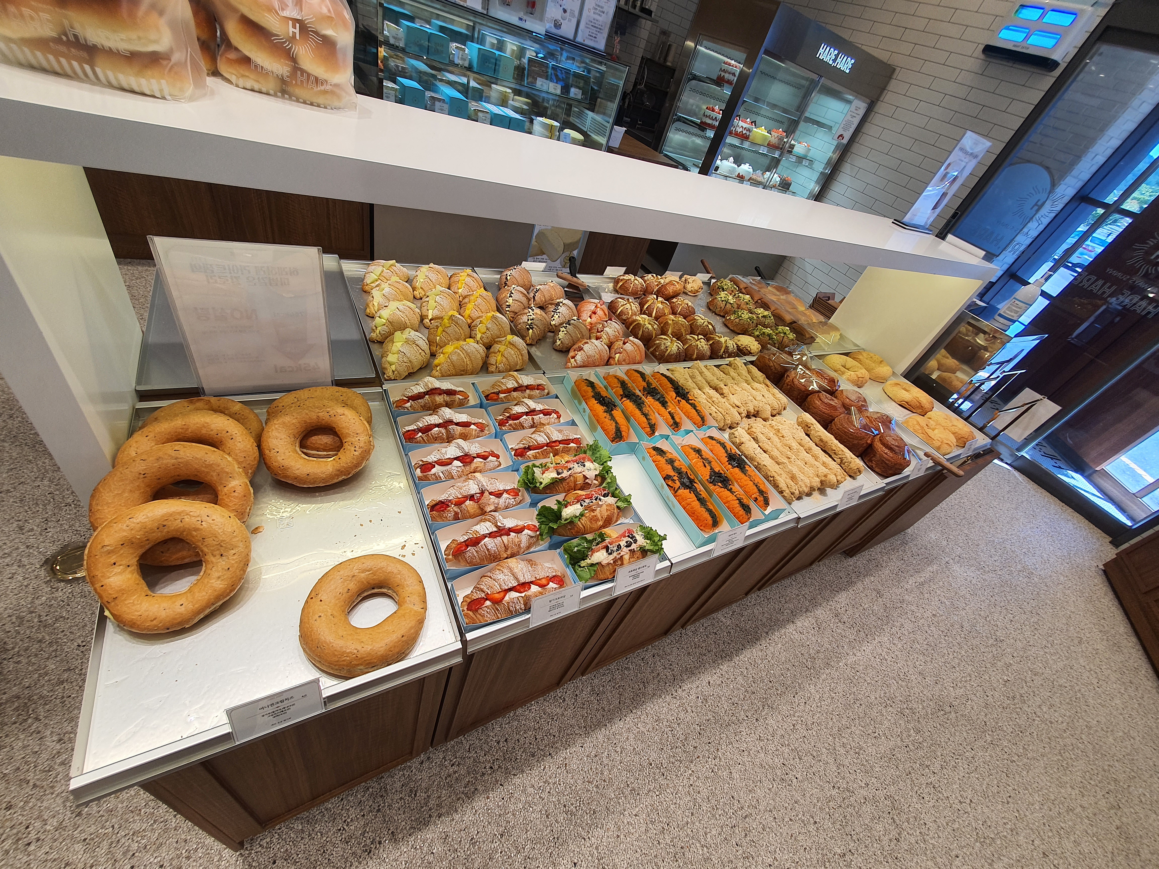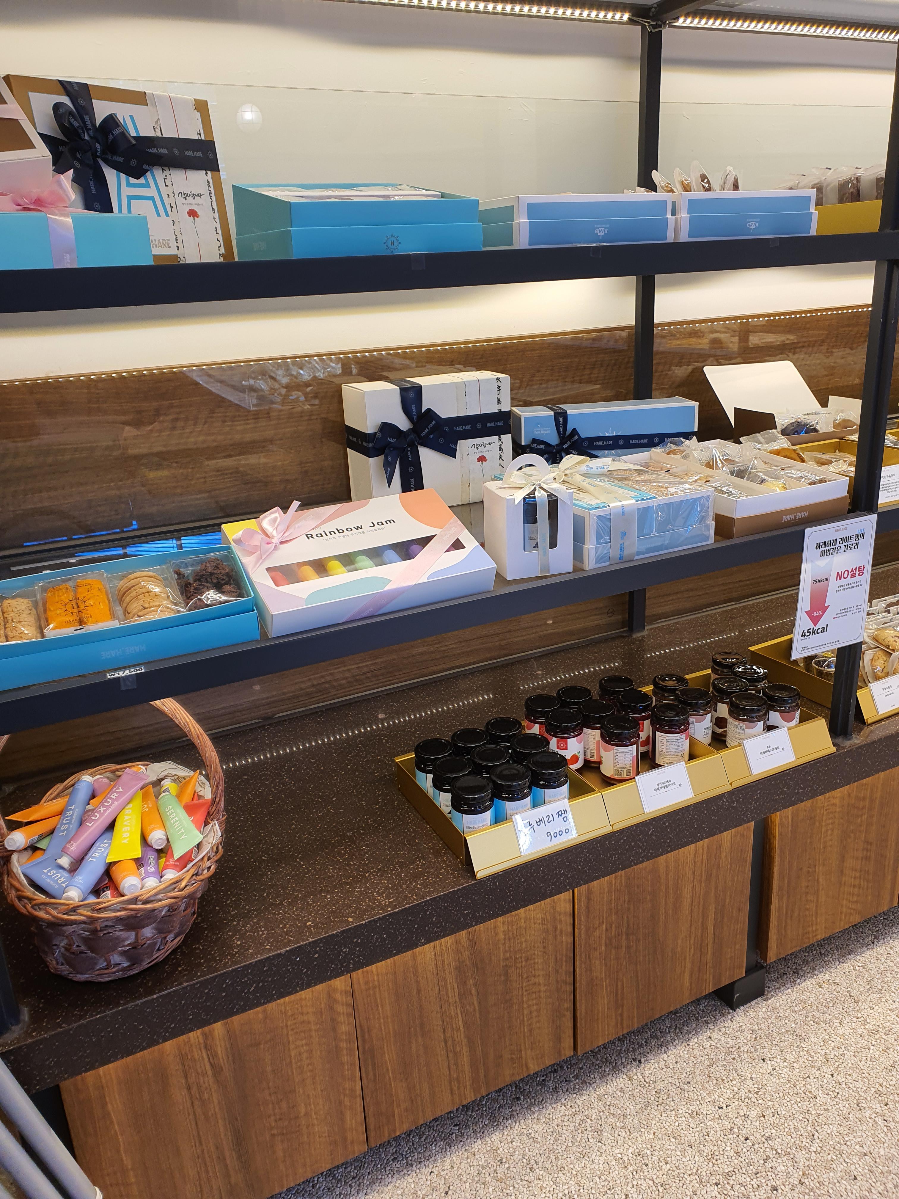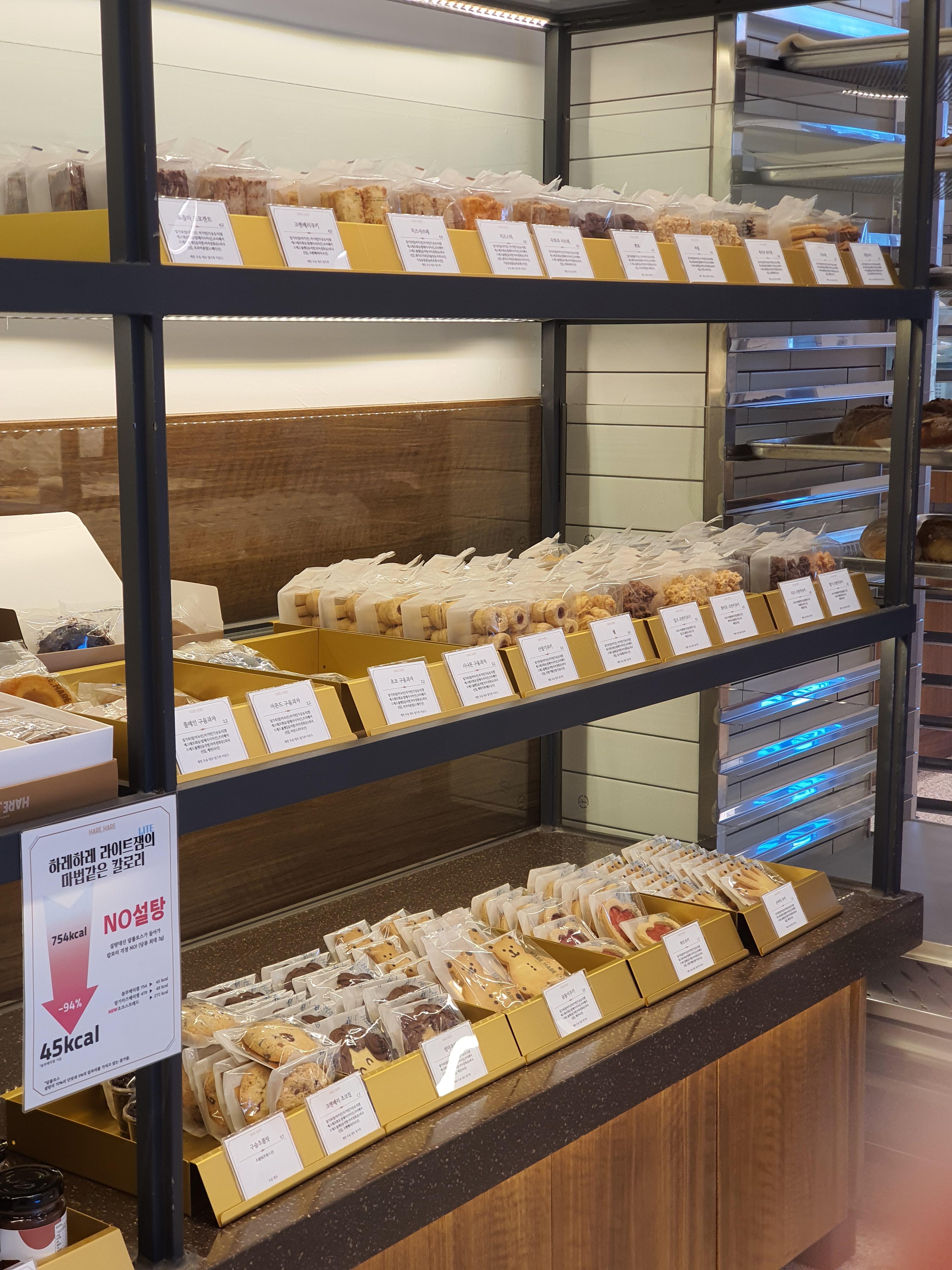 교 1동 하레하레를 들어가면 매장마다 캐빈의마다 선 밤마다 하래 아래가 적혀져 있습니다 정말 많은 빵들이 있고 케이크도 있고 쿠키도 있고 종류별로 굉장히 다양합니다.