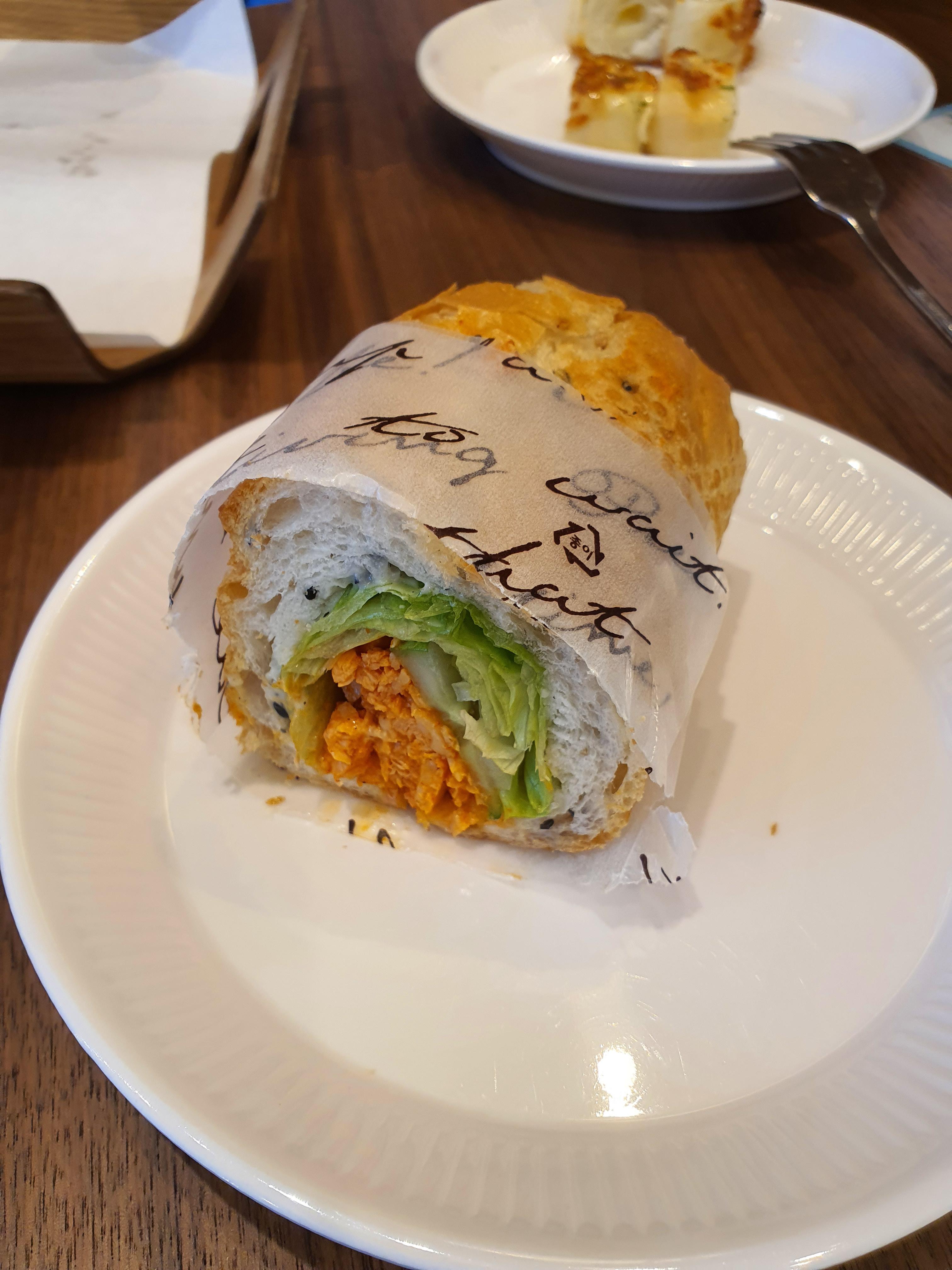 여수 바게트 방과 비슷한 매운닭가슴살 샌드위치 (=바게트 버거 )그리고 모카크고밤빵입니다.