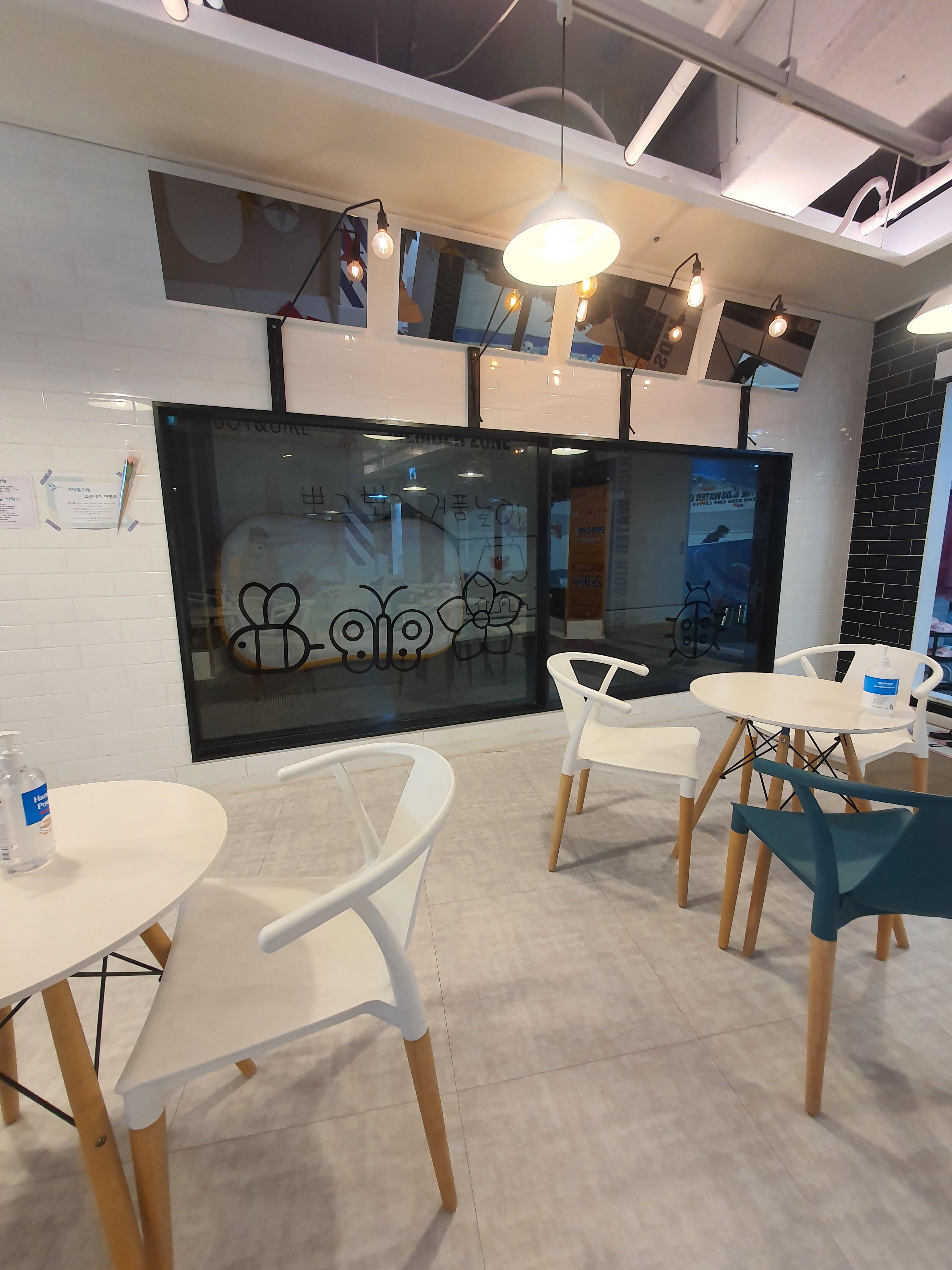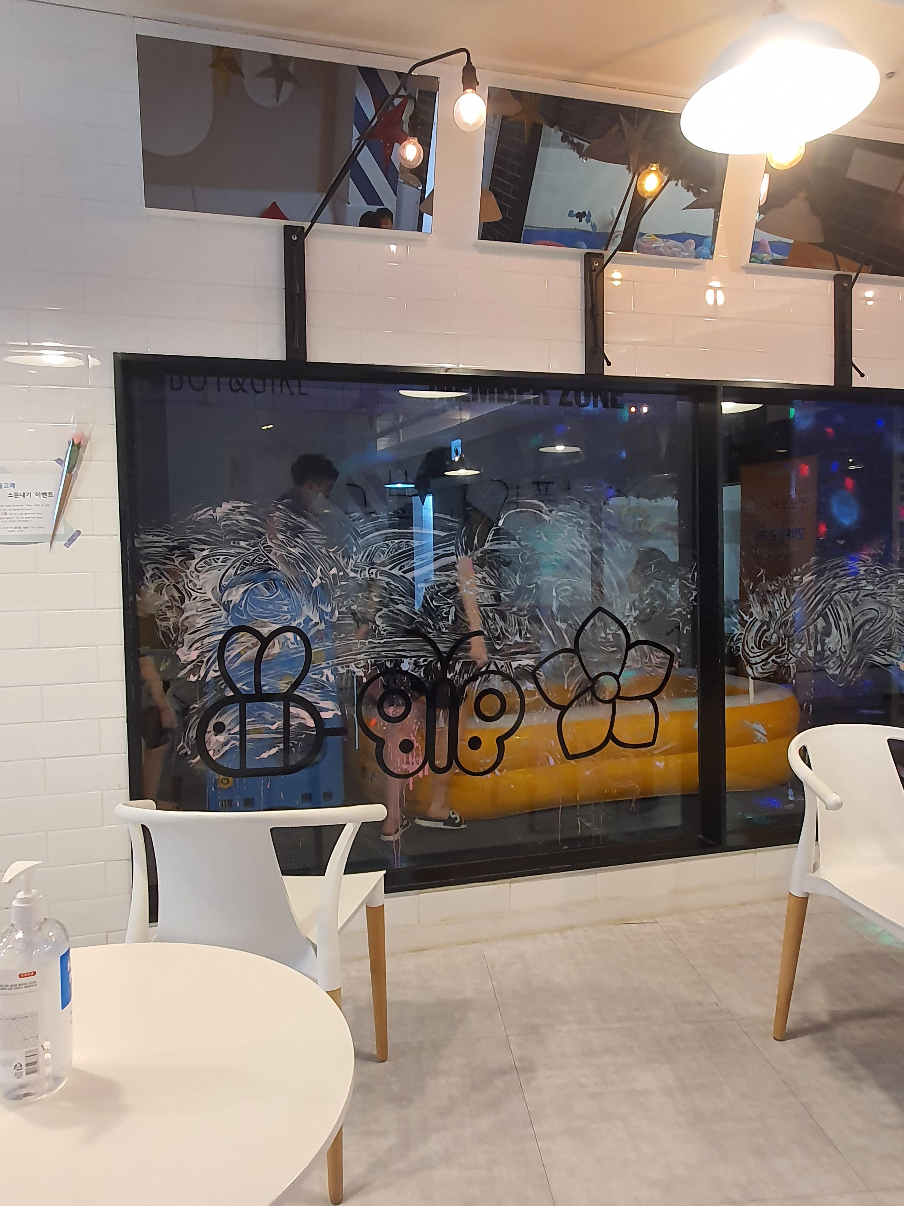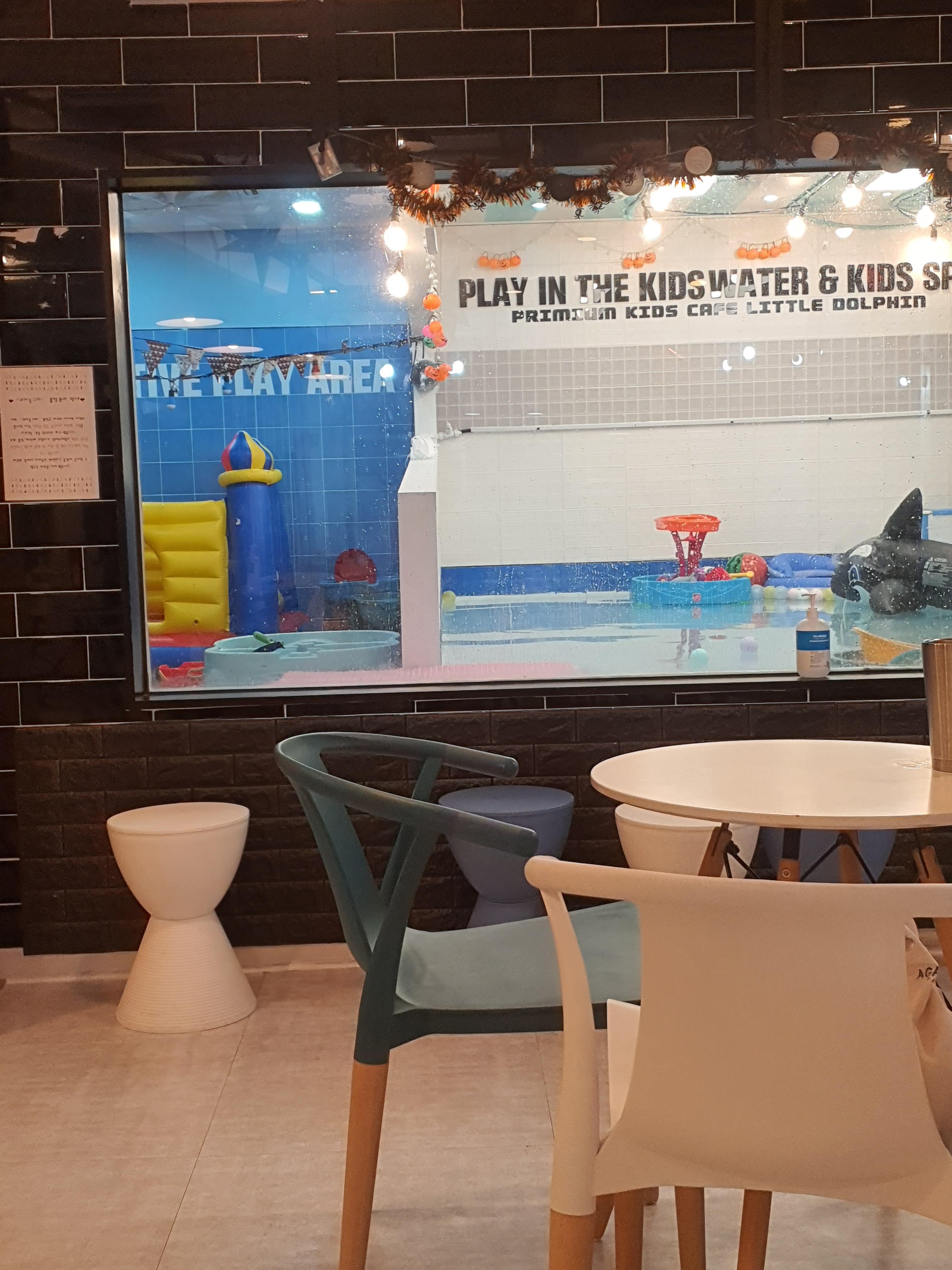 아이들이 물놀이를 하는 동안 엄마 아빠들은 바깥에 앉아서 통유리로 아이들이 무슨 놀이를 하는지 살펴볼 수 있고 사진도 찍어 볼 수 있습니다.