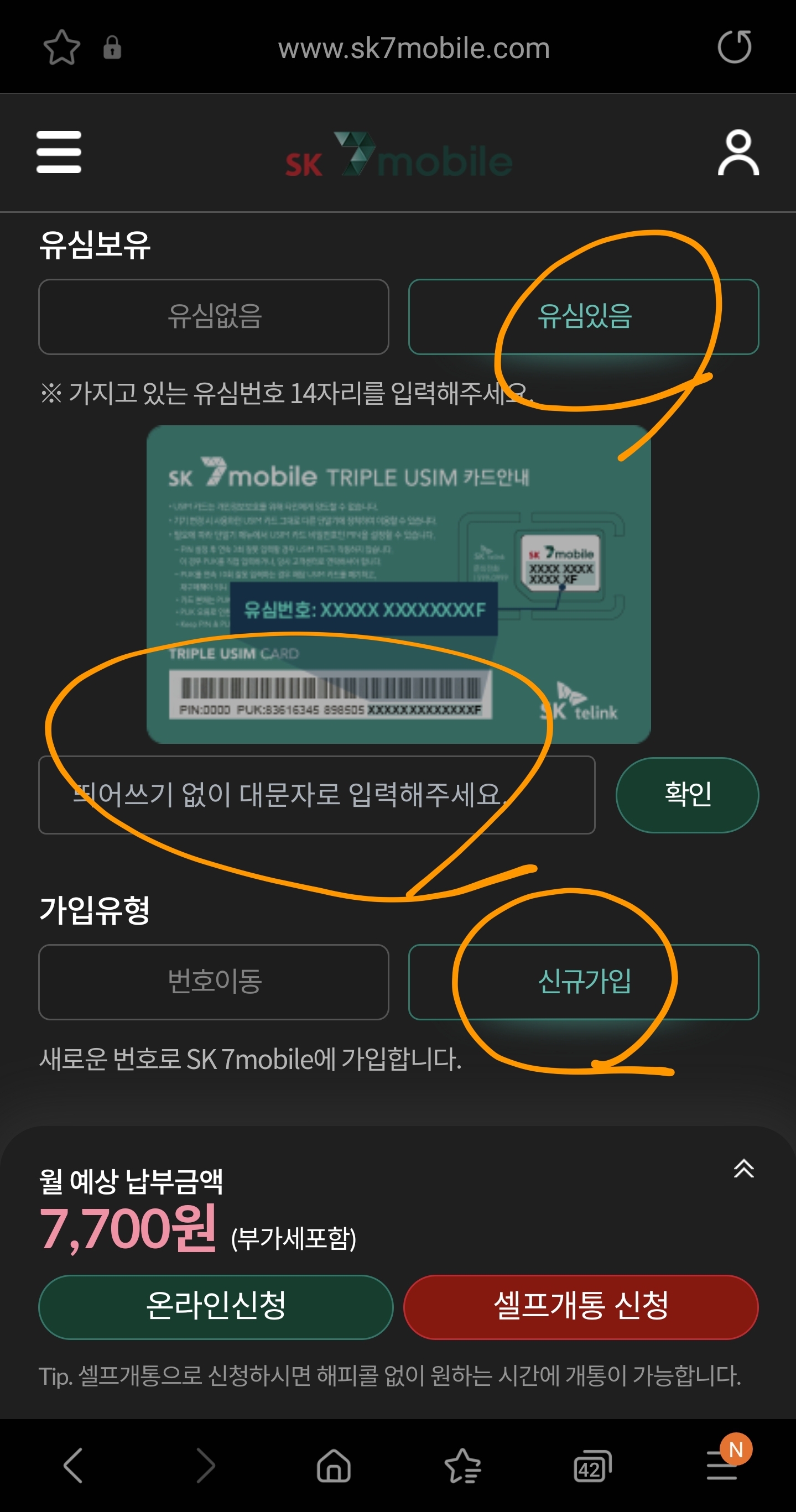 세븐모바일 유심을 샀으니, 유심있음을 선택하고,