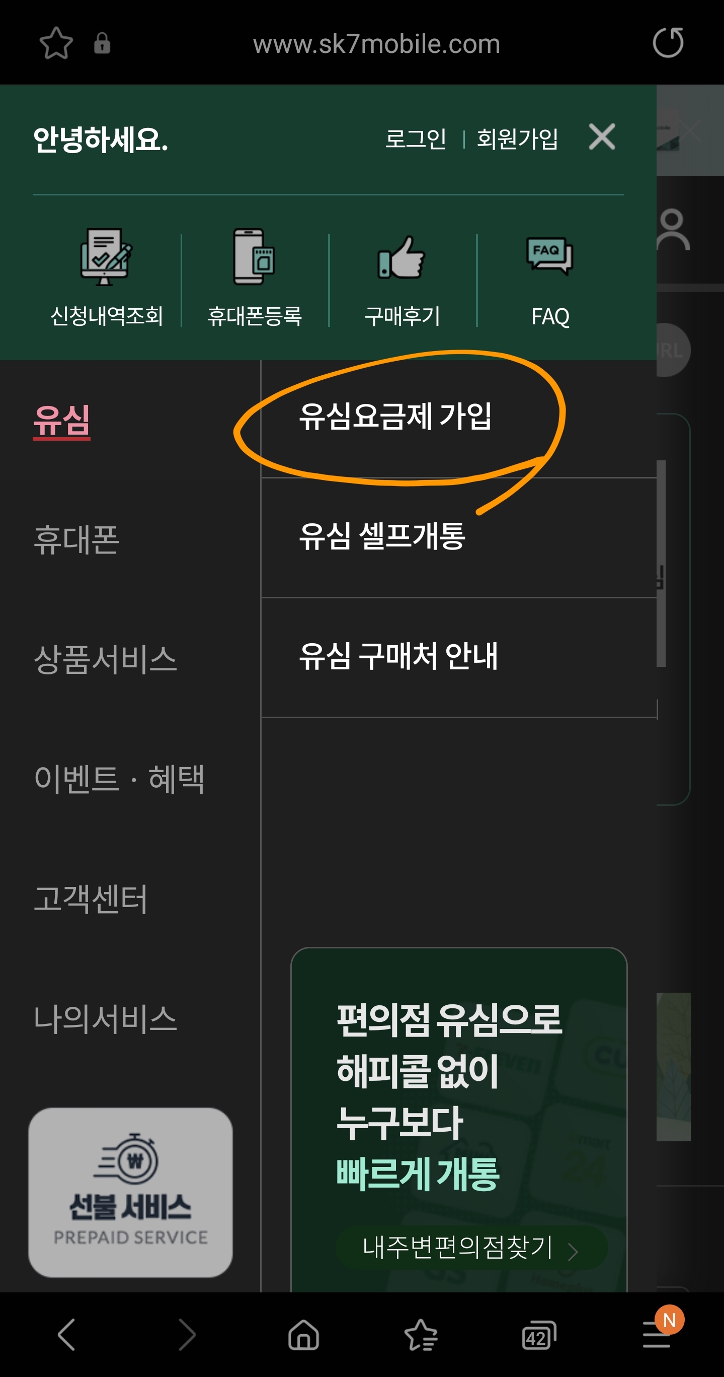 이후 sk 7 모바일 홈페이지에서 회원가입을 하고,