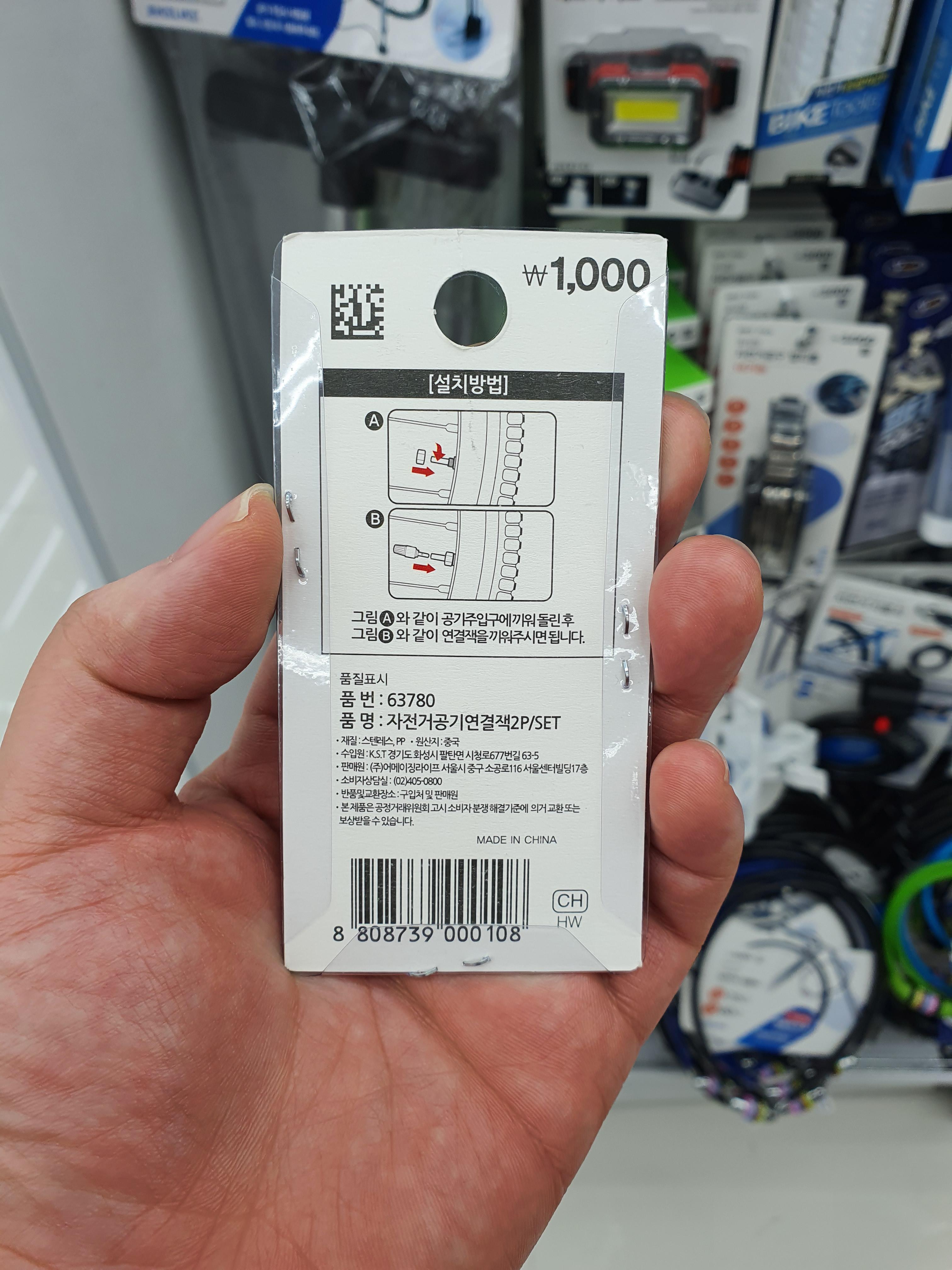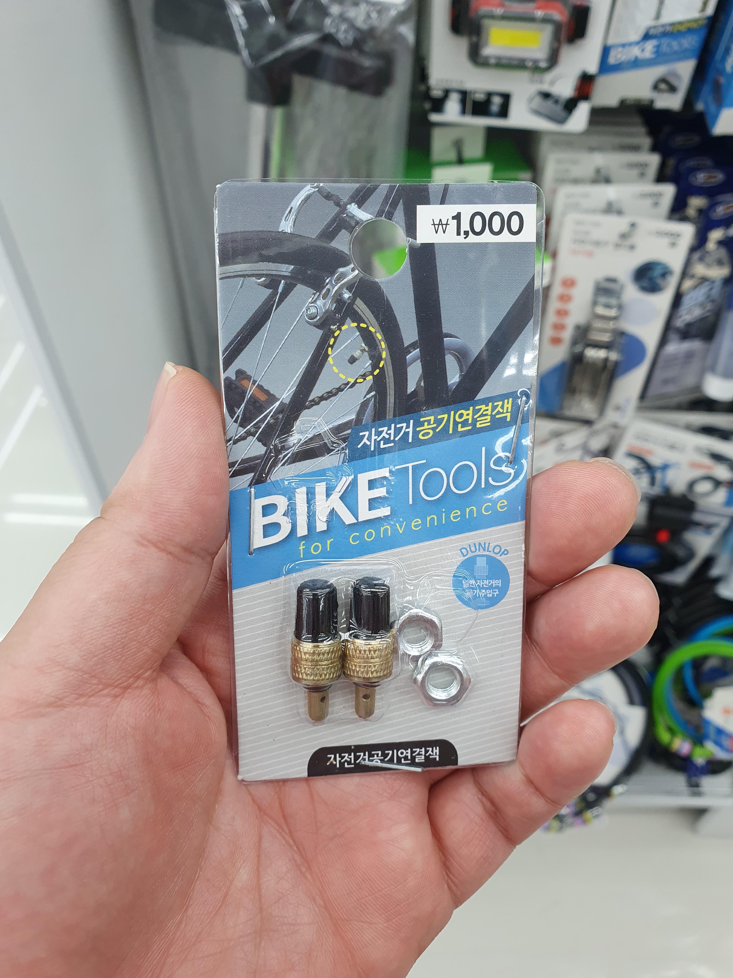 아이 자전거가 빵꾸났는데.. 문제는 던롭 고무가 찢어짐. 다이소에서 자전거 고무무시 자전거 공기연결잭을 구매 했다. 1천원!