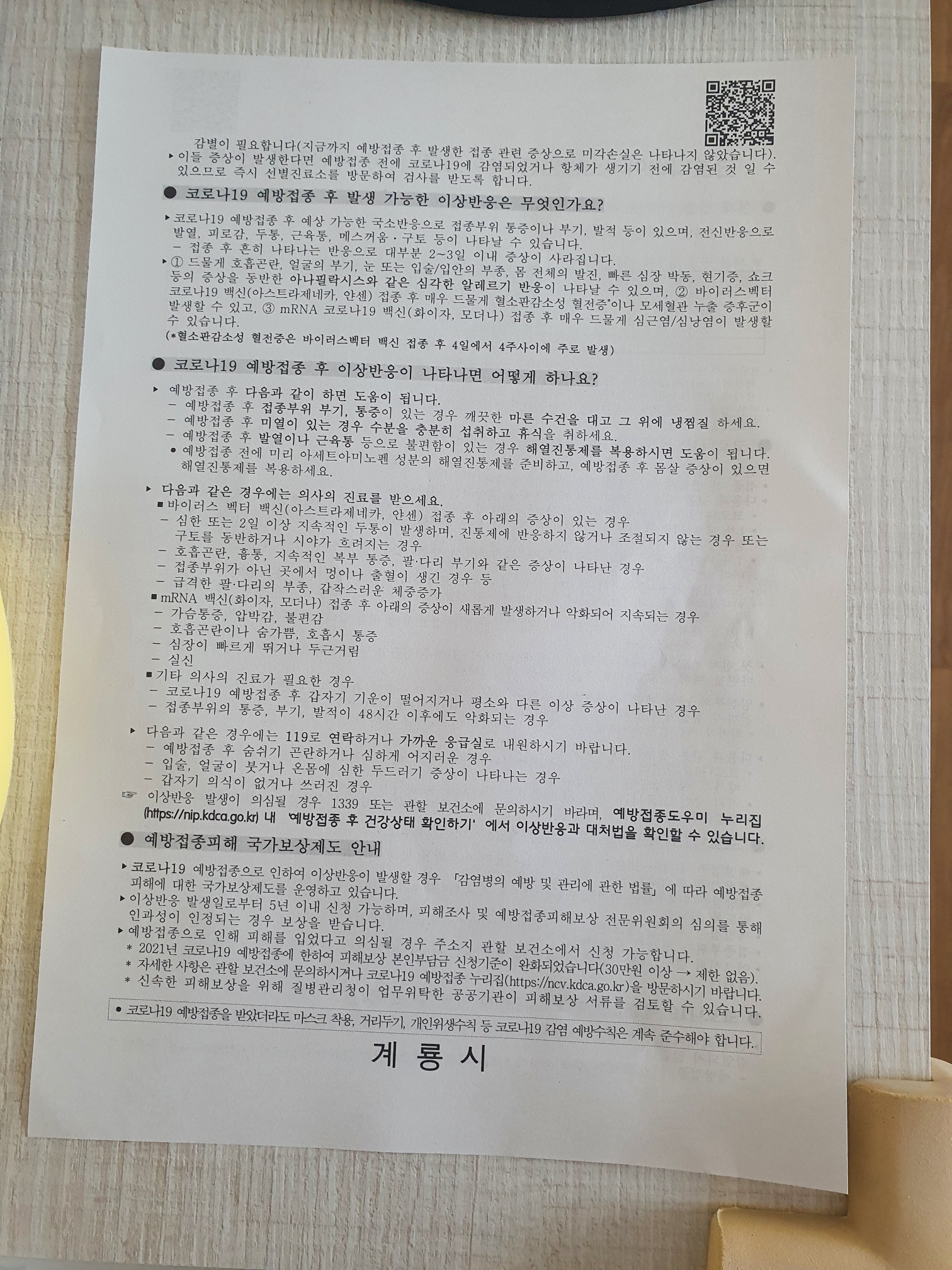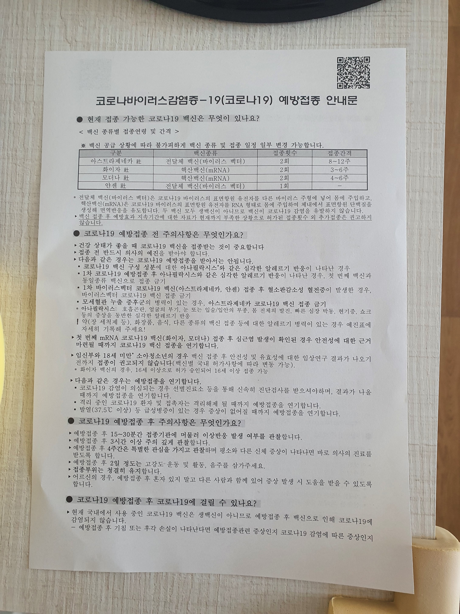 코로나 예방 주사 1차 회의 자료 맞았을 때는 맞고 나서