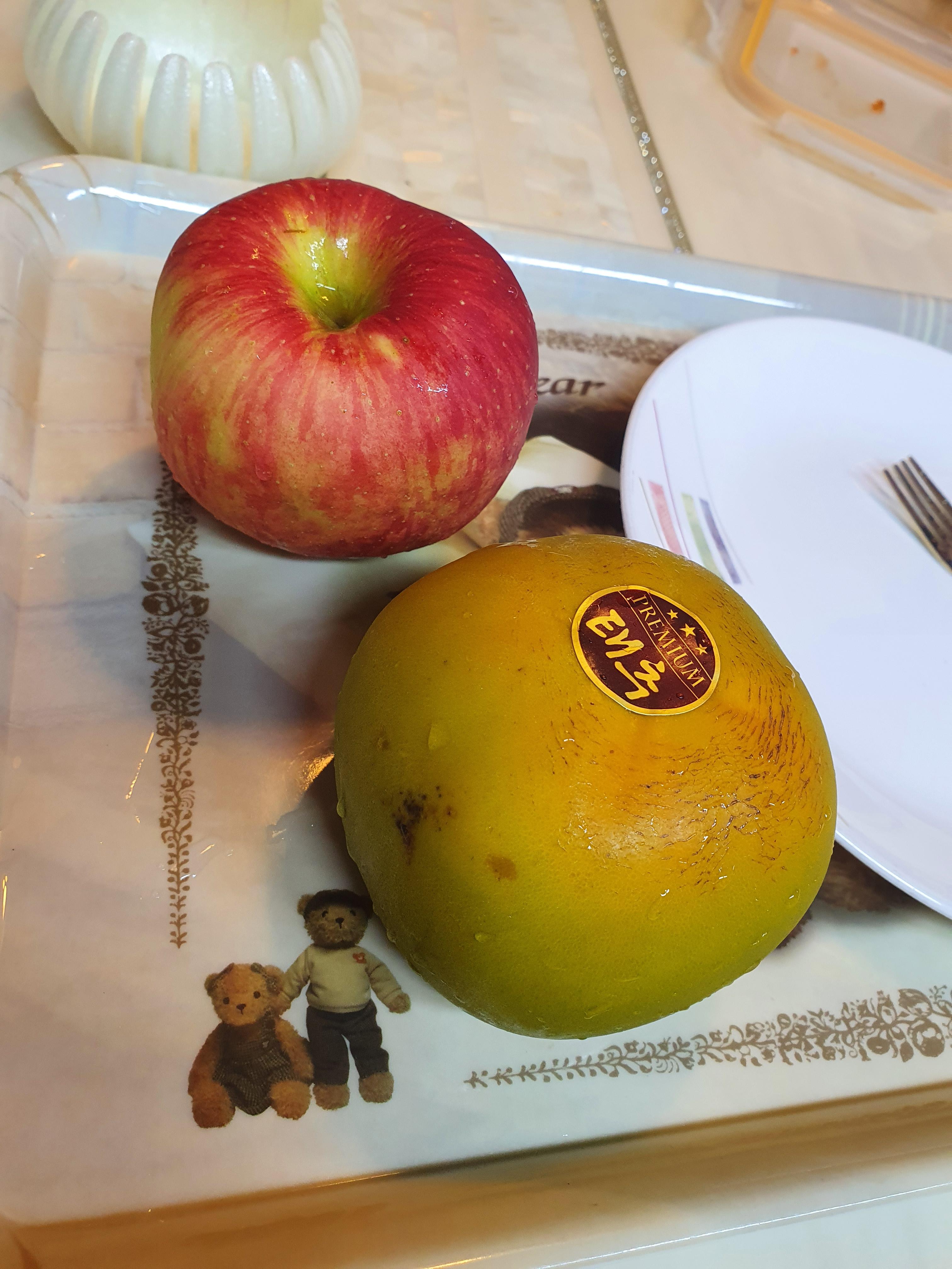 집에서 사 놓은 홍로 사과랑 비교를 해 보면 원래 사과는 단감 보다 더 크잖아요?!