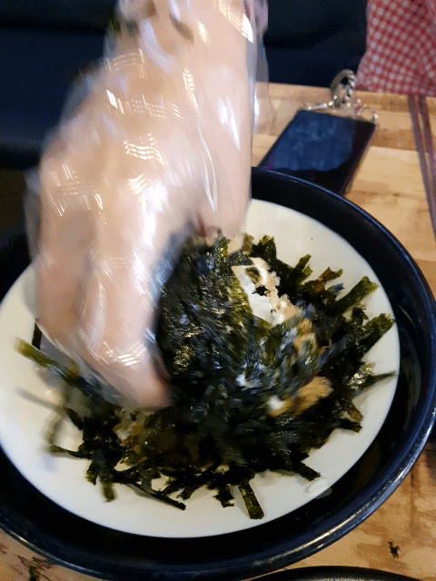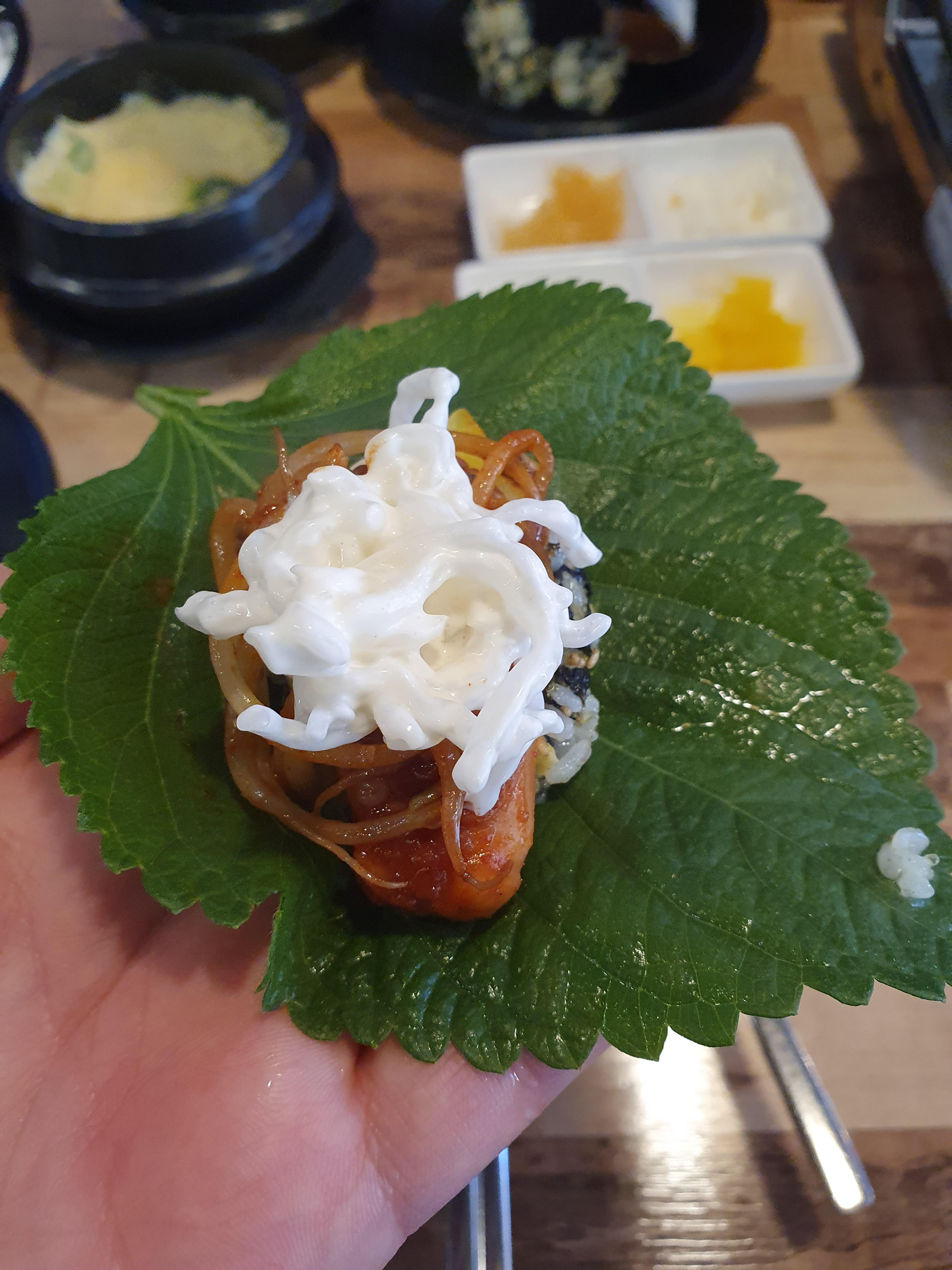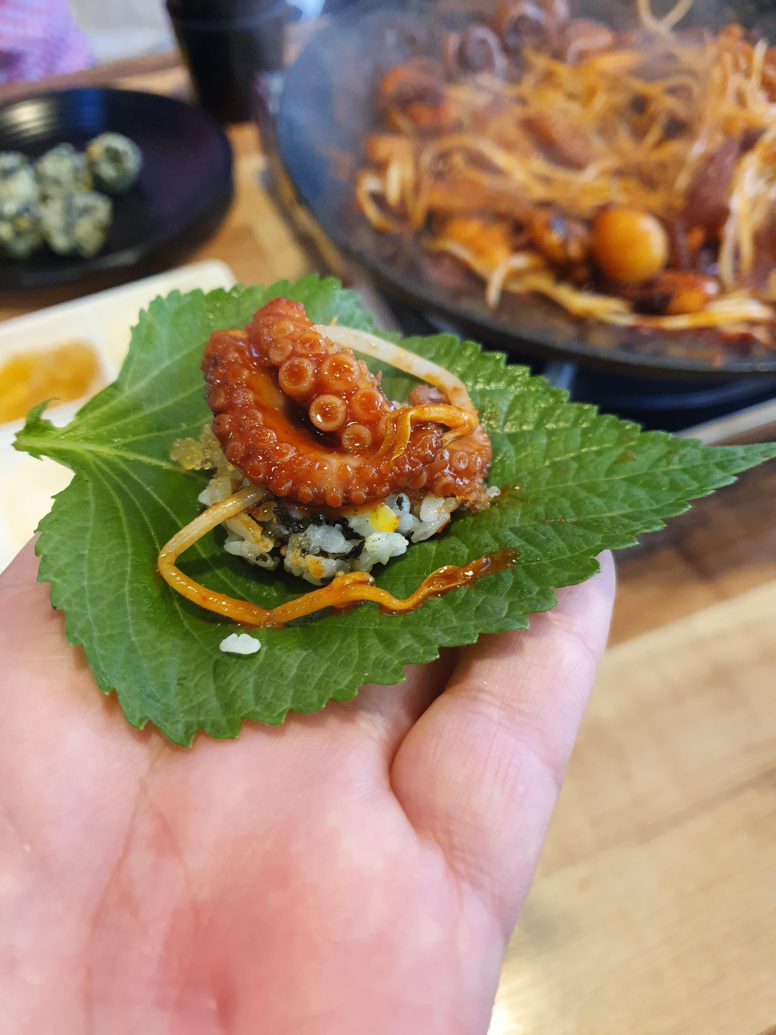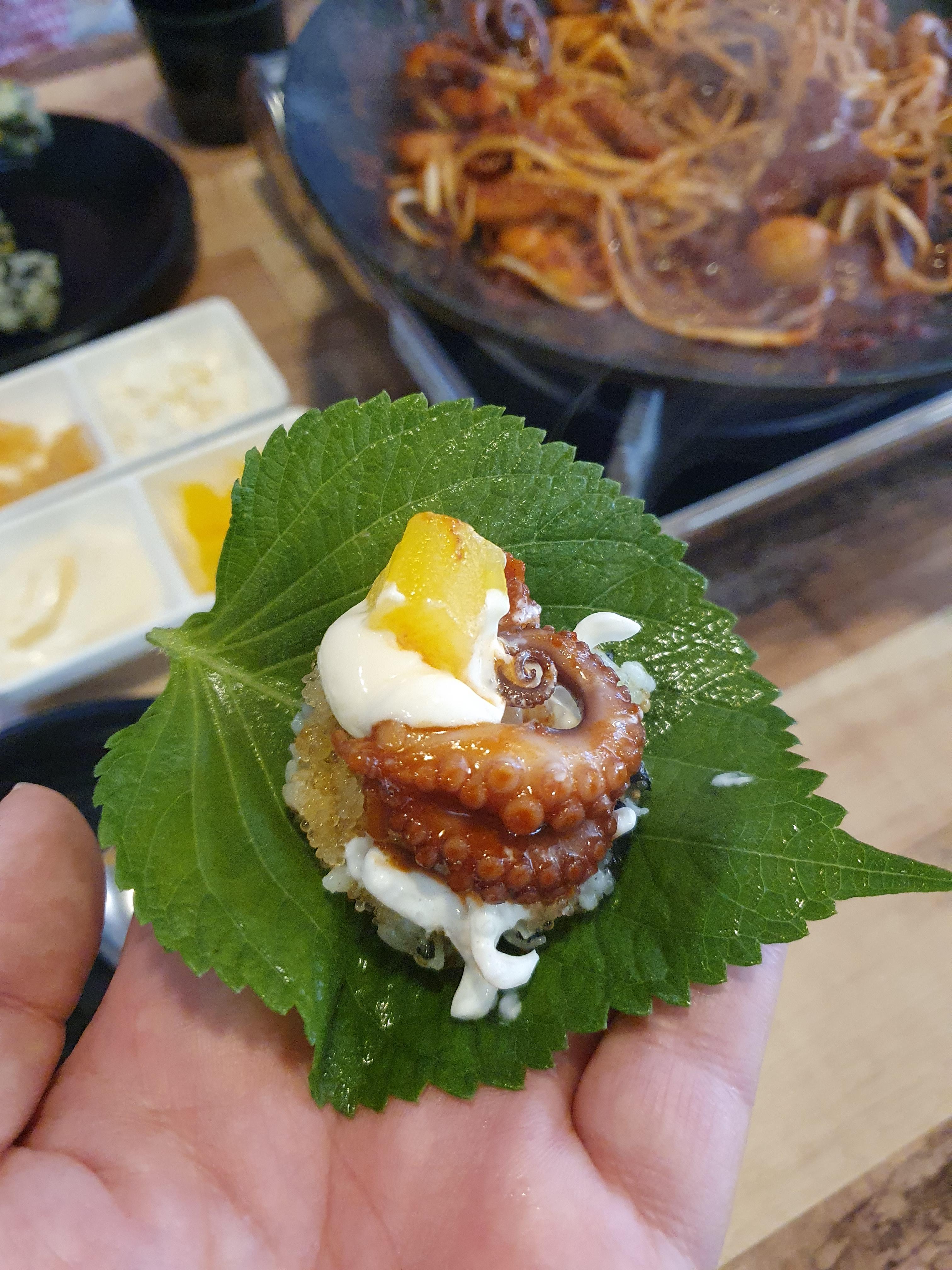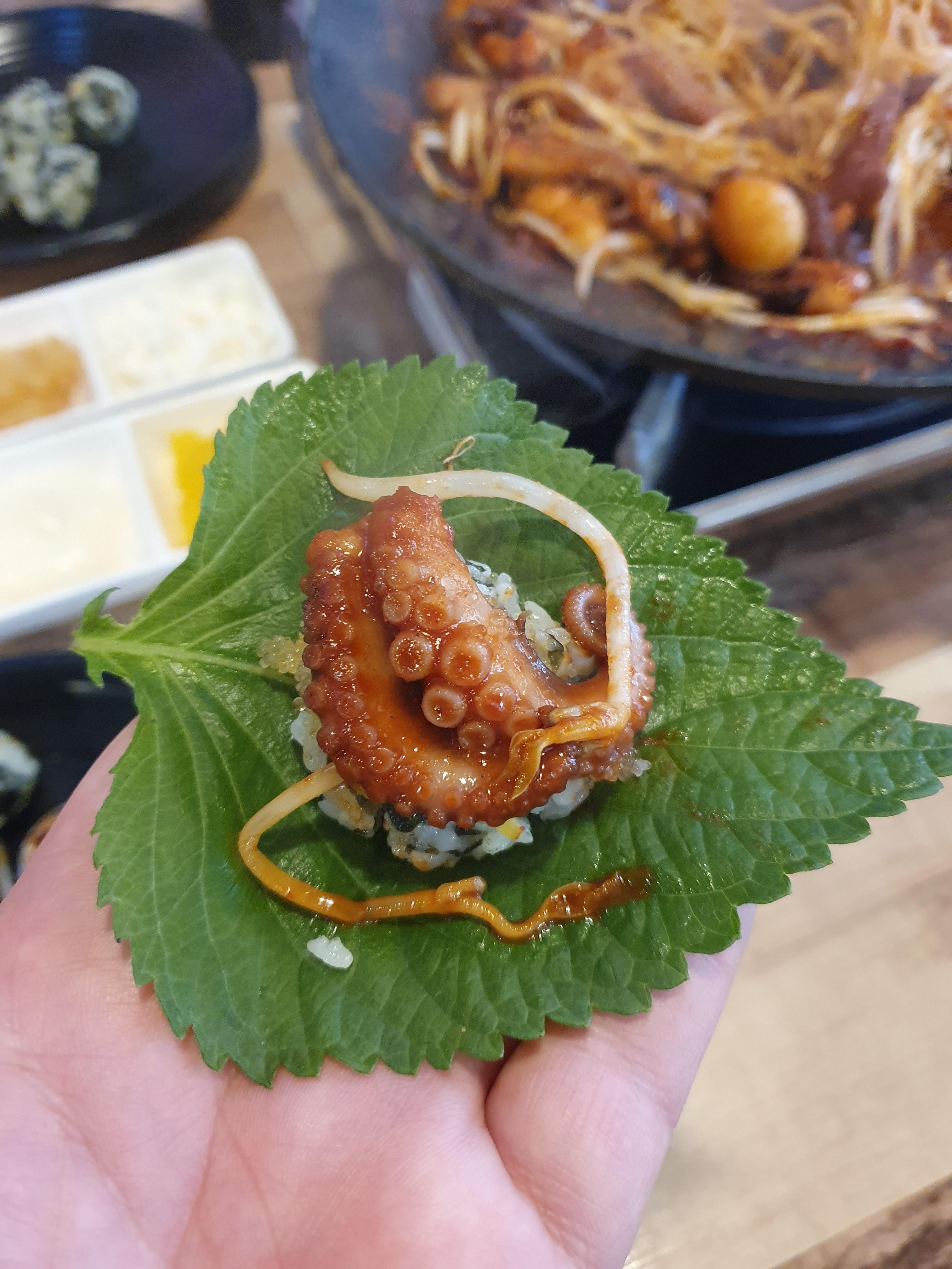 날치알 주먹밥 단무지 천사채를 한번에 넣고 쭈꾸미 올려서 먹으니 너무 맛있습니다.