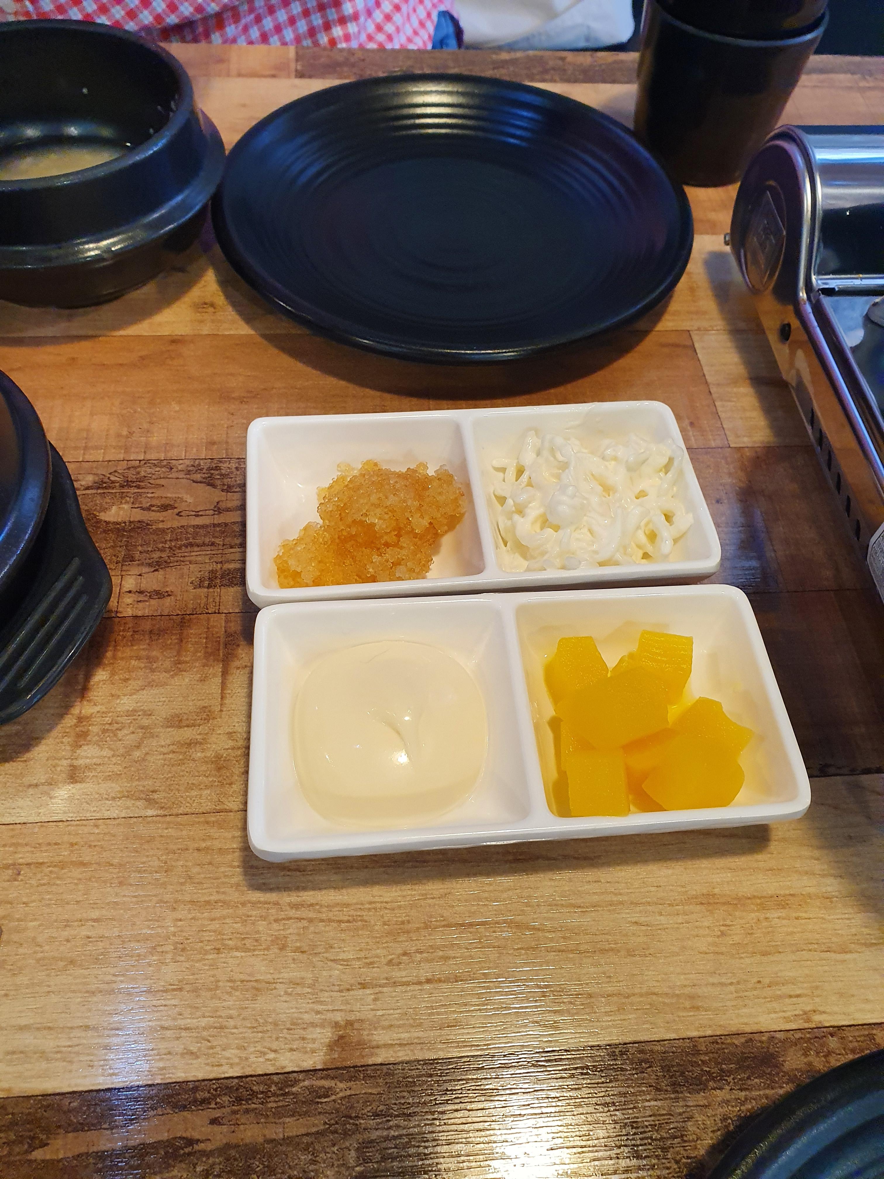 마요네즈를 버무린 천사채와 단무지 마요네즈, 날치알이 있고 세트 메뉴이기에 계란찜이 있습니다.