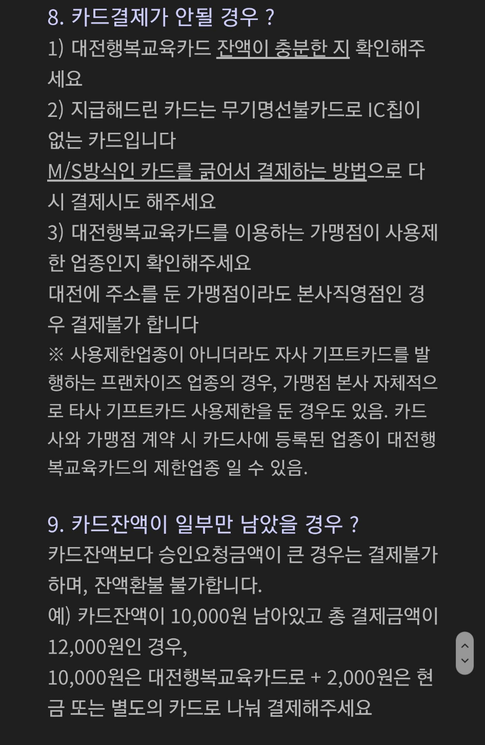: 기프트카드로 구성된 대전행복교육카드는 마그네틱방식으로만 결제가 가능합니다.