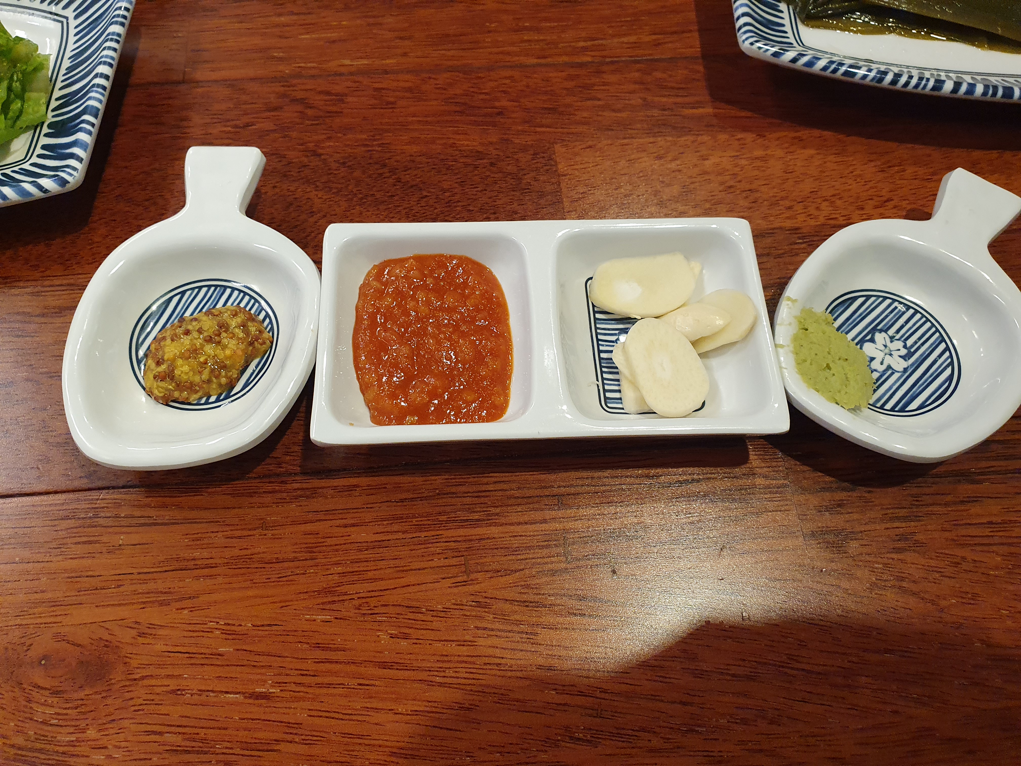 그리고 홀그레인 겨자소스랑, 쌈장, 와사비, 갈치속젓 이렇게 많이 있어서