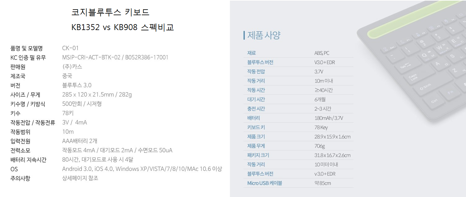 | 코지 블루투스 키보드 비교 | KB1352BT (화이트) | KB908BT (블랙) |