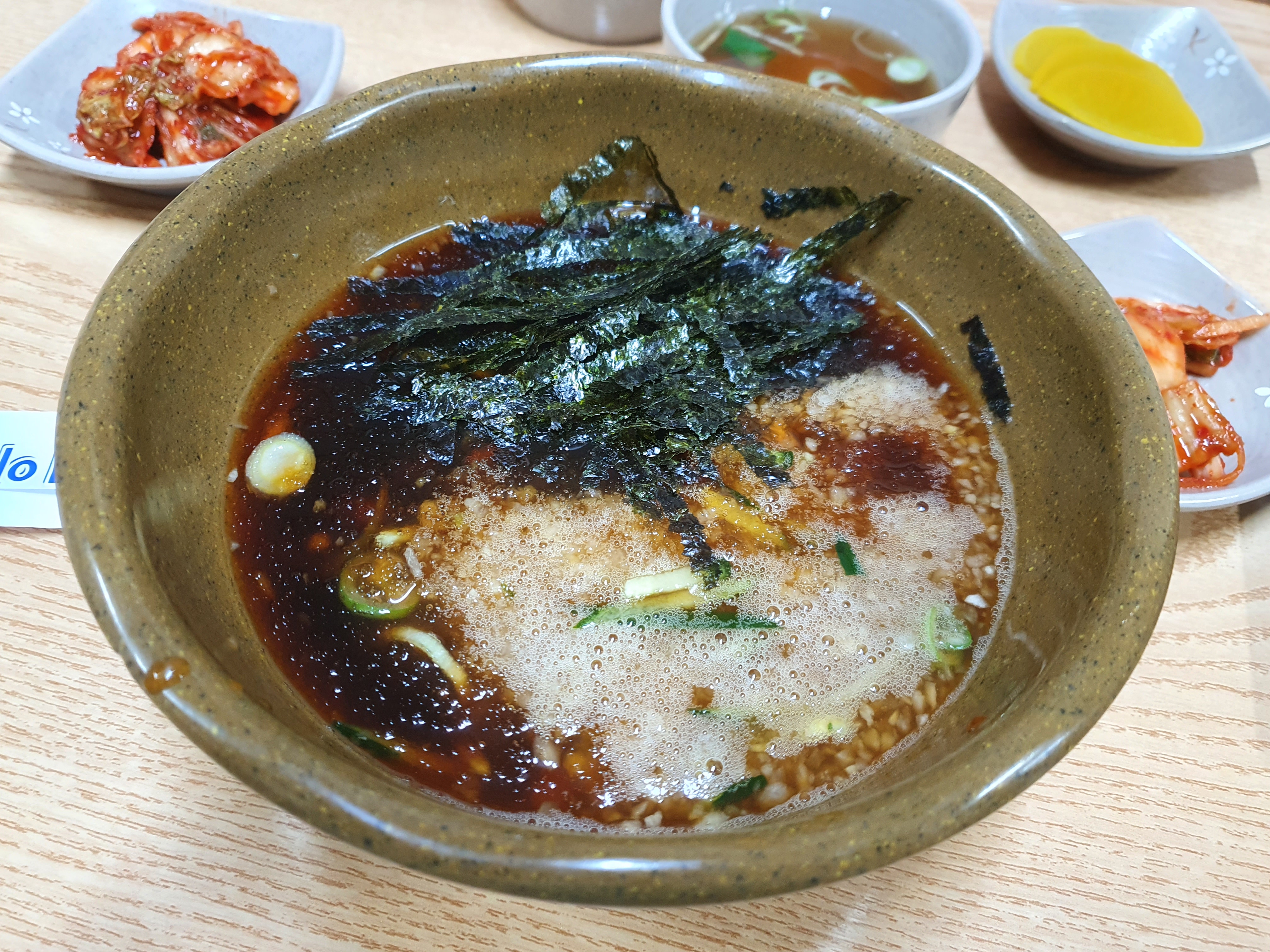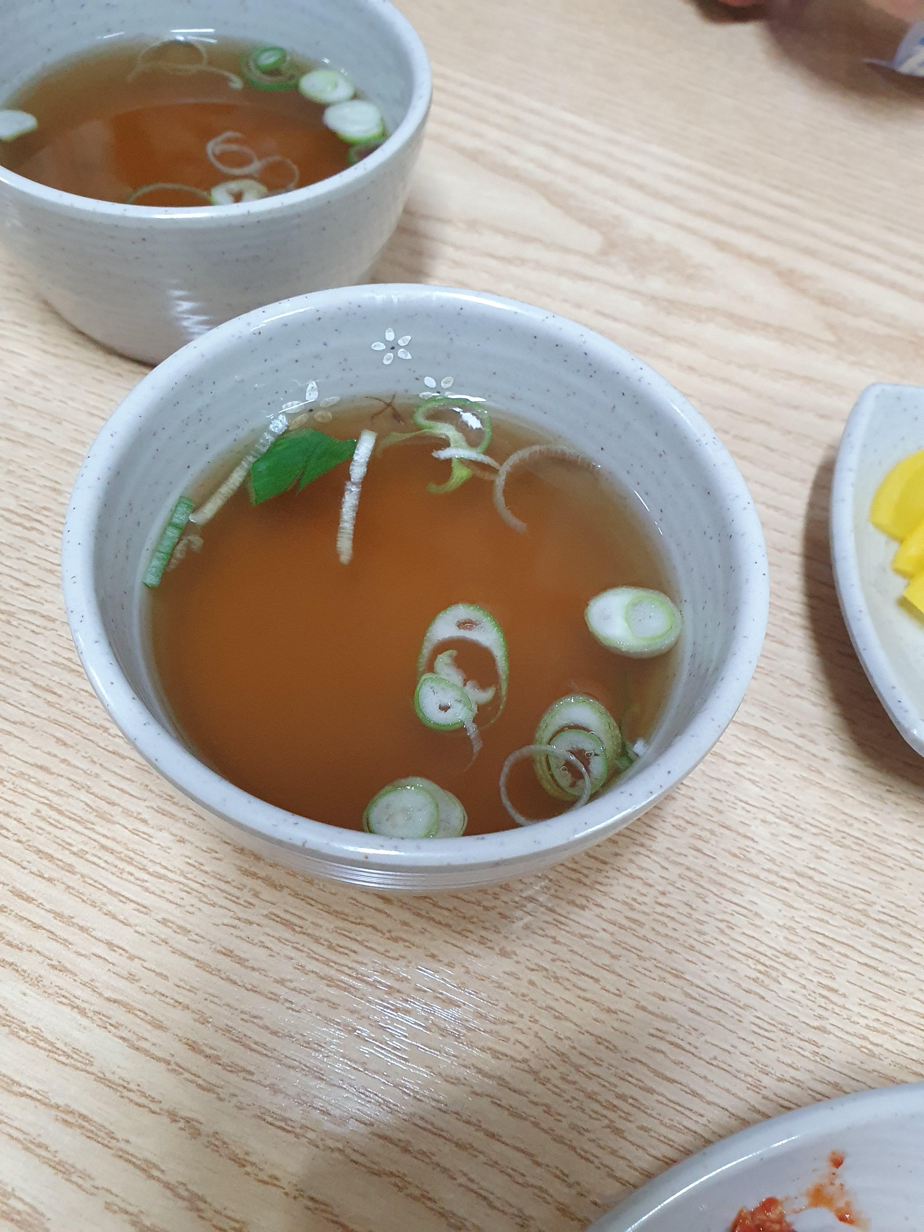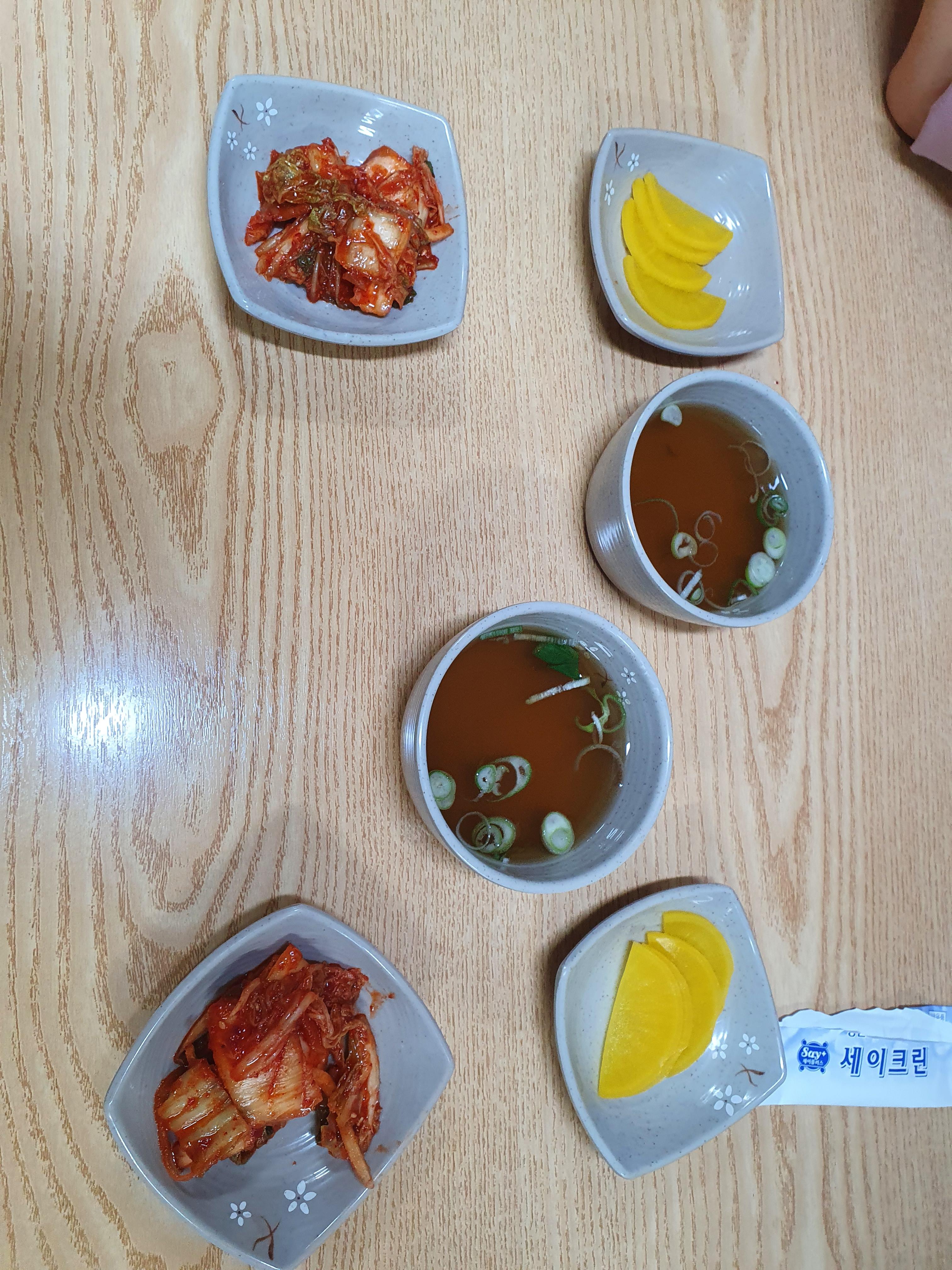 기본찬은 탕국과 단무지 그리고 배추김치입니다.