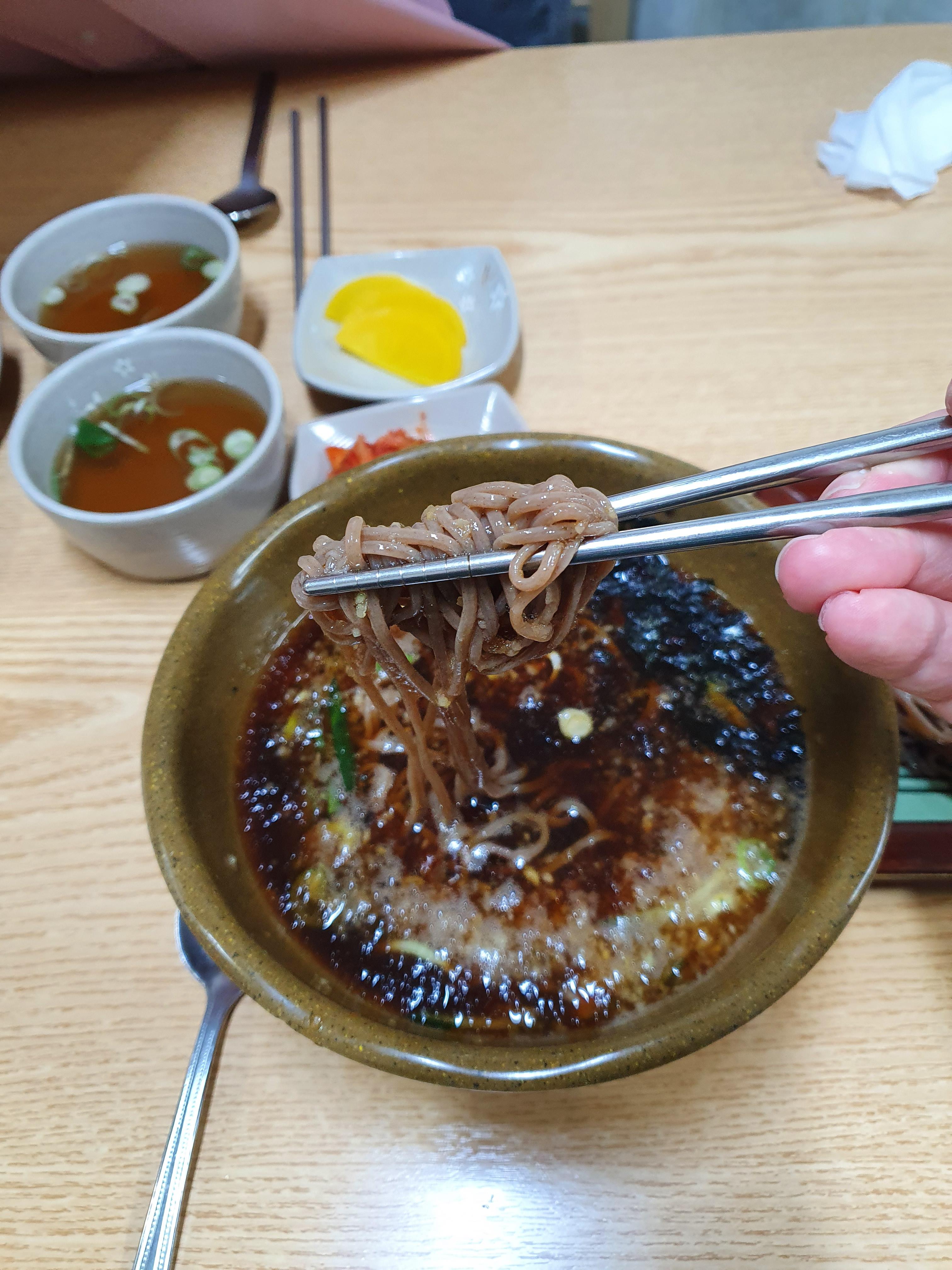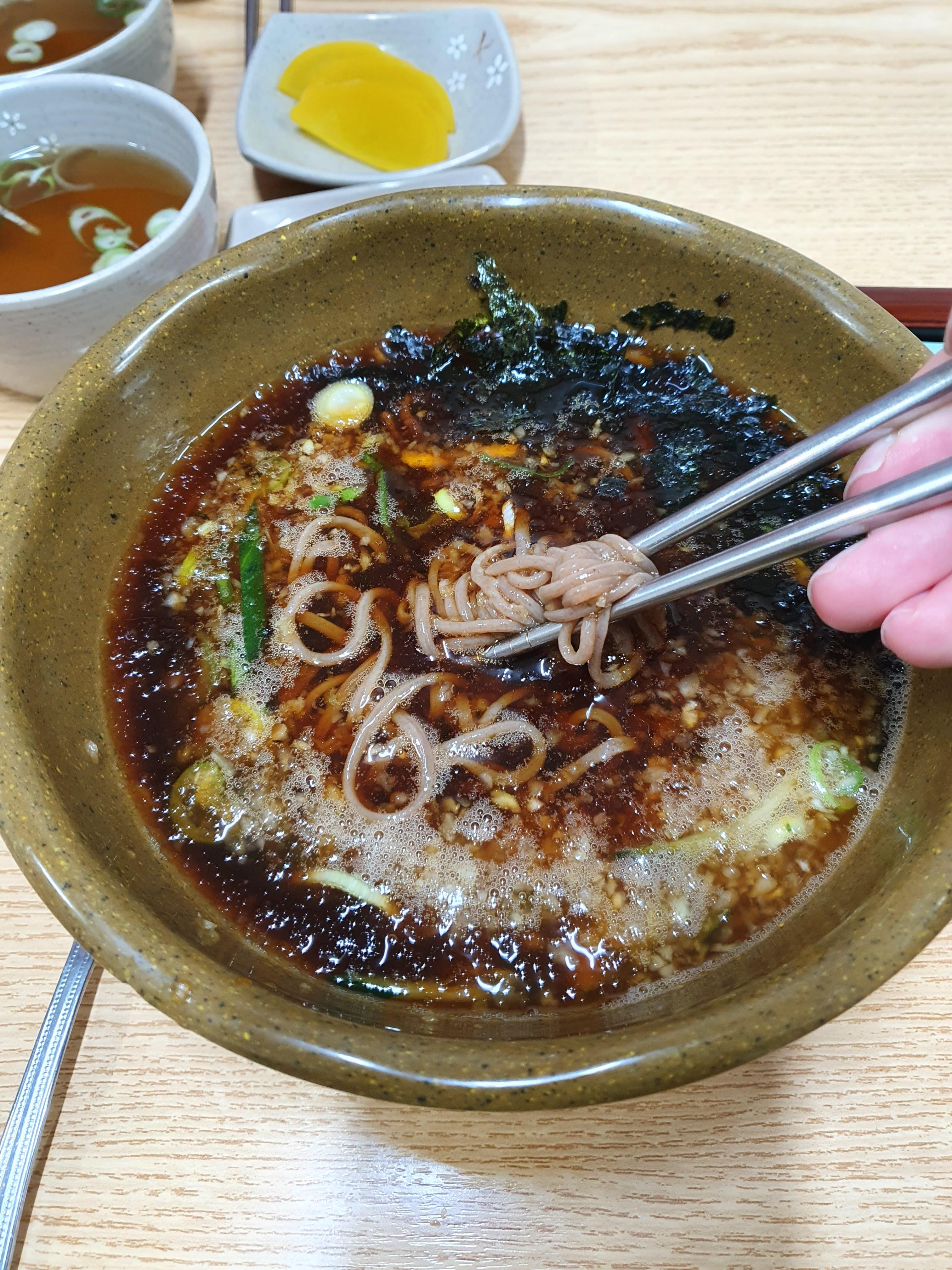 모밀을 장국에 적셔서 한젓가락 먹어 봅니다.