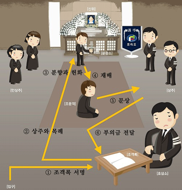 : 부의금 함은 분향소 앞에 위치하고 있습니다. 거기에 부의금 함이 있으니 부의금을 넣으시고, 방명록에 조문오신 분의 이름을 기재하시면 됩니다.
