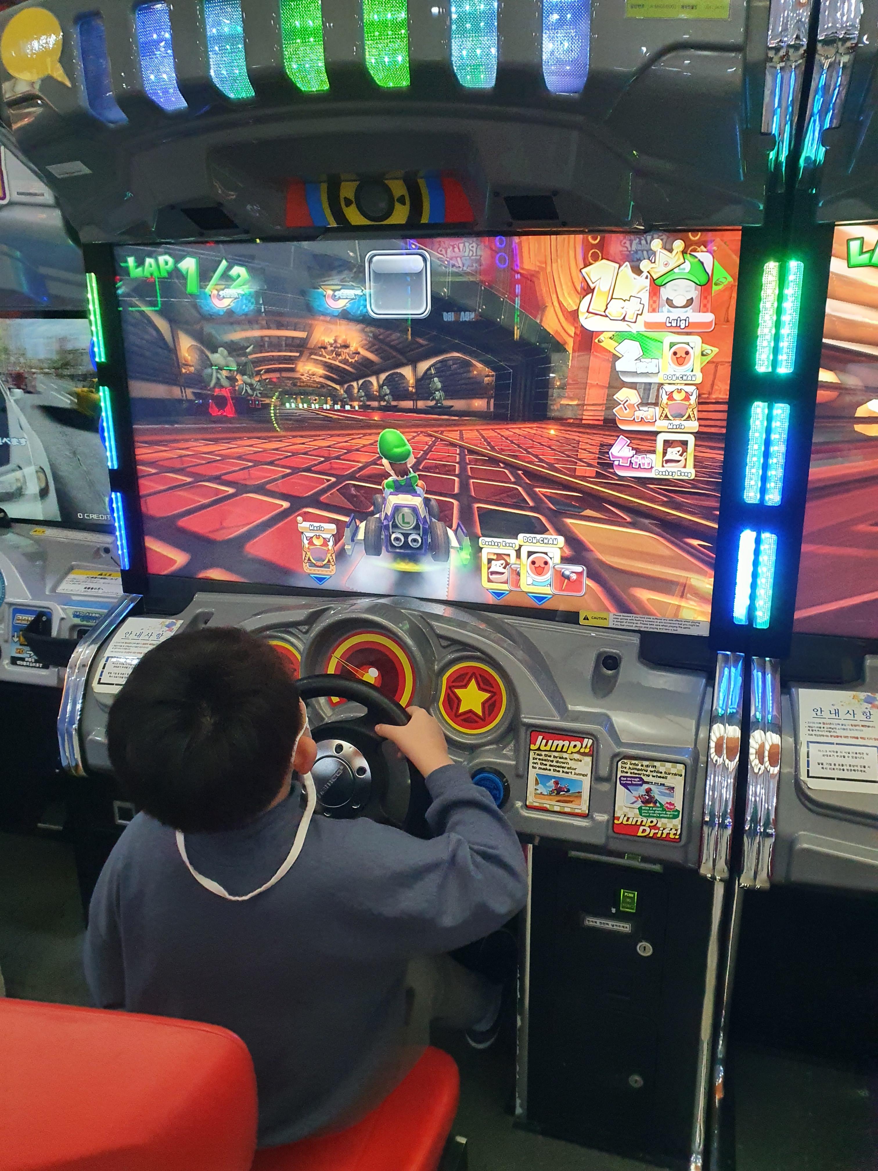 그러다 게임장에 들어가서 마리오 레이싱을 즐기는 녀석들