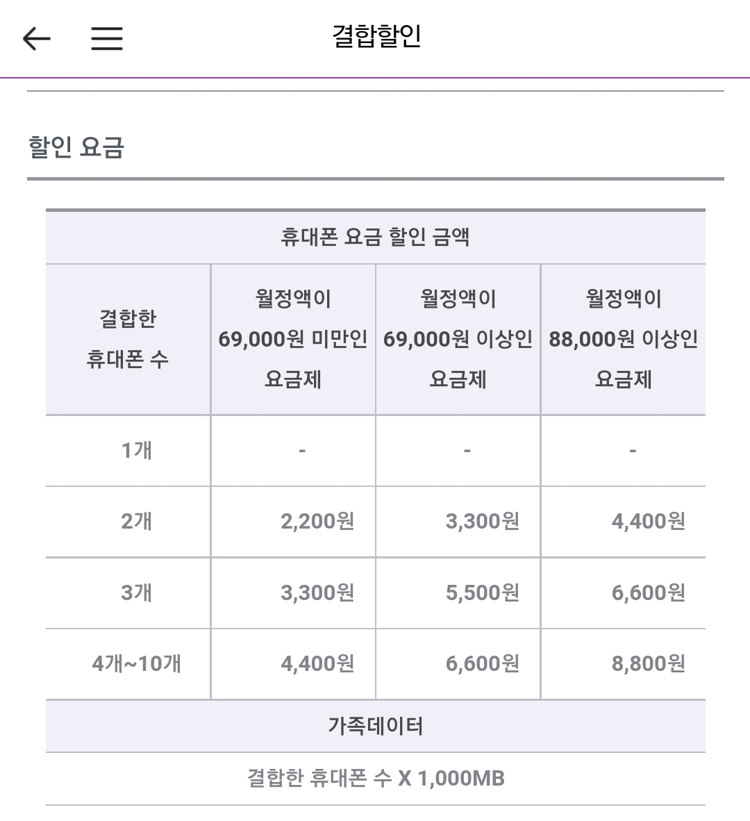 여기에 3대 4대 이렇게 늘어가게 되면, 요금을 더 할인 받게 되니 굉장히 쉽게 가입도 가능하고 거기다 할인 + 가족데이터도 추가로 받게 되니 좋은듯합니다.