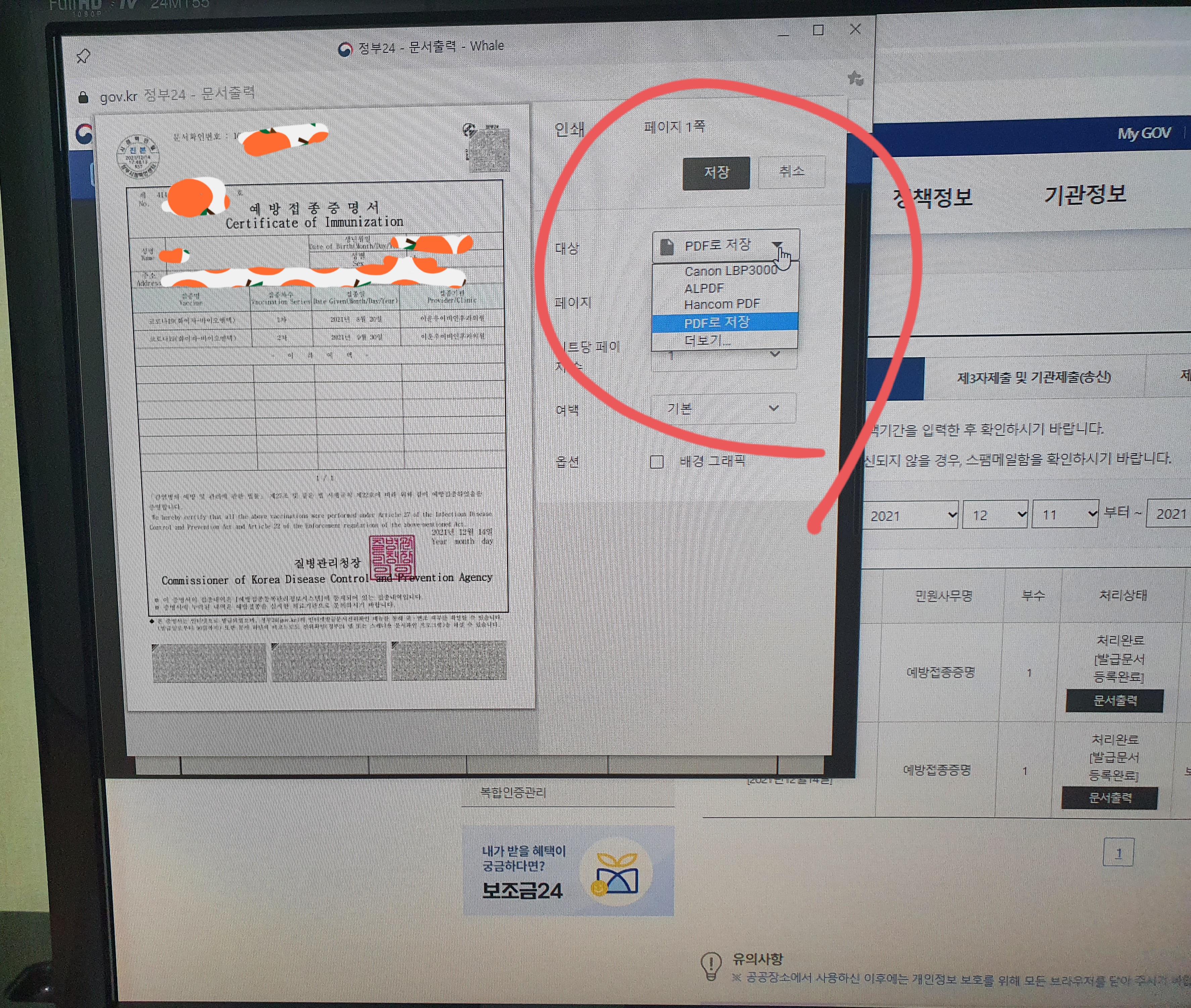 pc로 접속하셔서 pdf파일로 접종증명서를 다운받고