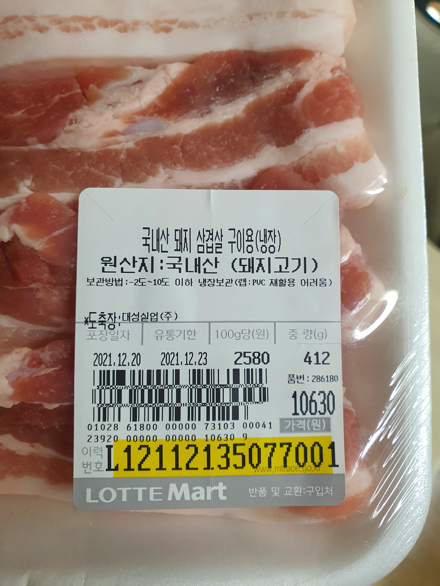 이번엔 한번 100그램당 2580원 하는 롯데마트 국내산 돼지 삼겹살 구이용(냉장) 412그램을 구매하였습니다.