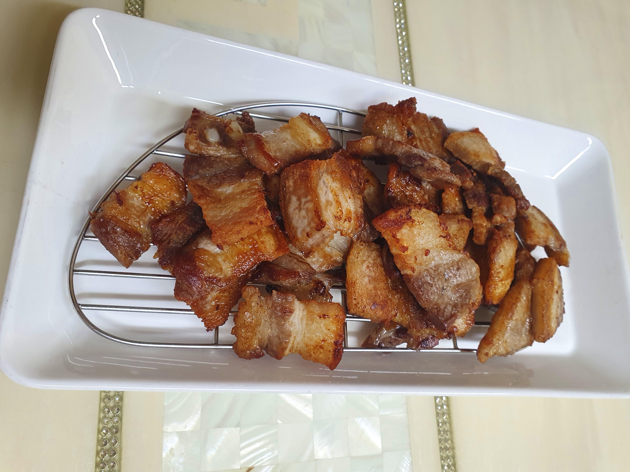 제 스타일대로 삼겹살 기름에 바삭튀겨진 삼겹살입니다.