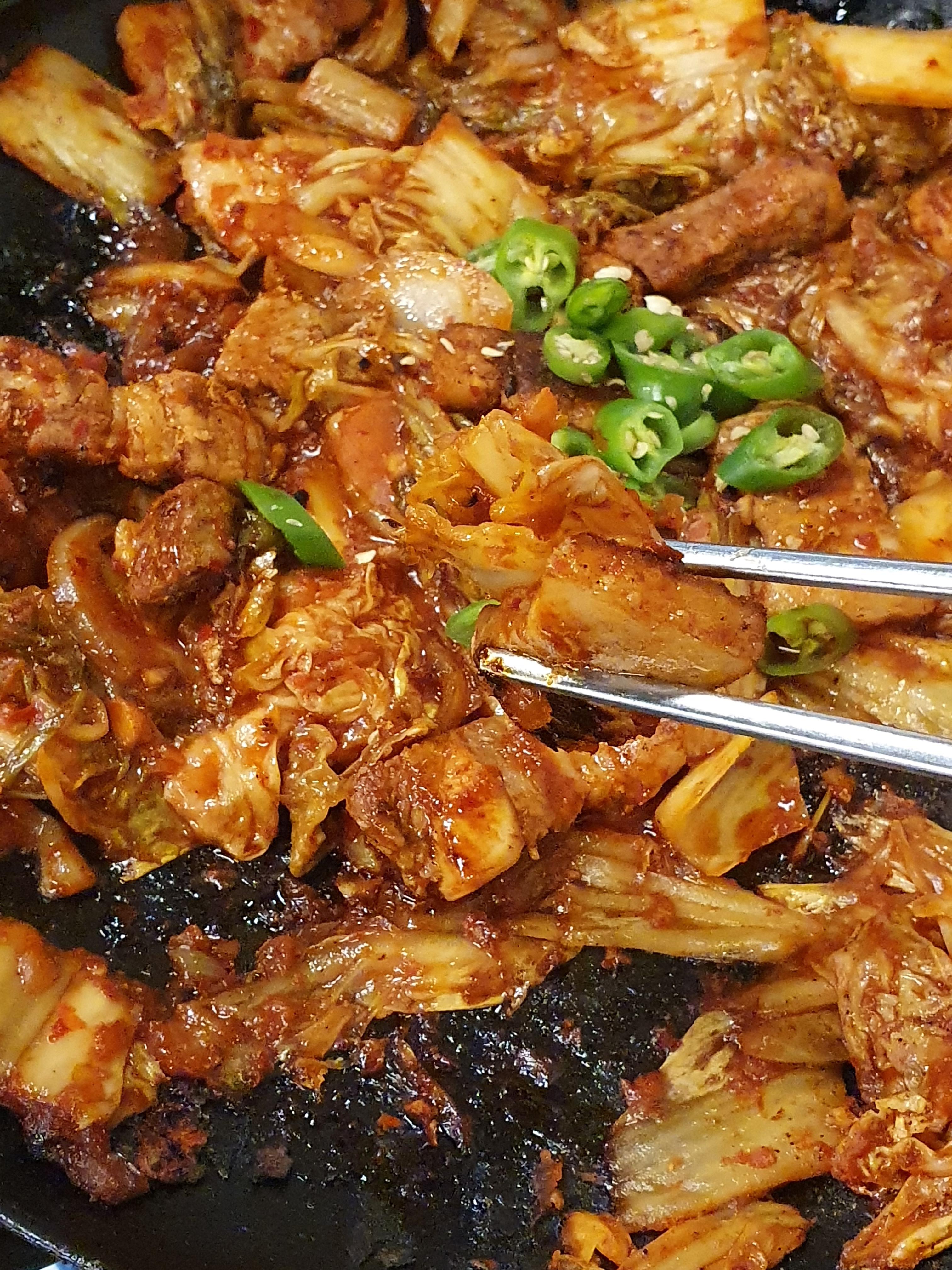 돼지고기김치구이는 삼겹살과 김치를 적당히 볶아서 나온 음식입니다.
