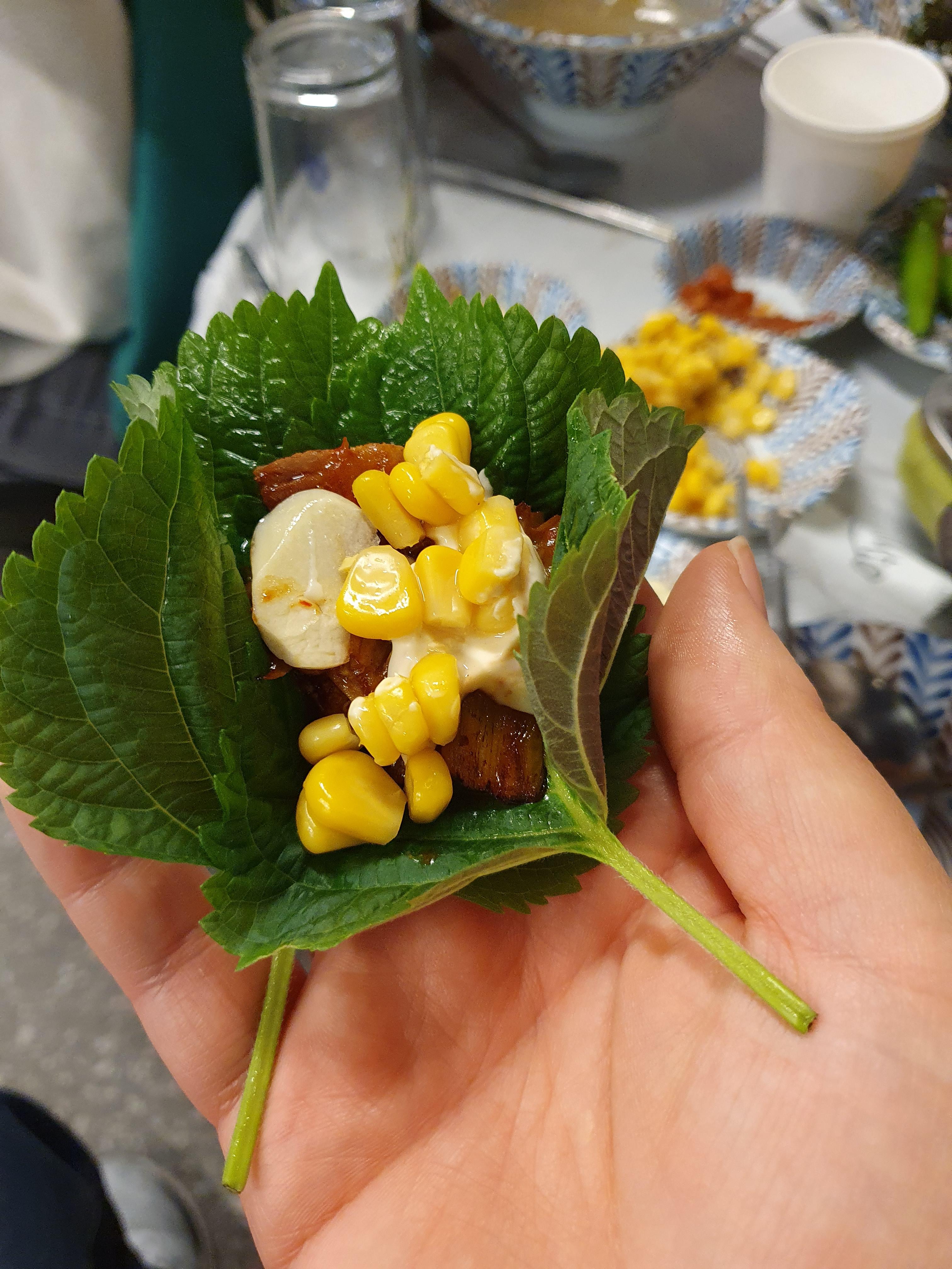 돼지고기, 김치, 마요네즈, 마늘, 옥수수콘을 깻잎쌈에 넣고 먹었습니다.
