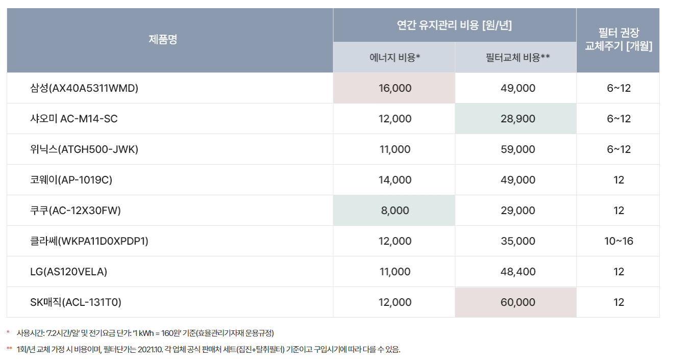 : 제품별로 최대 2배가 차이나는 경우가 있었스며, 공기청정기는 주기적인 필터교체가 요구되기 때문에, 구입가격도 중요하지만, 전기사용량와 필터교체비용도 고려해야하는게 중요하다.
