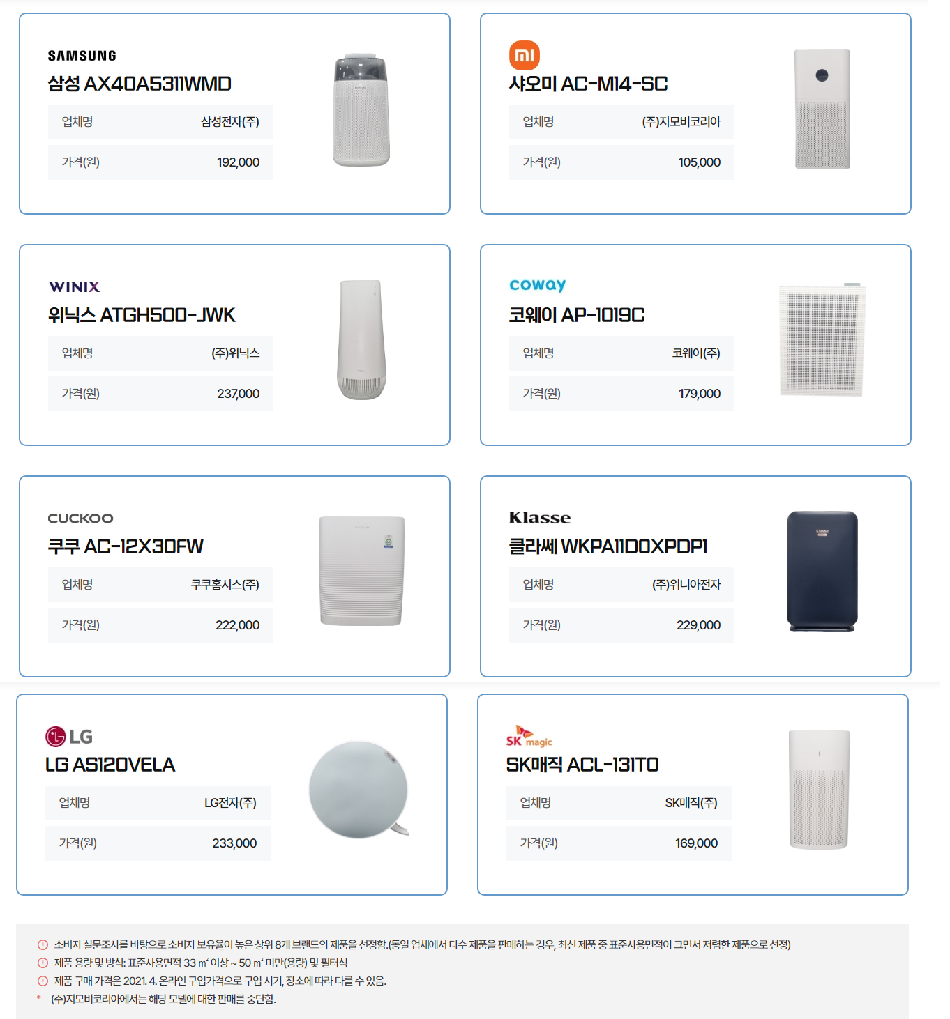 해당되는 제품은 삼성, 위닉스, 코웨이 쿠쿠, 클라쎄, 엘지 제품이였다.