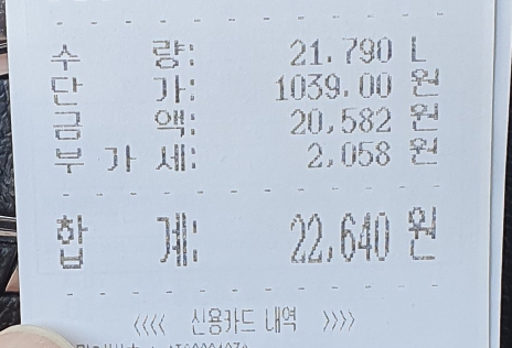 실제 충전한 양은 21.79리터가 들어갔습니다.