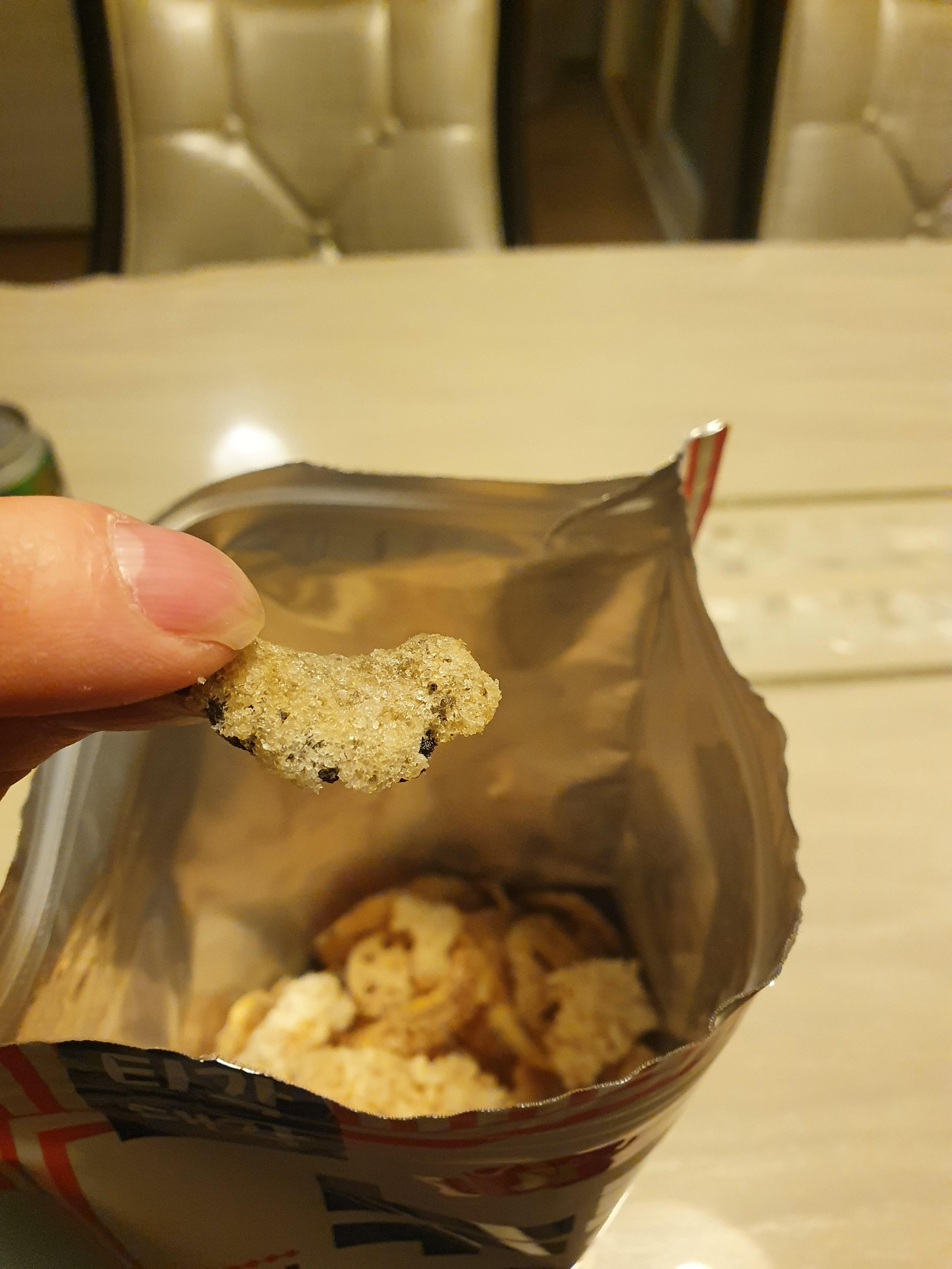 누룽지 부각스 봉지를 개봉합니다.
