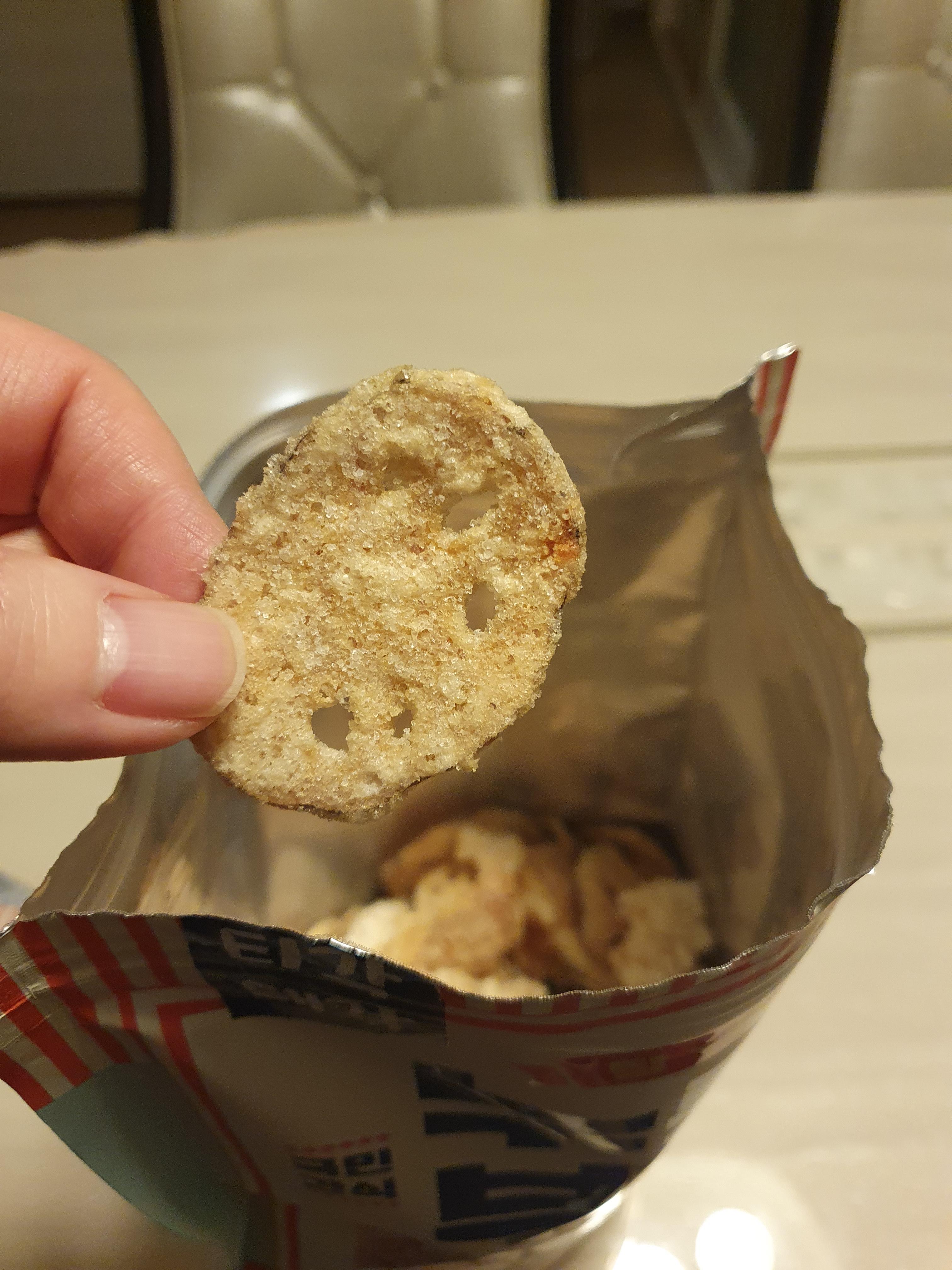 바로 연근 부각입니다. 표면에 반짝거리는 결정들이 보이죠?