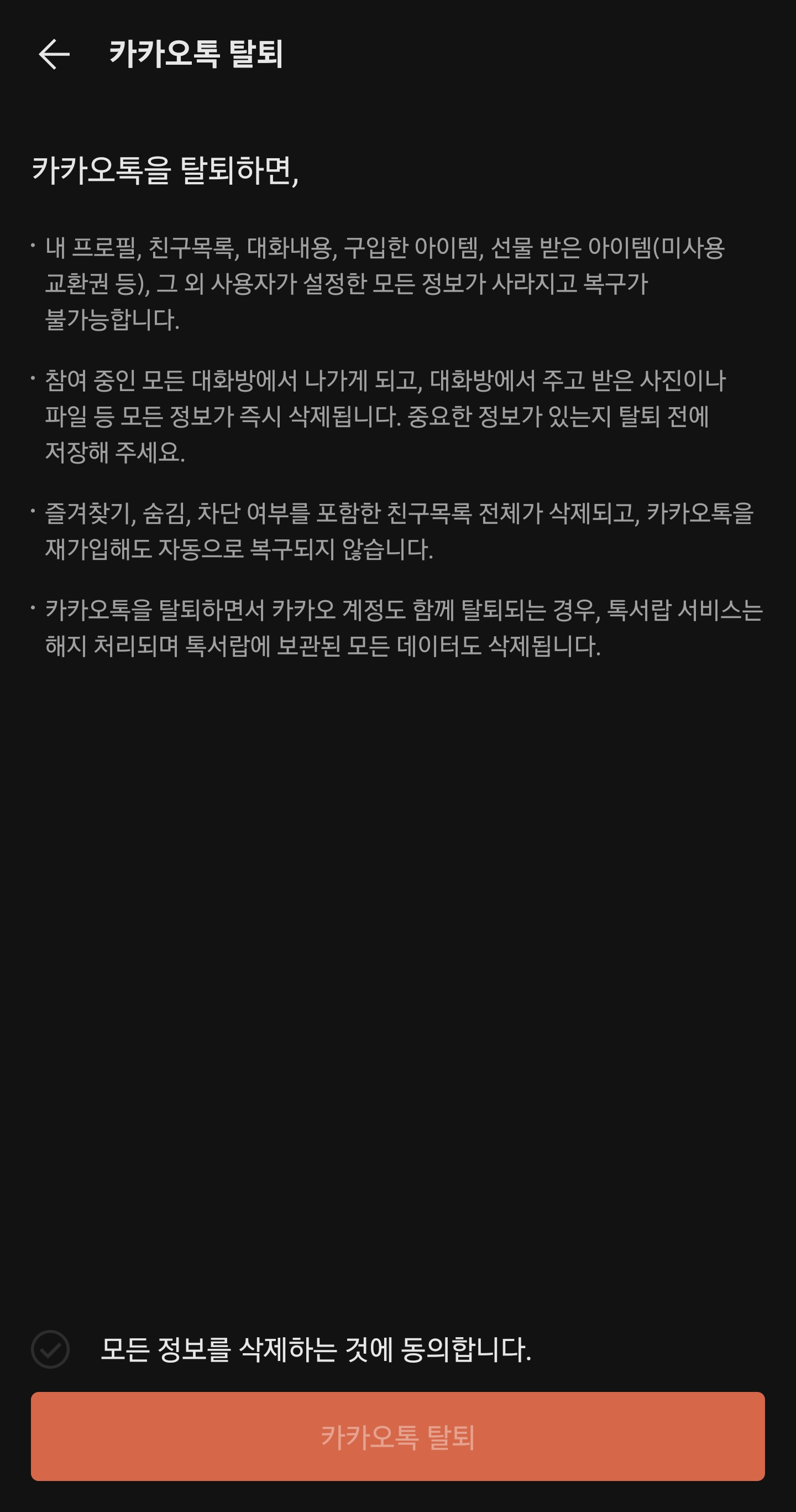 6. 여기서 "카카오톡 탈퇴"를 선택합니다.