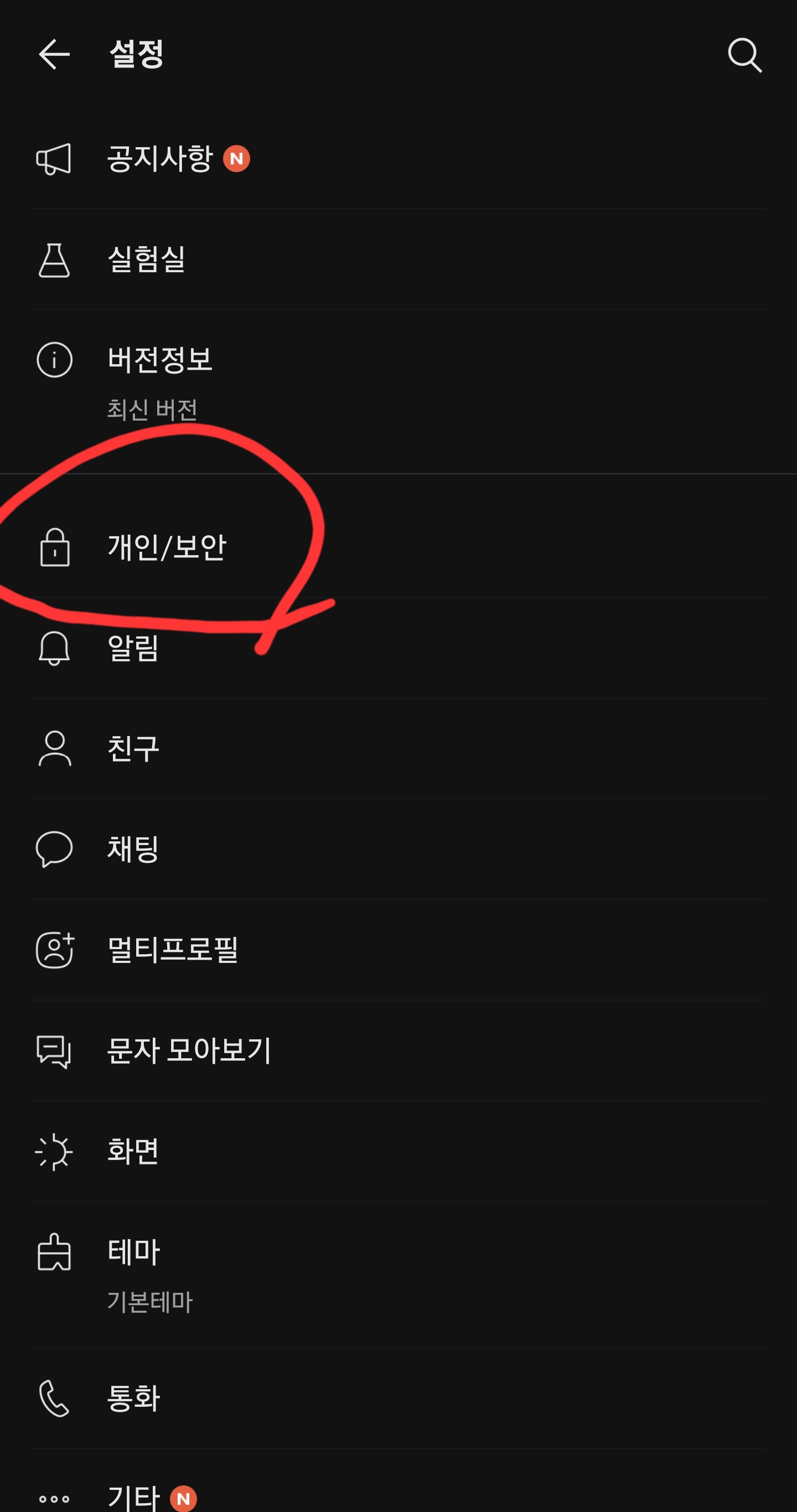 4. 그럼 설정 메뉴에서 개인/보안을 선택합니다.
