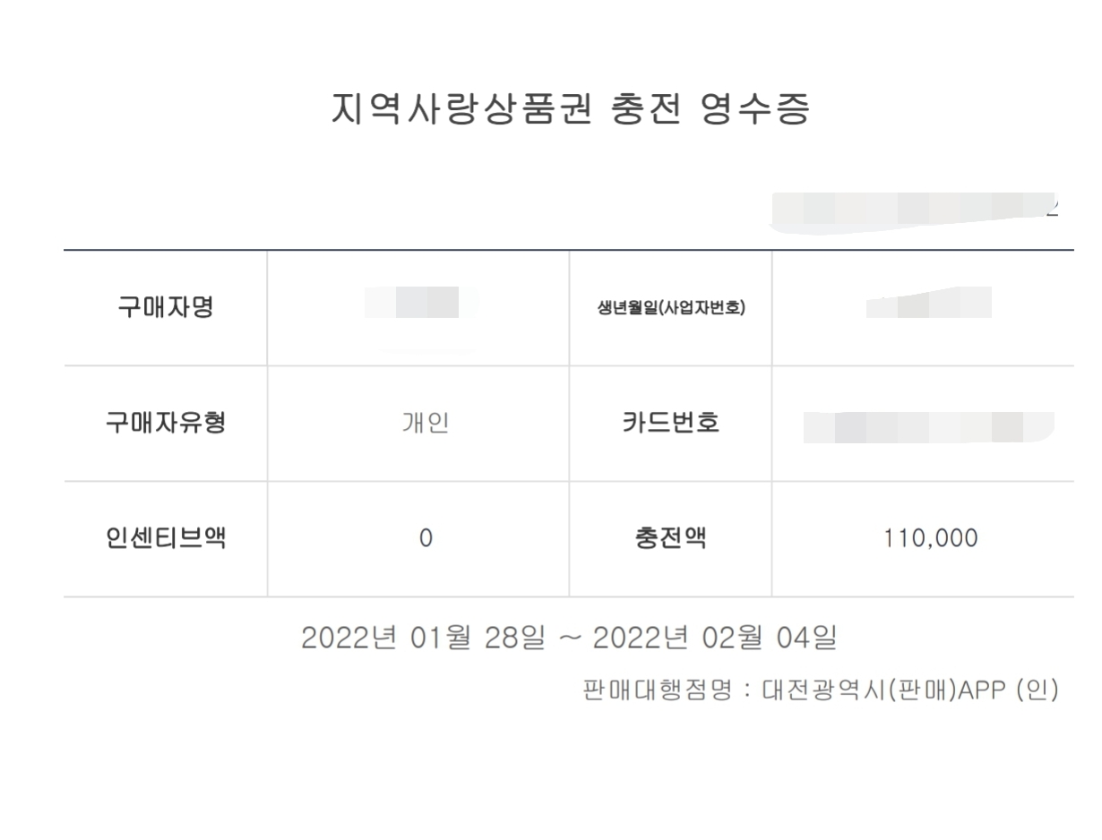그래서 저도 대전 지역에 살고 있어 대전 지역화폐 온통대전 충전액 영수증을 발급받았습니다.
