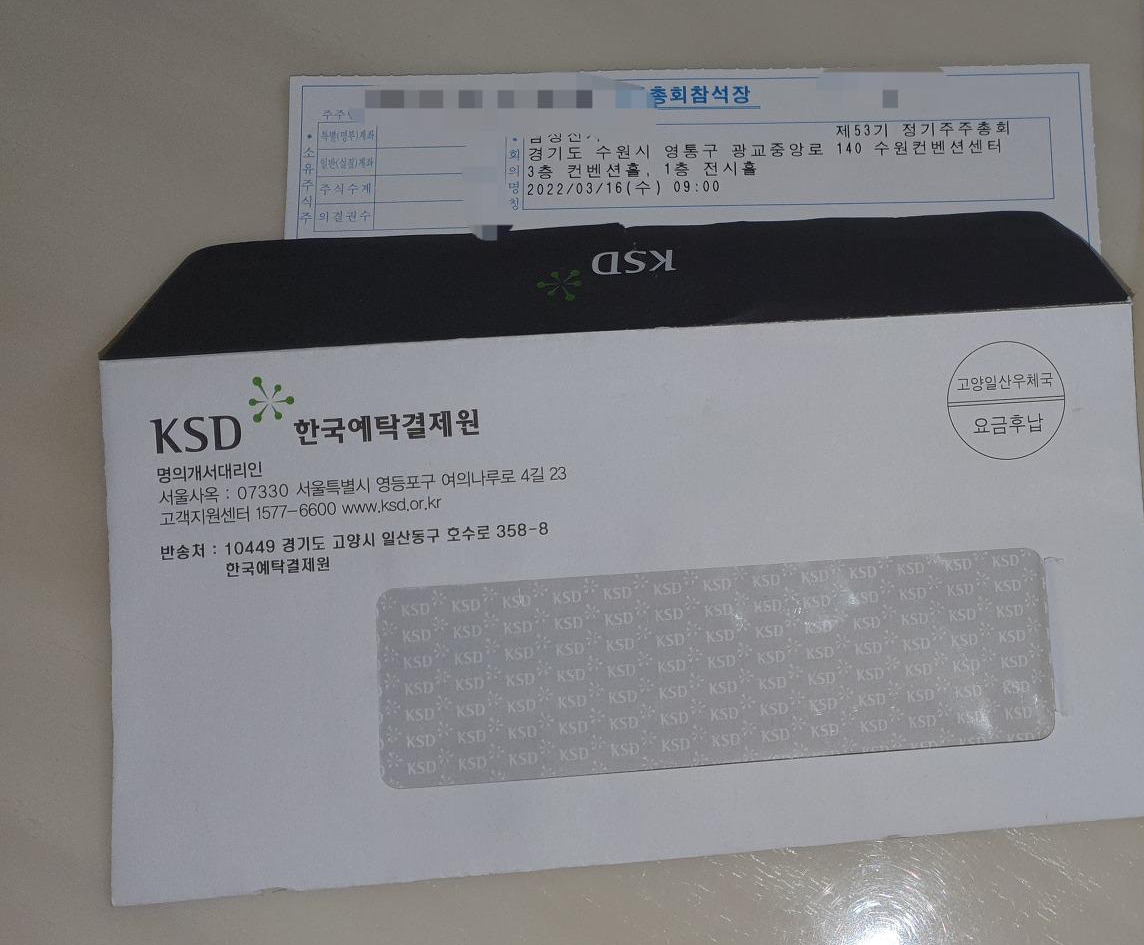 한국예탁결제원에서 제53기 정기 주주총회가 열린다는 안내문과 참석장을 받게 되었습니다.