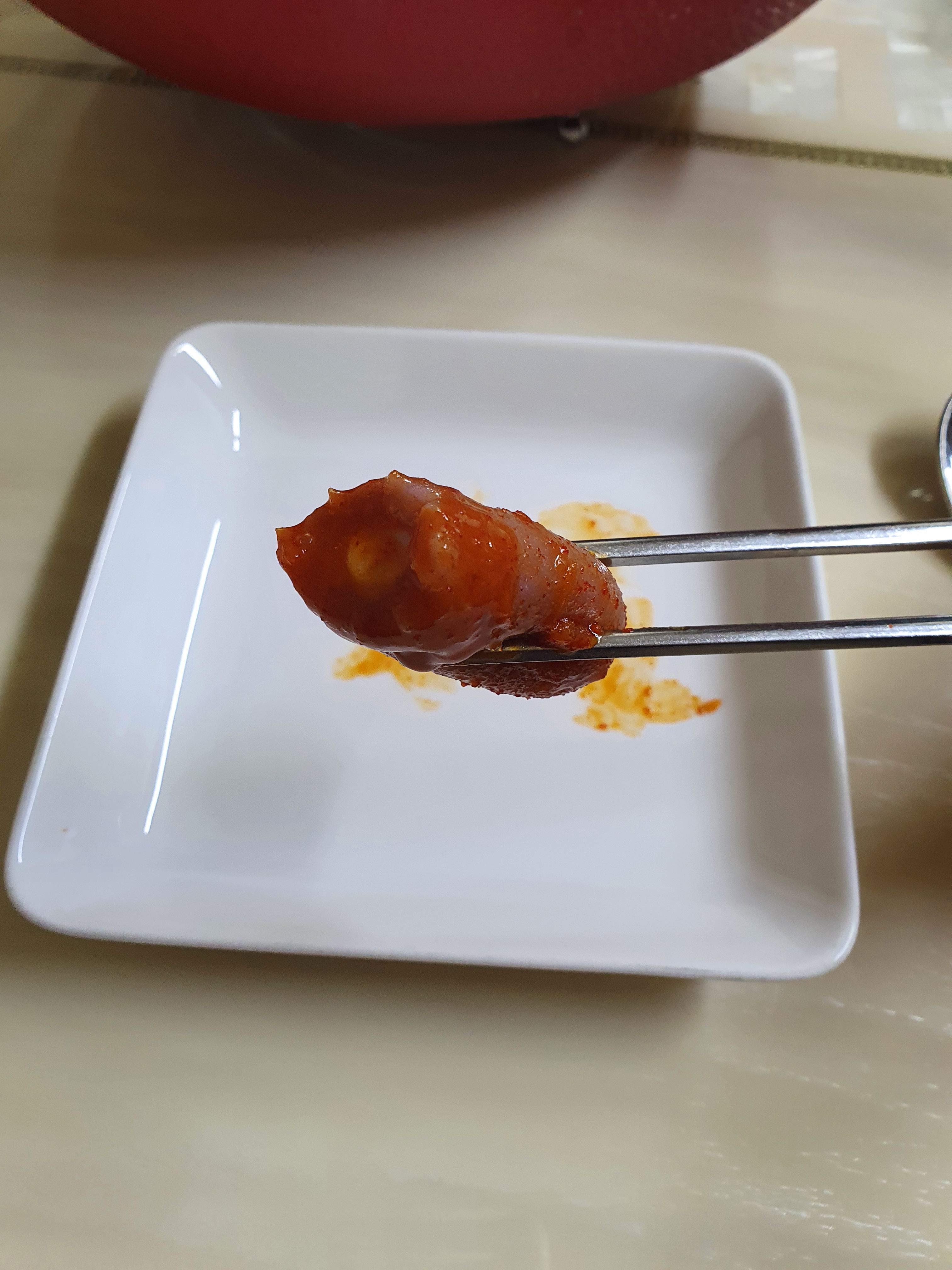 양념장 맛은 생각보다 매콤합니다. 그리고 무를 넣어서 만든 떡볶이라서 쪼글쪼글한 무가 양념장에 들어가 있는데..