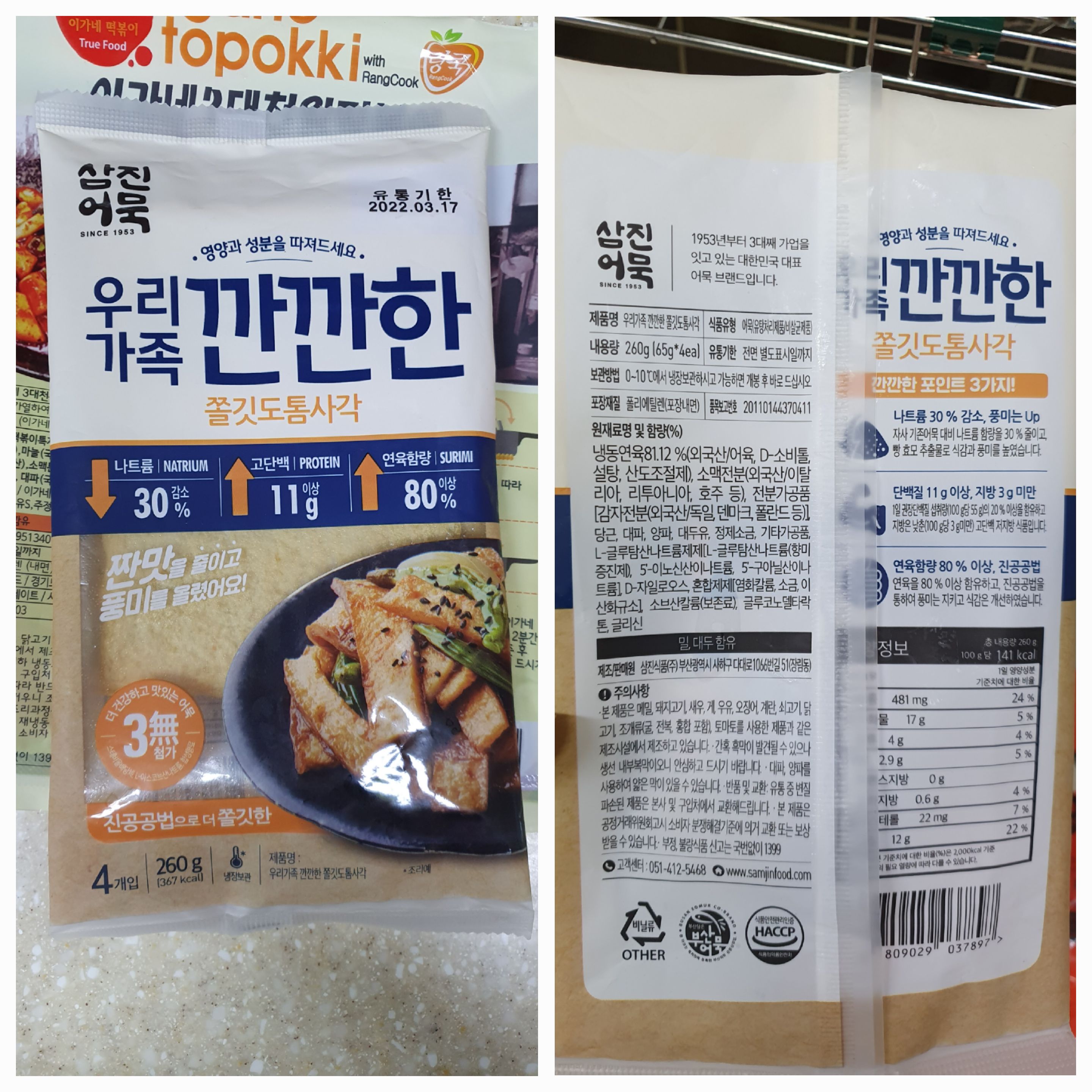 떡볶이는 납작어묵을 넣어야 맛있는데요... 어묵중에서 정말 맛있는 브랜드 삼진어묵 1봉지를 준비하였습니다.
